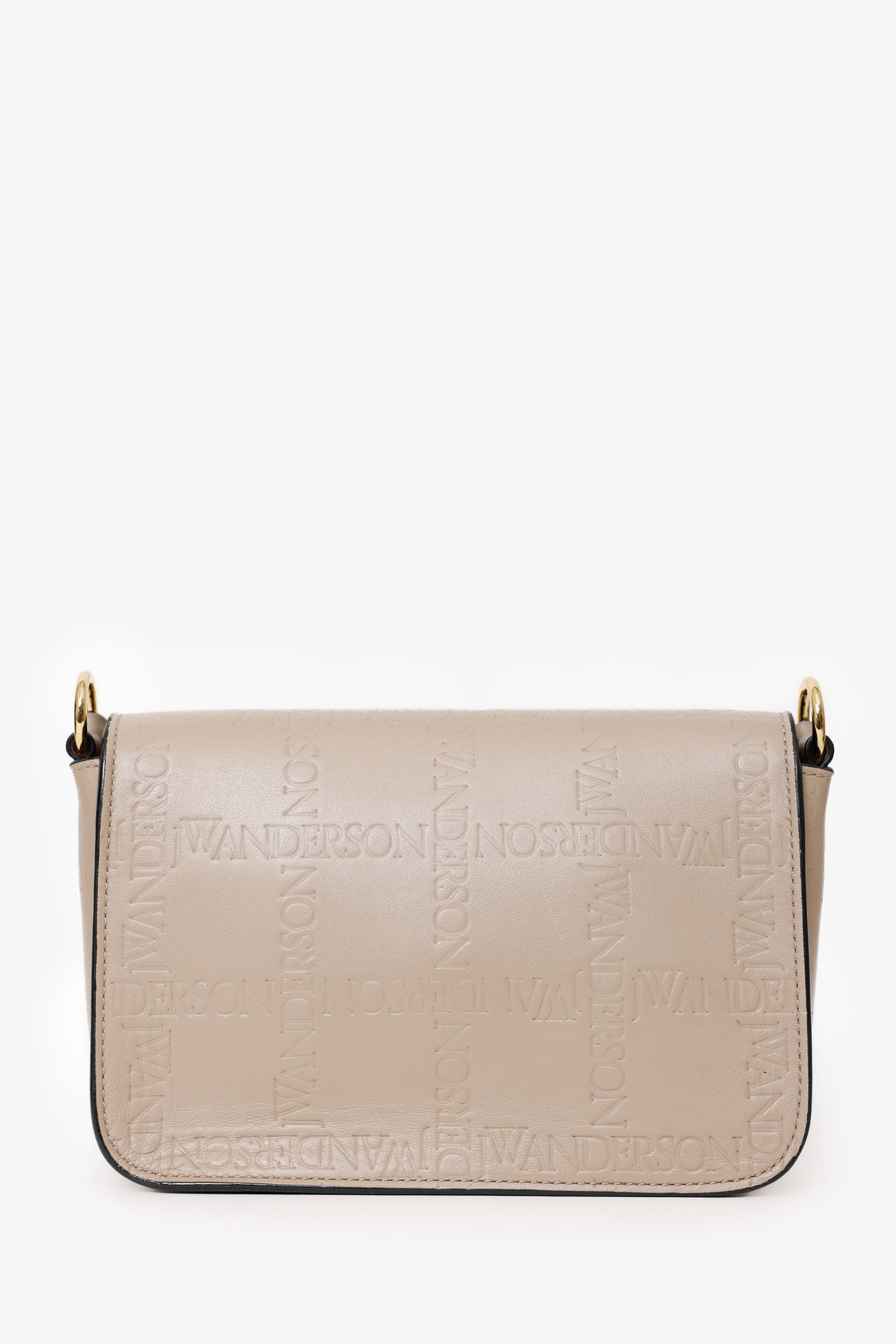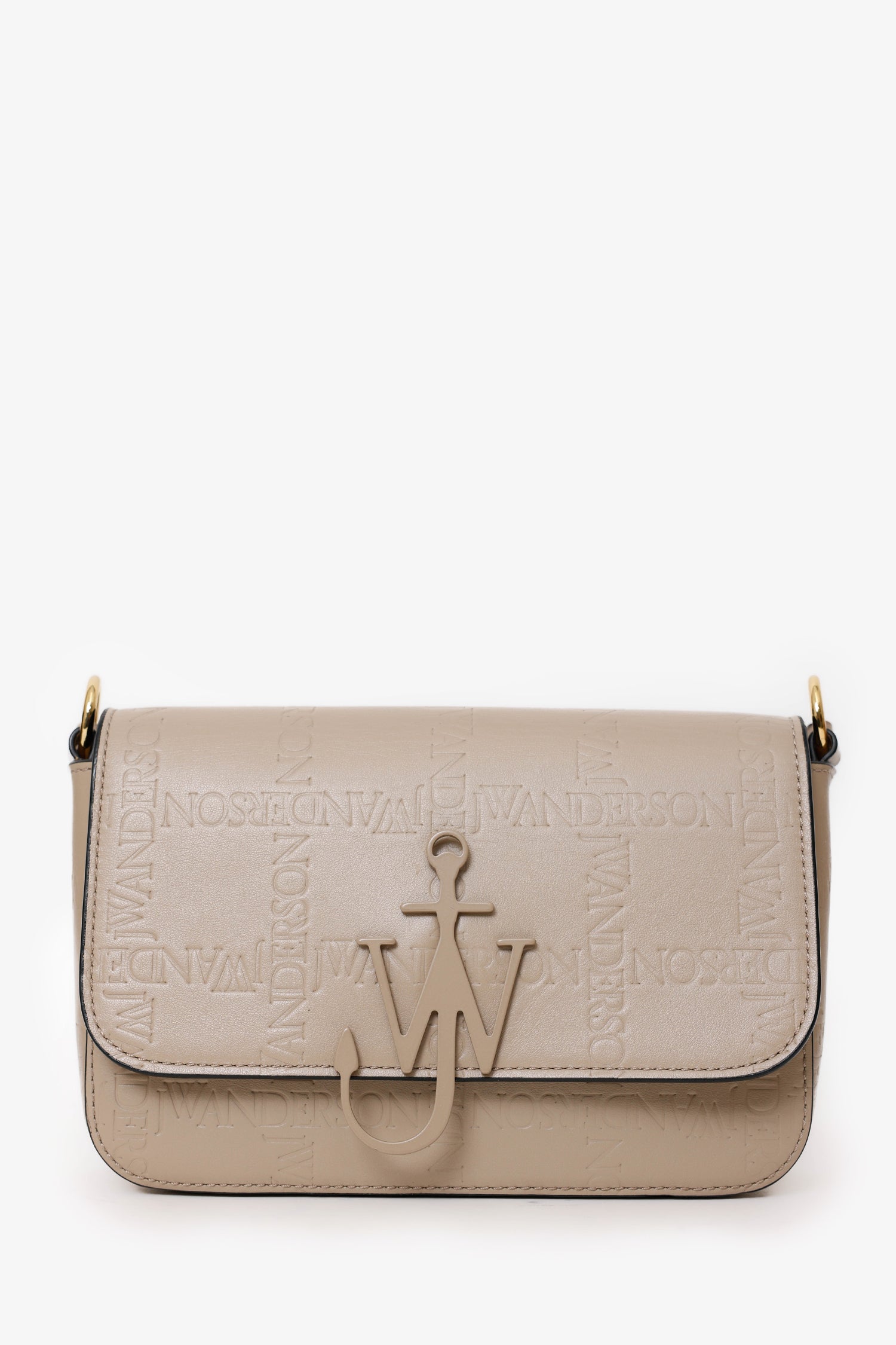 JW Anderson Taupe Leather Midi 'Anchor' Shoulder Bag. Front fold-over flap. Single top handle with magnetic button-up closure. Single adjustable shoulder strap with pull-through push pin closure. Lined interior. Single interior rear wall card slot. Gold-tone hardware. Tonal stitching.