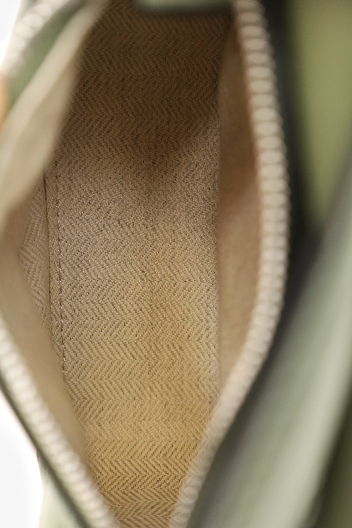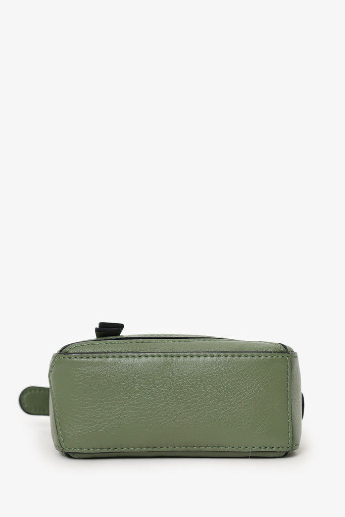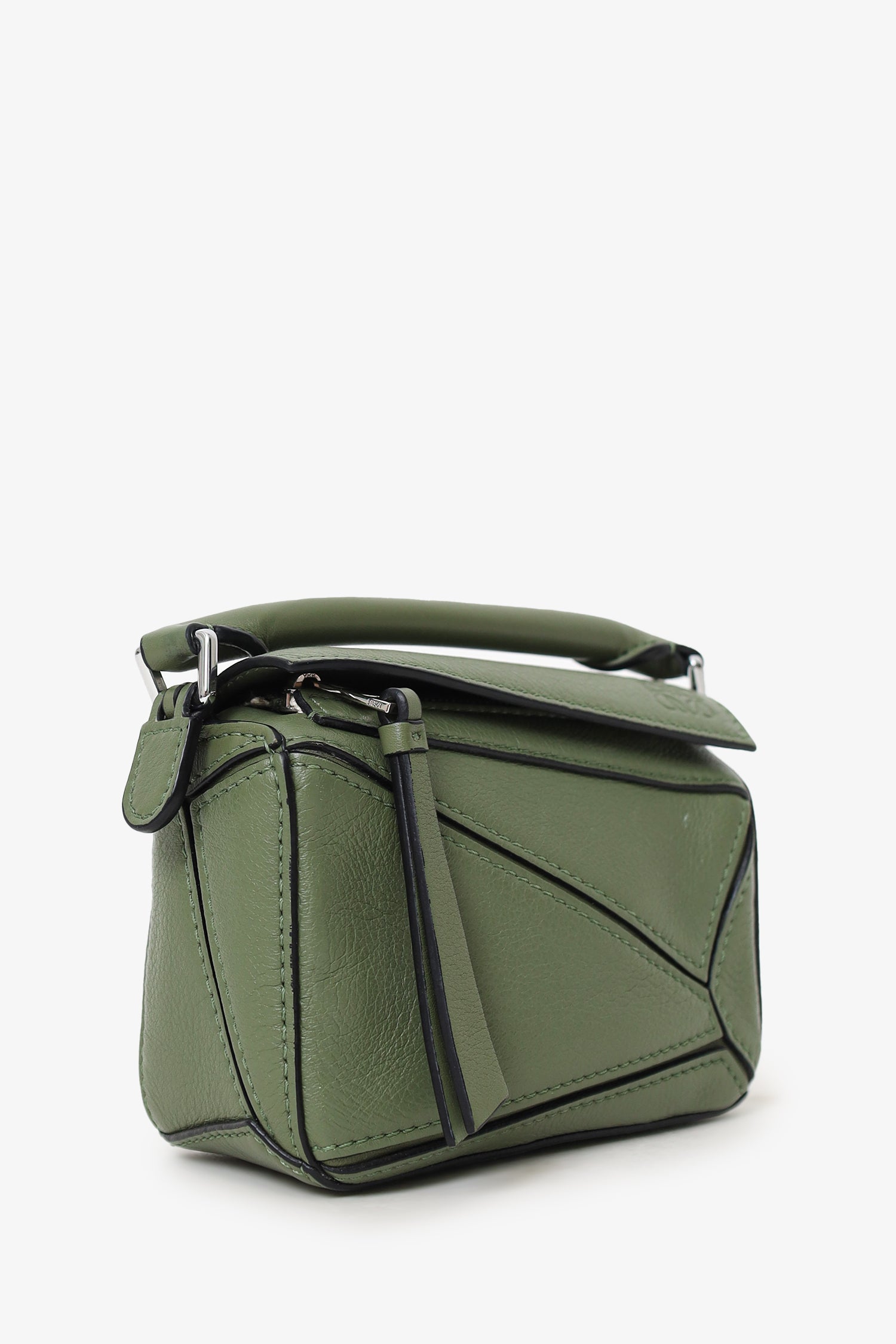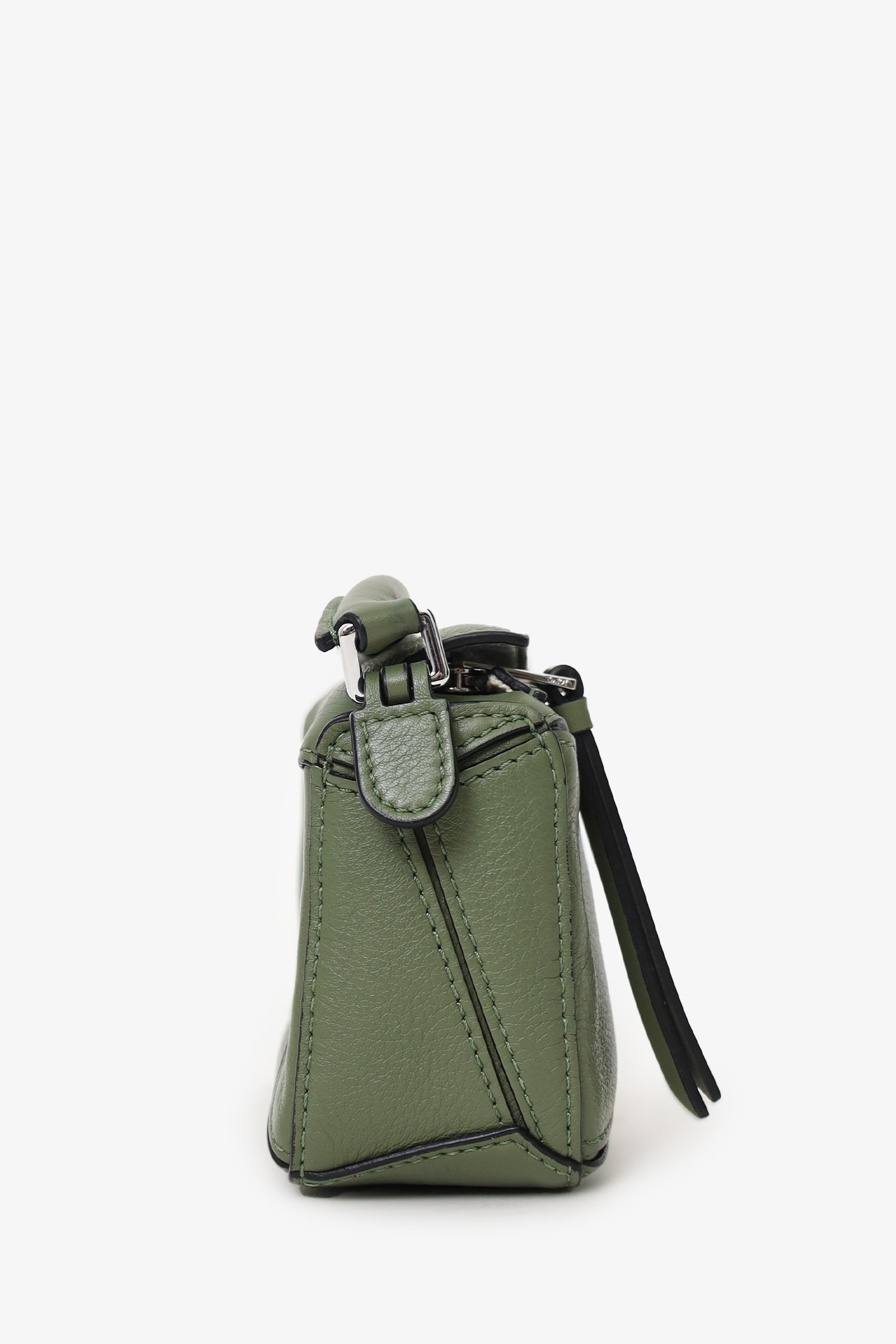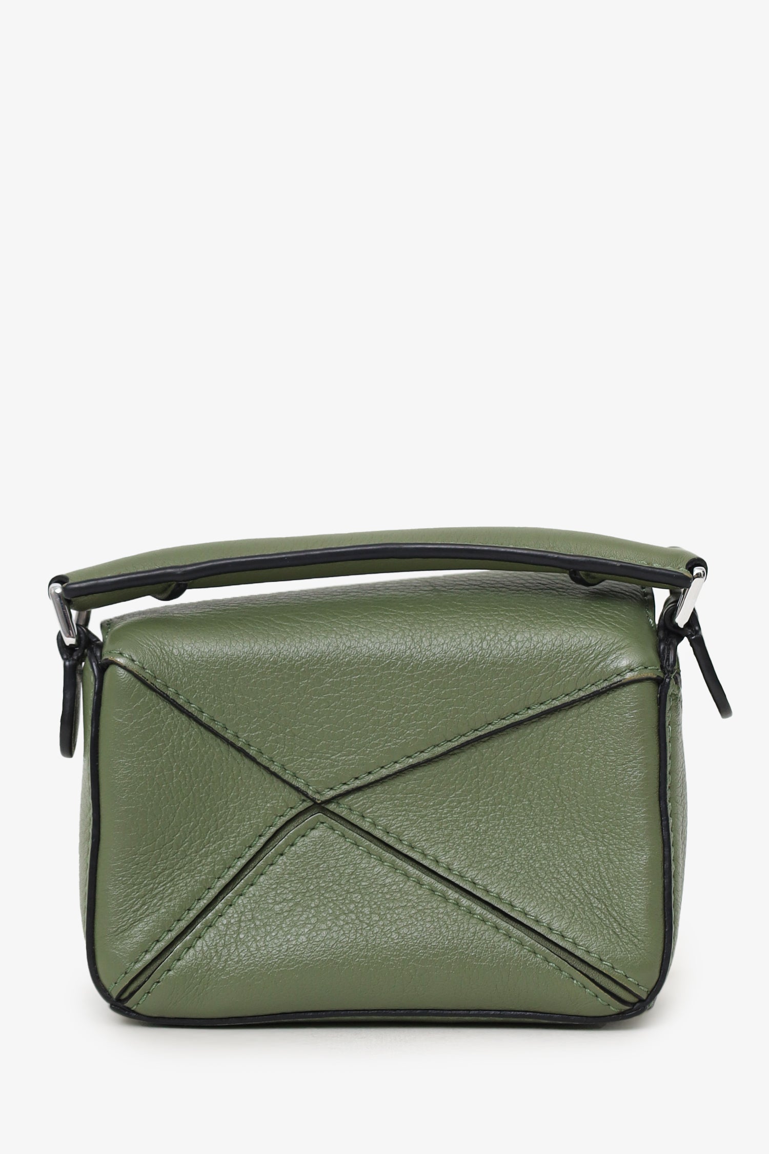 Loewe Green Leather Nano Puzzle Crossbody. Top flap with zip closure. Top handle. Removable chainlink strap. Open canvas-lined interior. Silver-tone hardware. Tonal stitching.