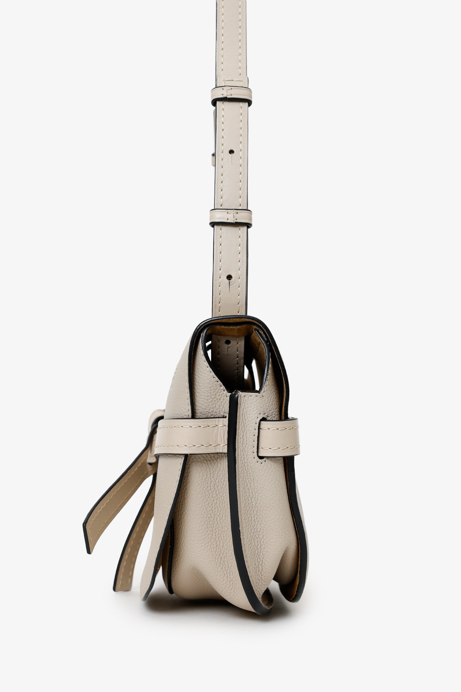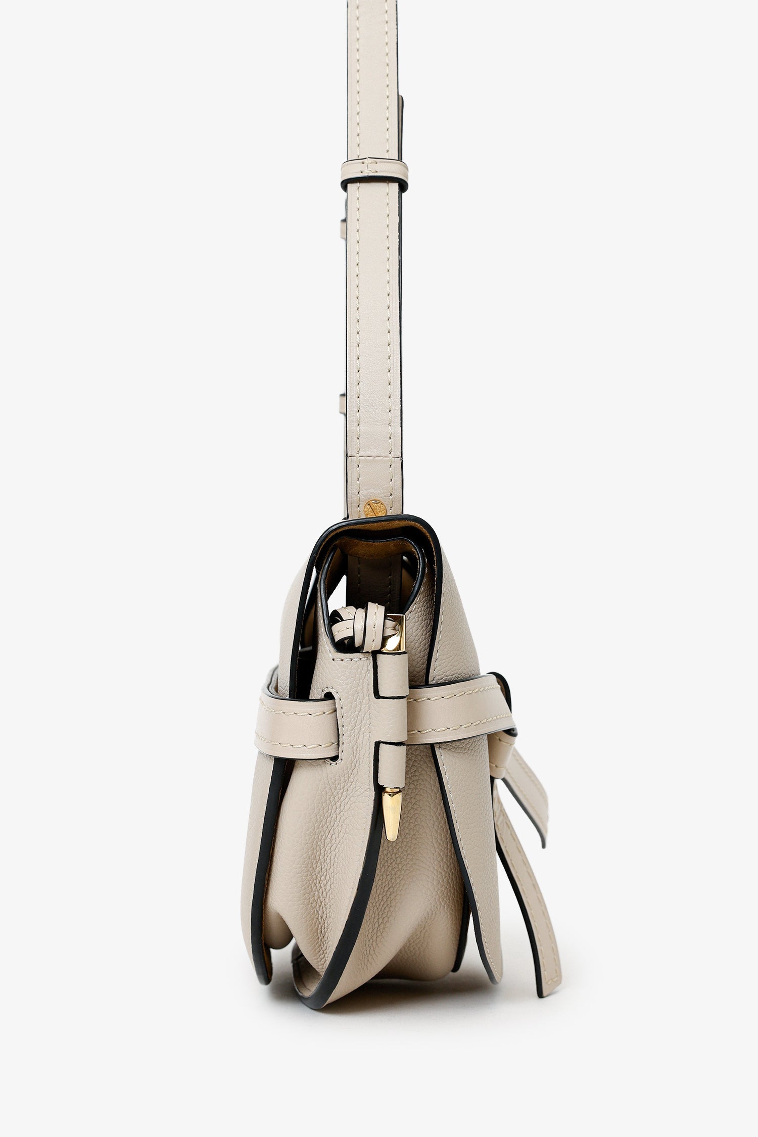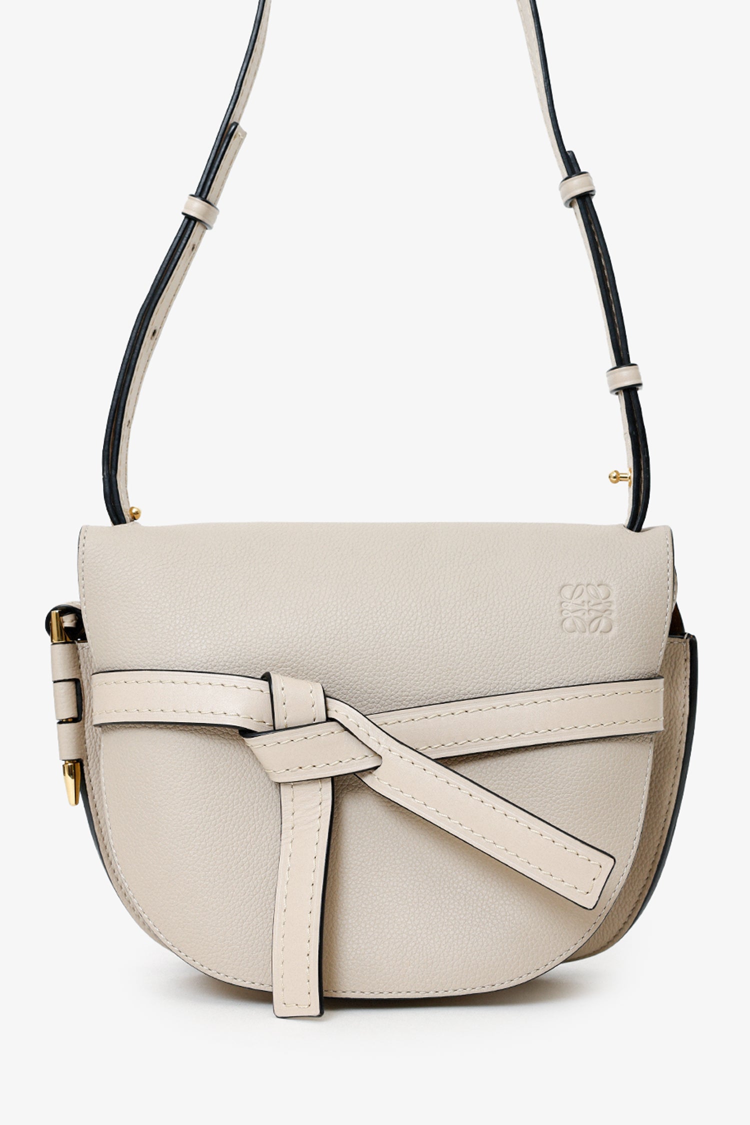 Loewe Light Oat Grained Leather Small Gate Bag. Front fold-over flap with tie closure. Lined-interior with 2 slip pockets. Gold-tone hardware. Tonal stitching.