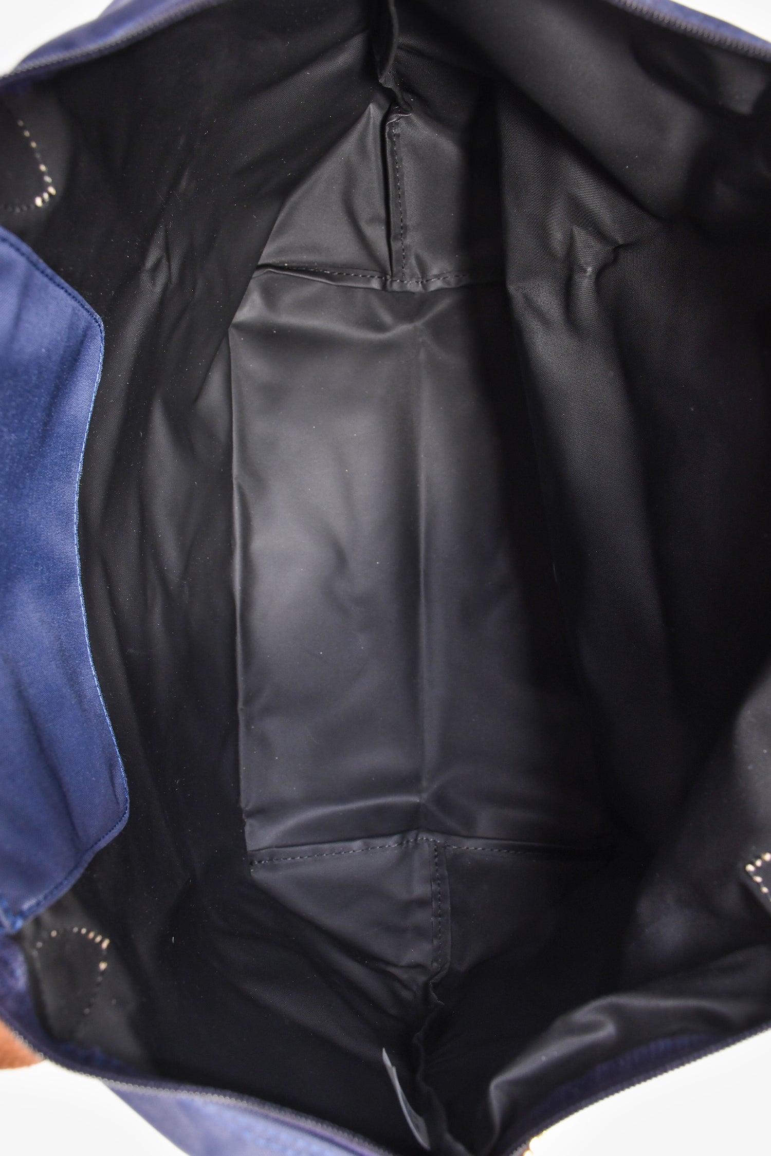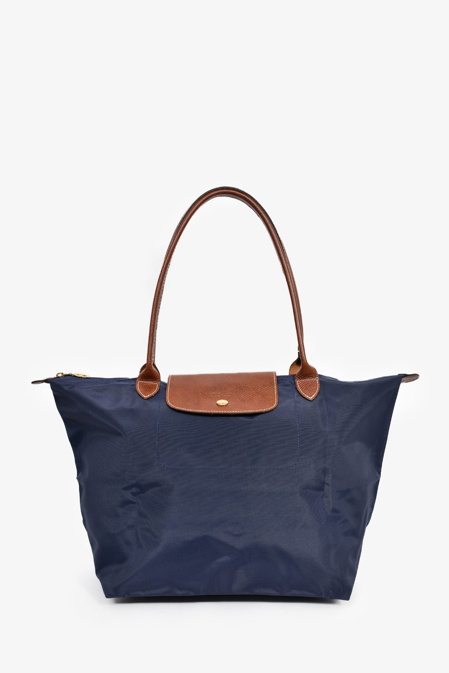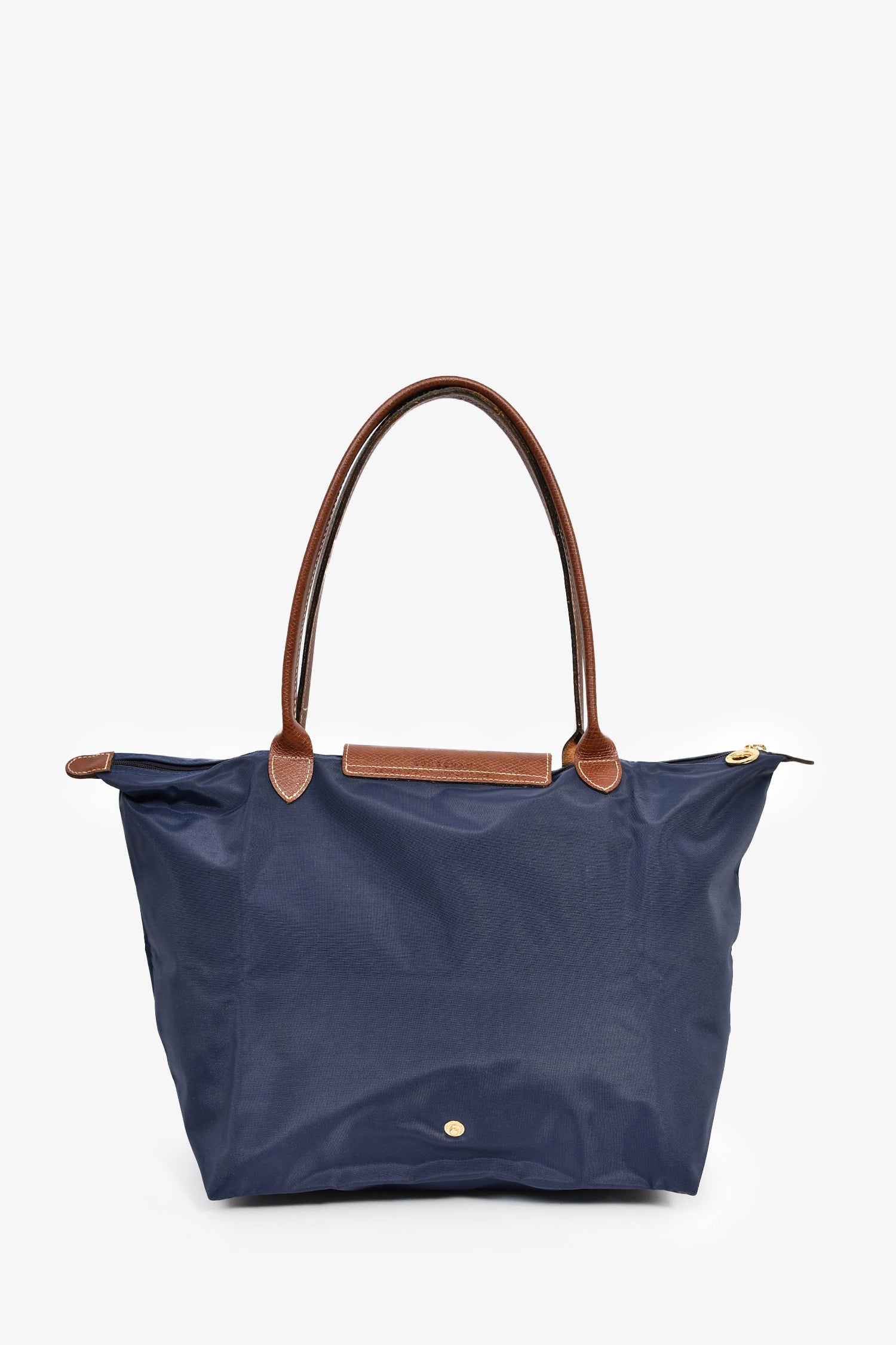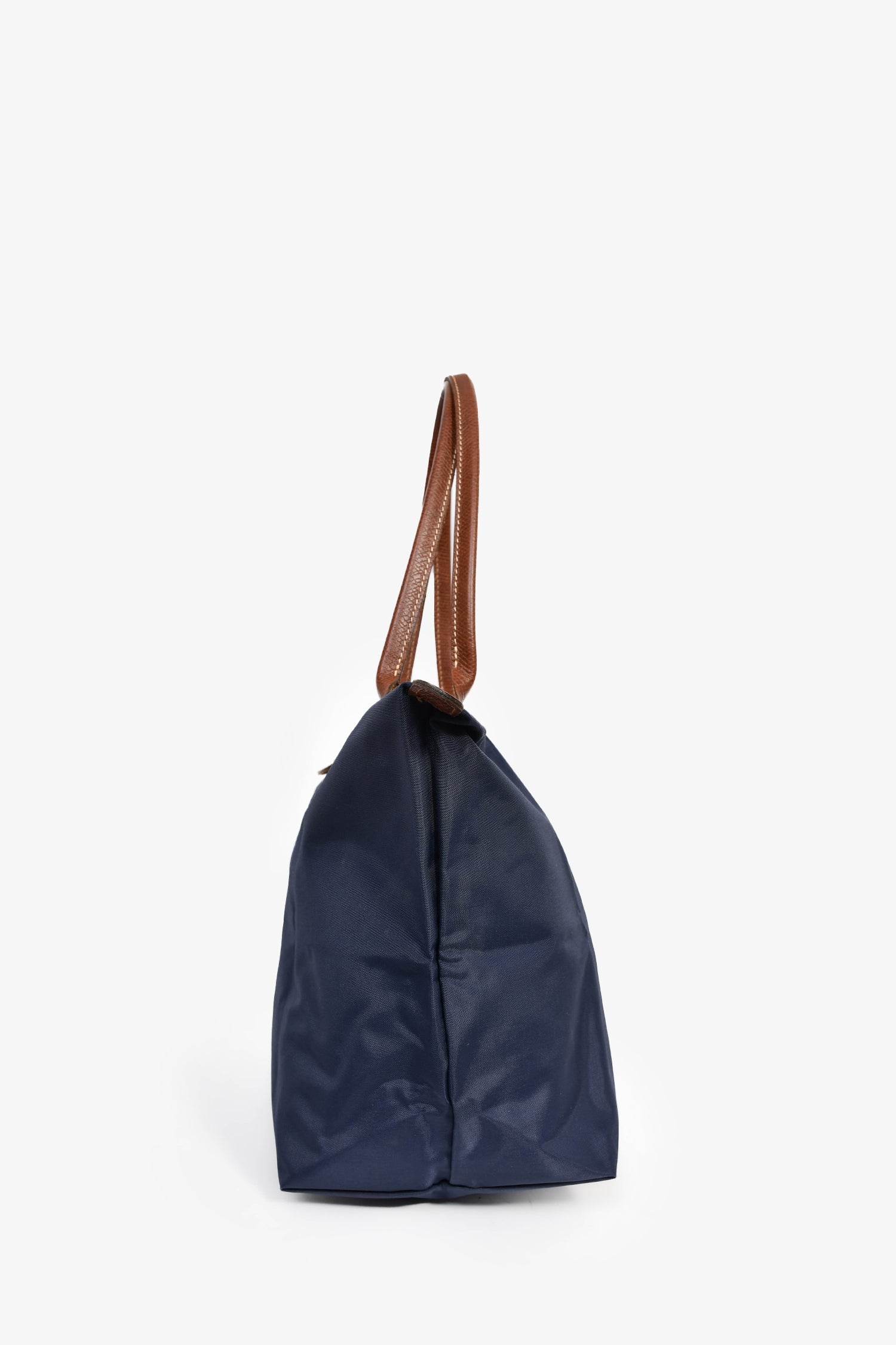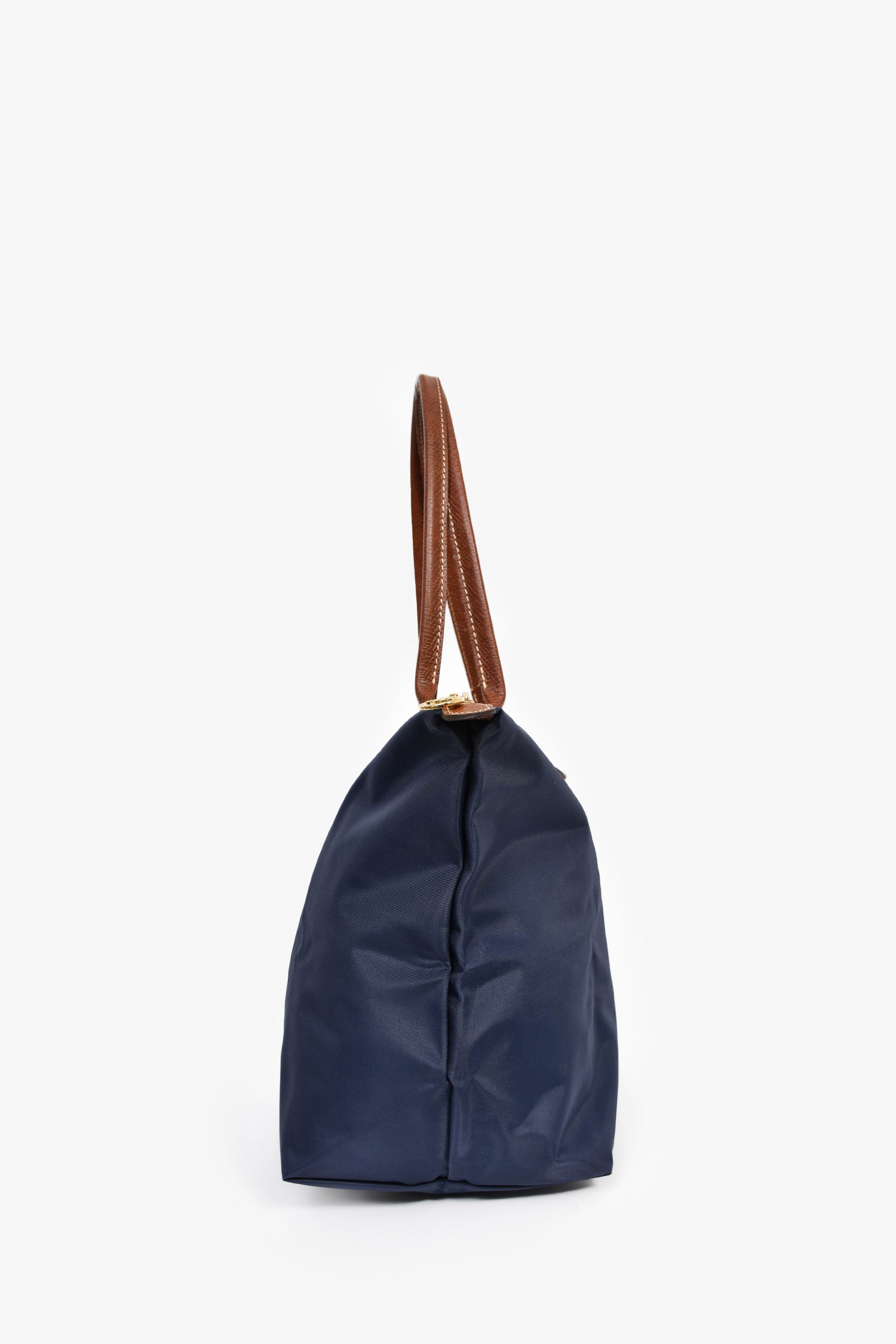 Longchamp Navy 'Le Pliage' Large Tote Bag. 2 rolled top handles. Fold-over strap with a snap closure. Nylon-lined interior. 2 interior compartments: 1 main and 1 slip. Gold-tone hardware. Contrast stitching.