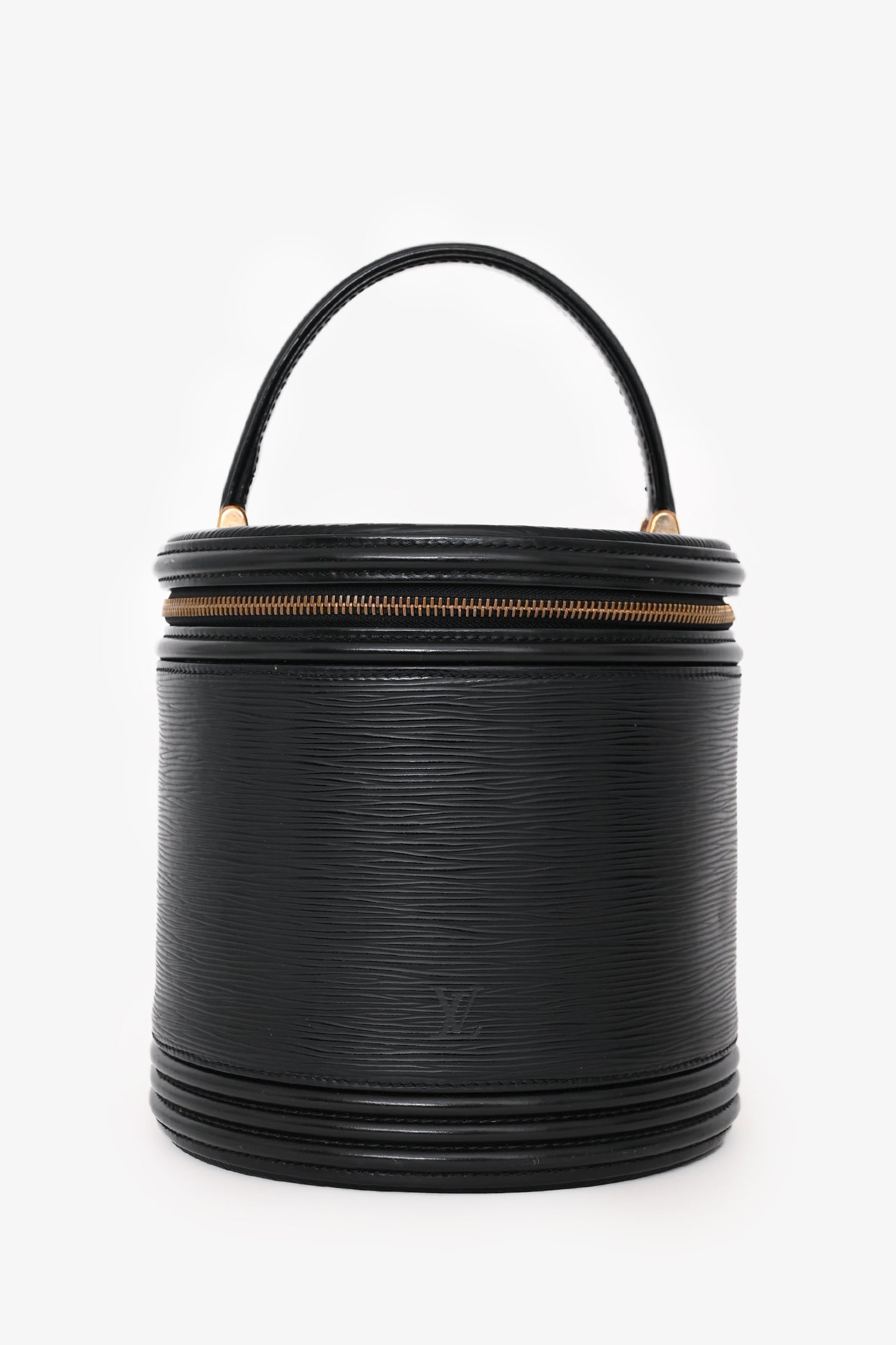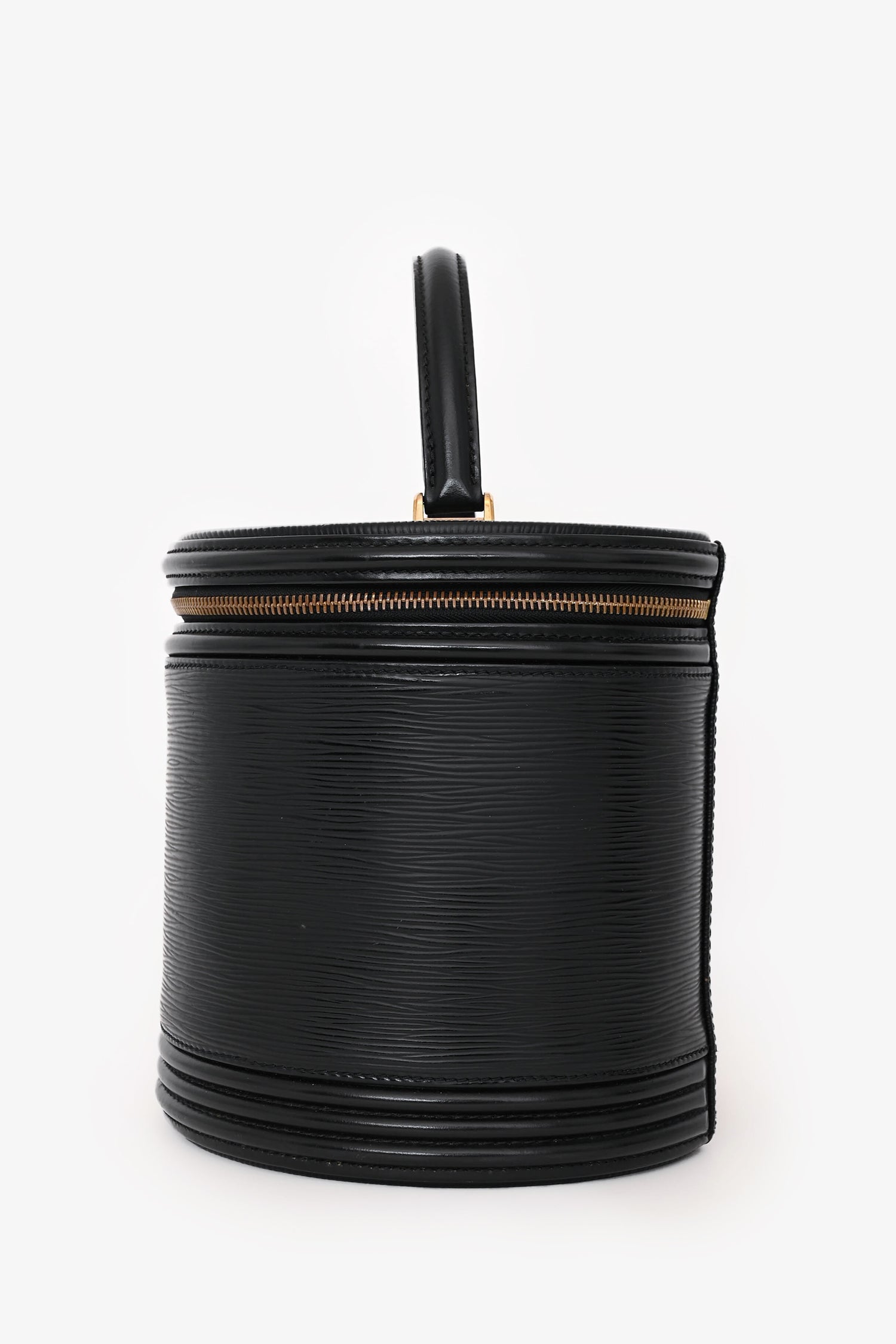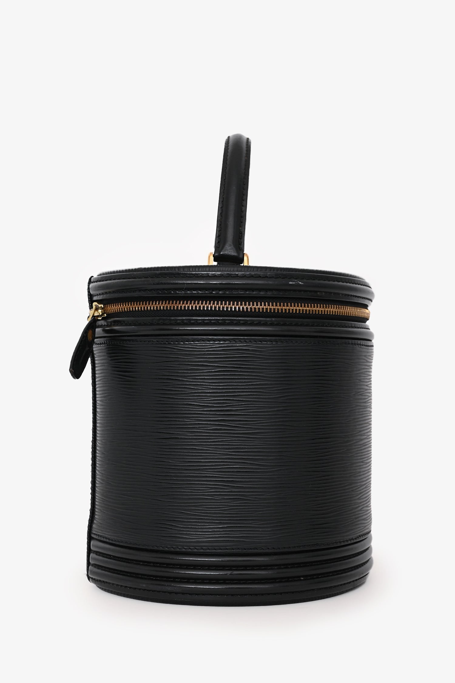 Louis Vuitton 1996 Black Epi Leather “Cannes” Vanity Case Top Handle Bag. Top zip-around closure. 1 interior slip pocket. Suede interior lining. Gold-tone hardware. Tonal stitching.