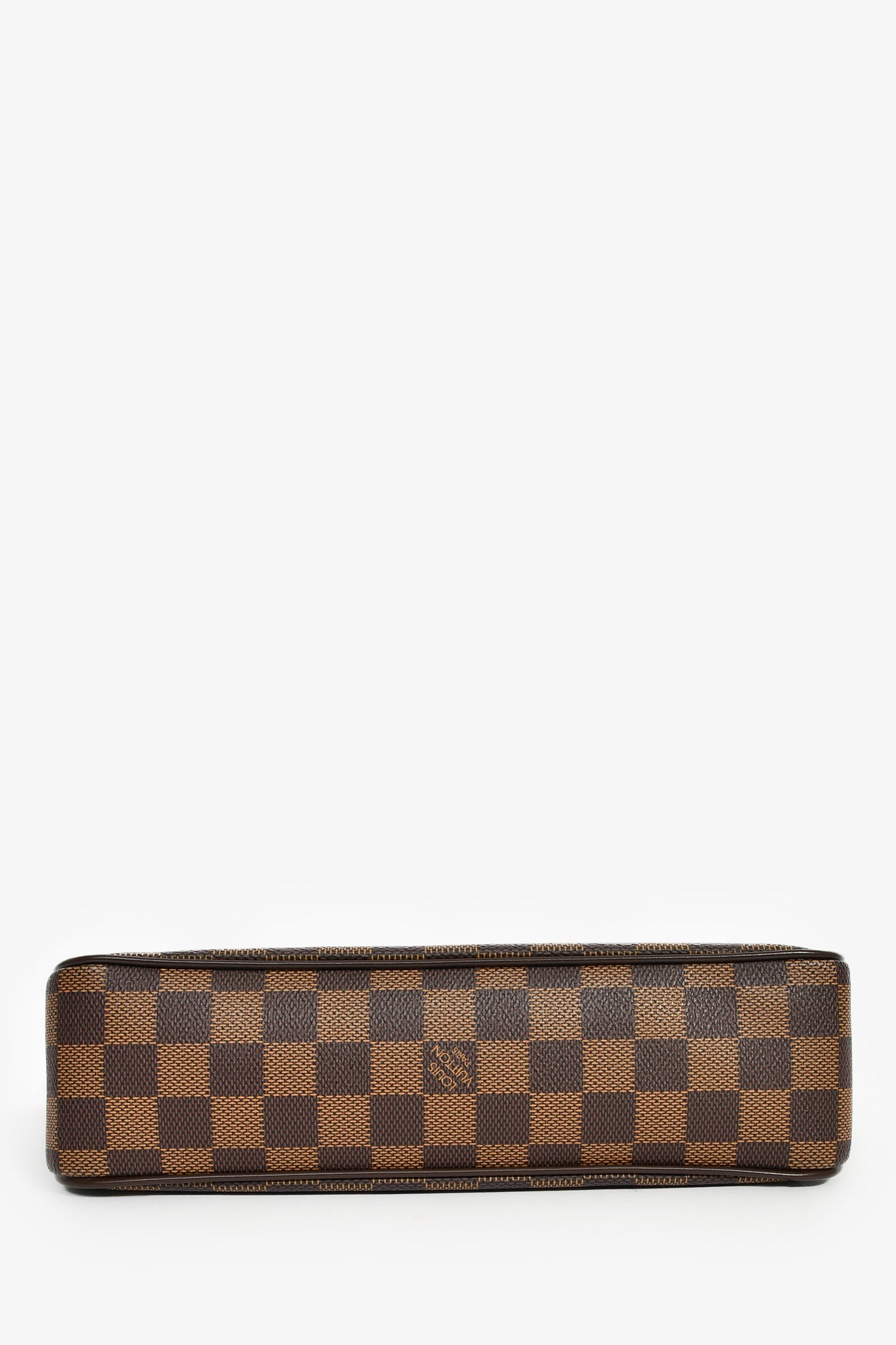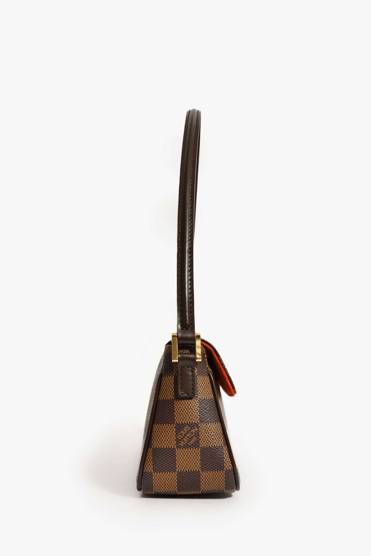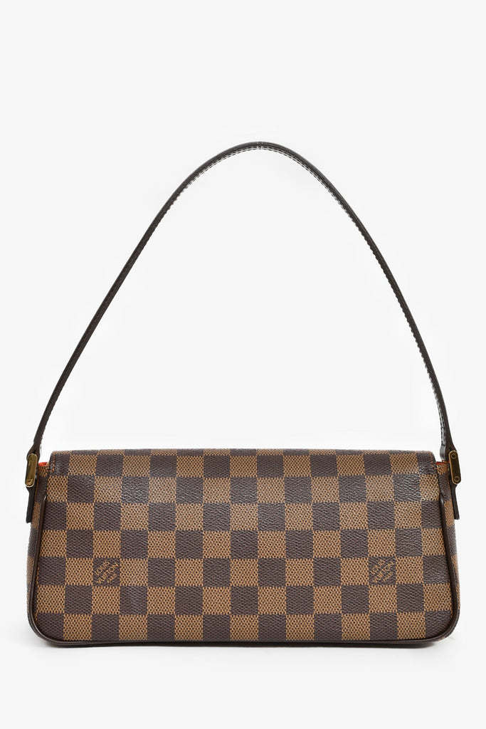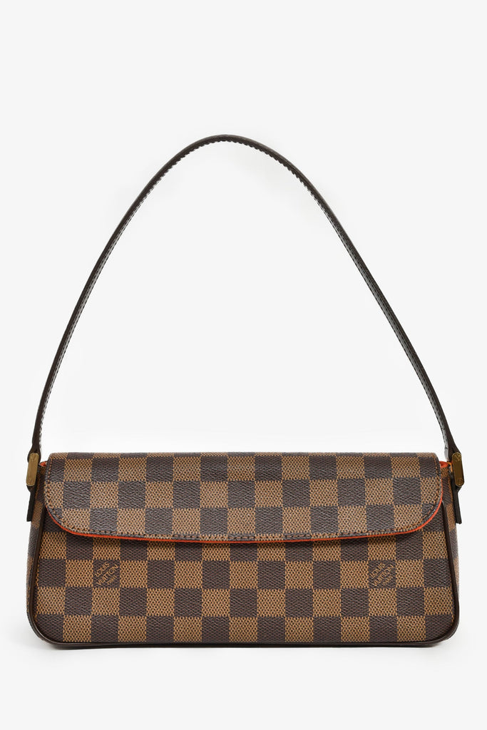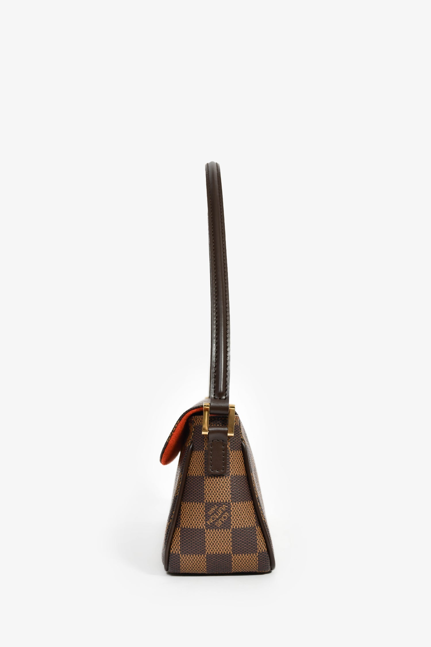 Louis Vuitton 2003 Damier Ebene Recoleta Shoulder Bag. Front fold-over flap with a snap closure. Single shoulder strap. Suede lined interior with a card slot. Gold-tone hardware. Tonal stitching.