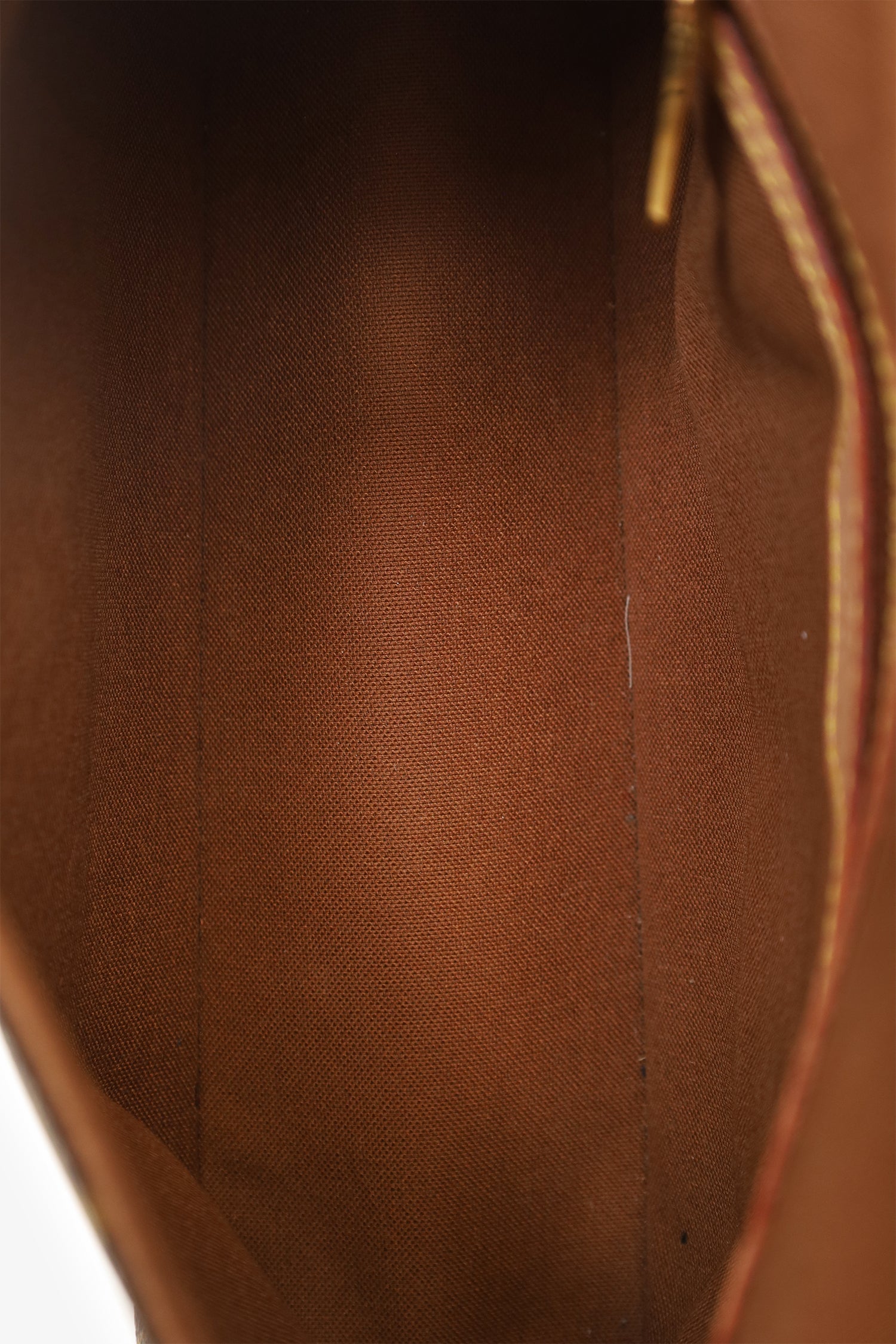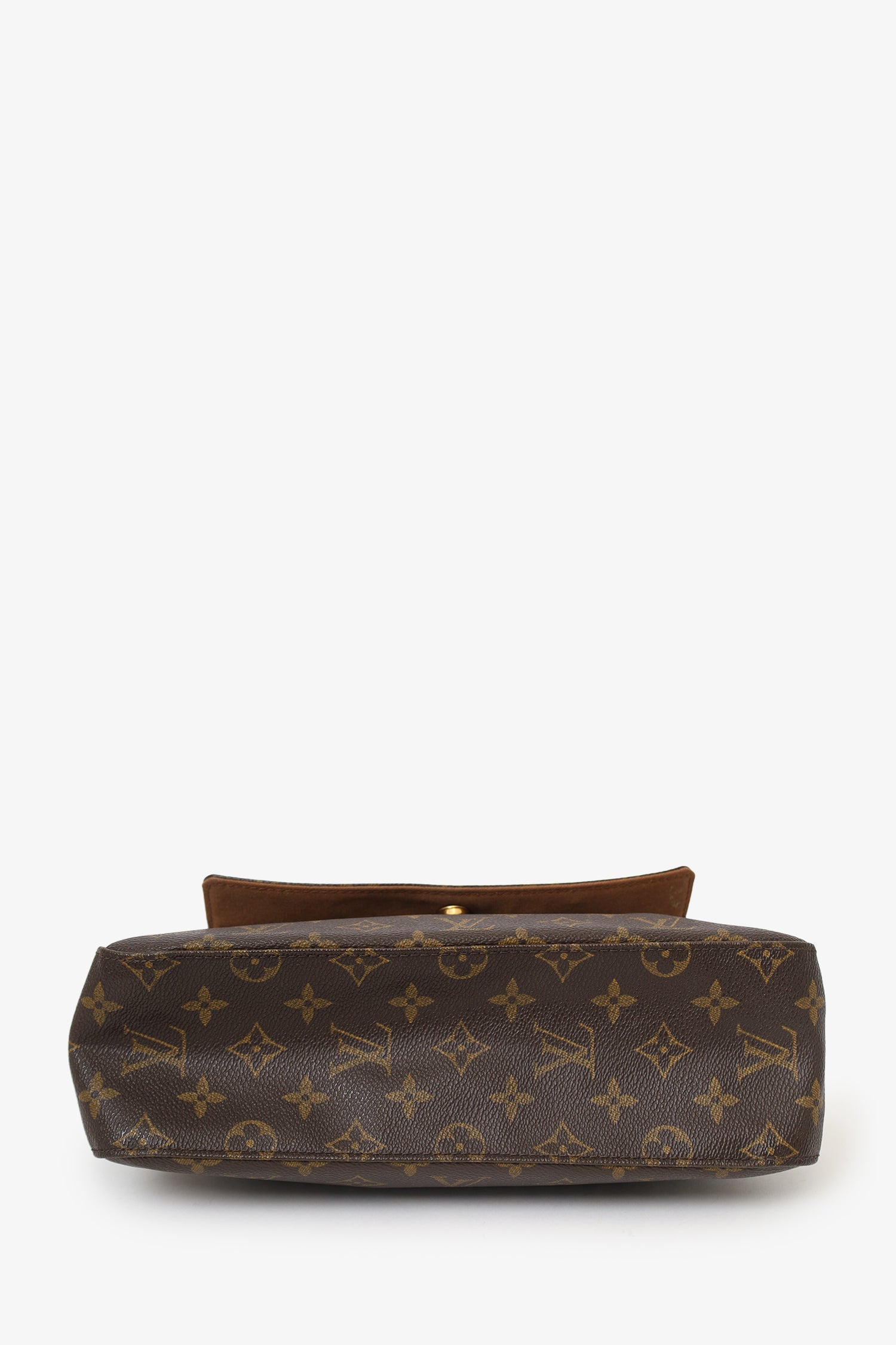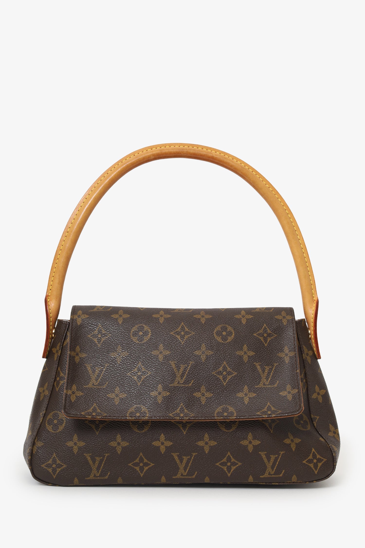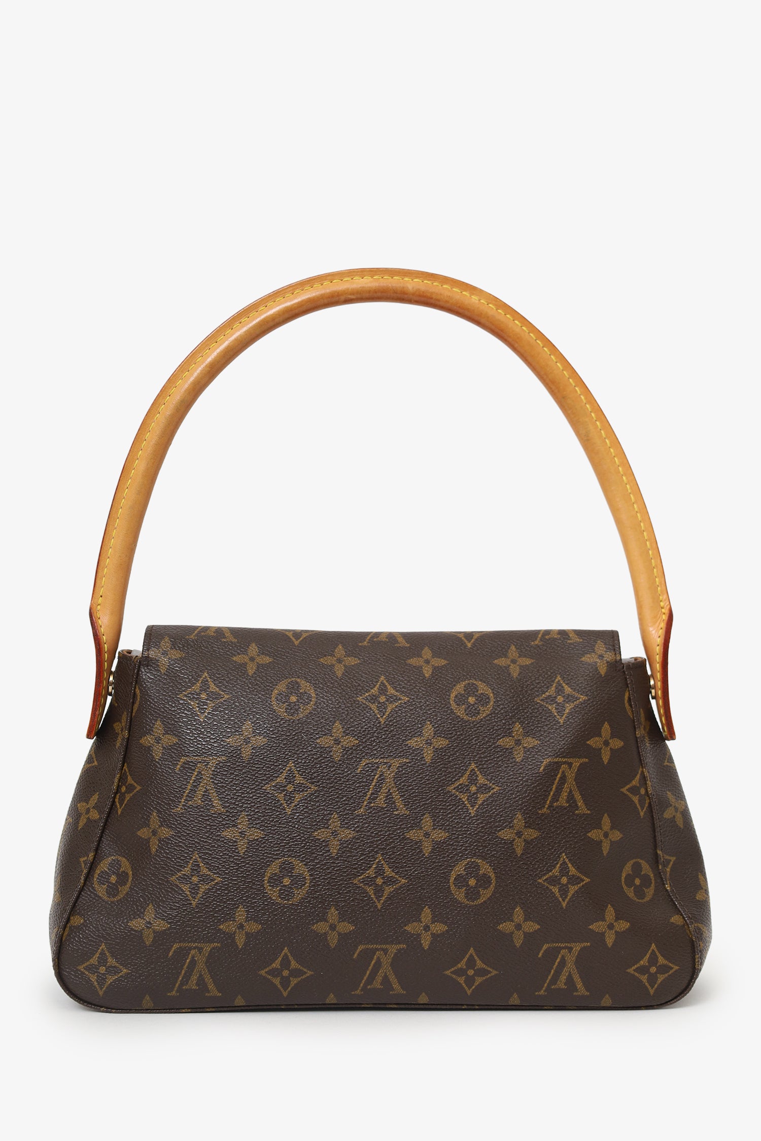 Louis Vuitton 2003 Monogram Mini Looping Shoulder Bag. Front fold-over flap with snap button closure. Single shoulder strap. Lined interior. Single rear wall zip pocket. Gold-tone hardware. Tonal stitching.