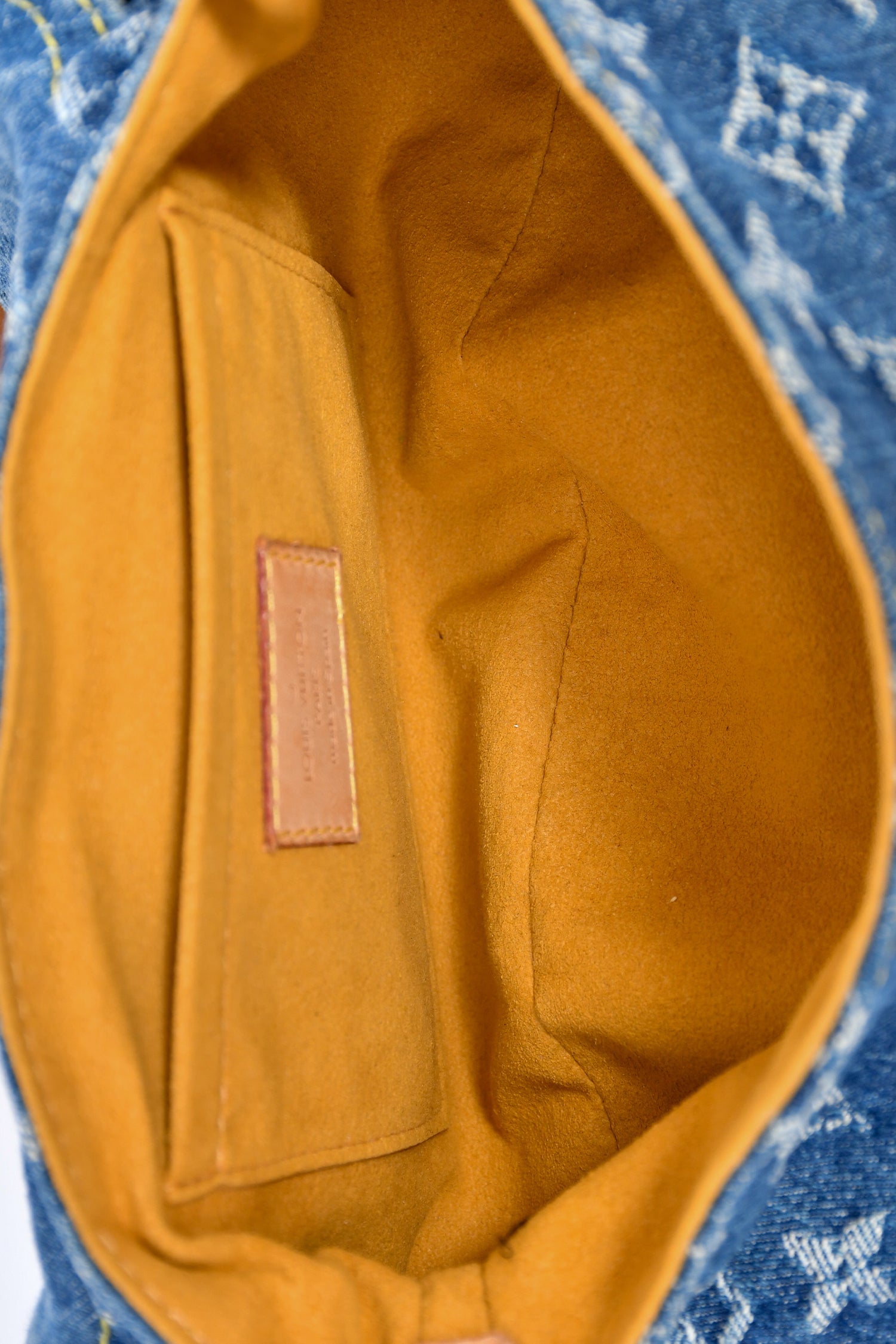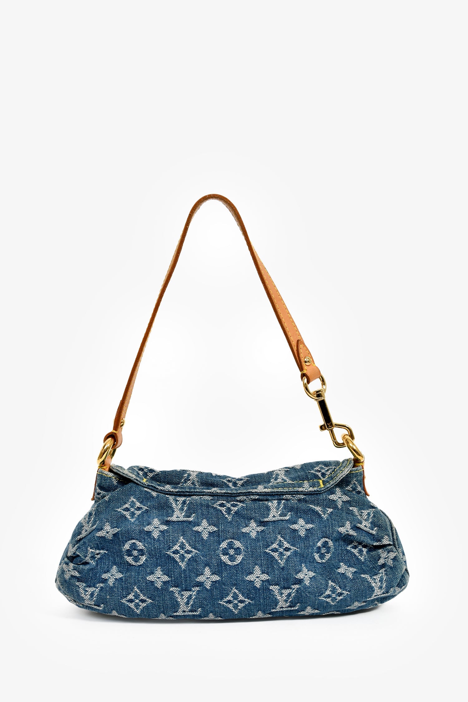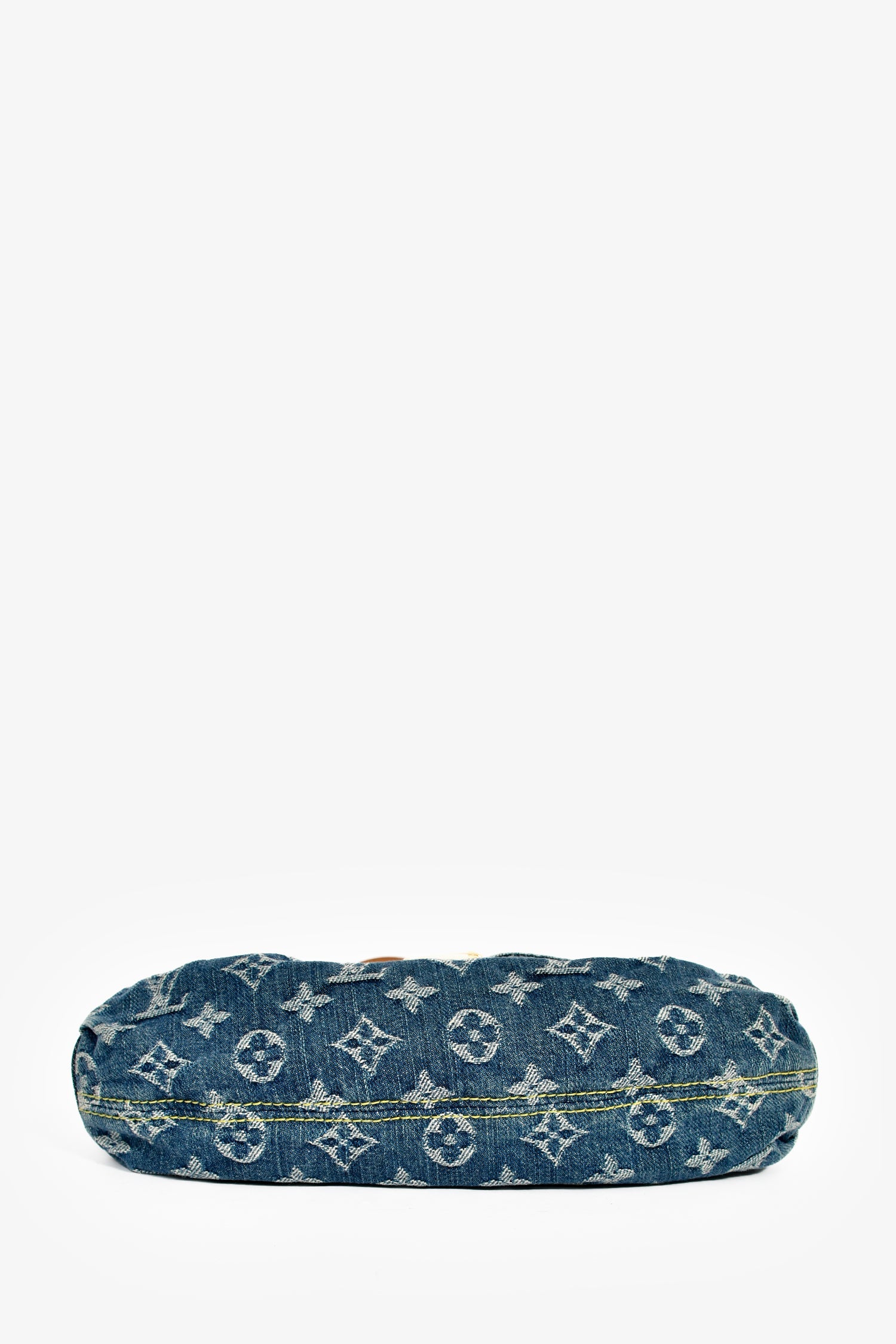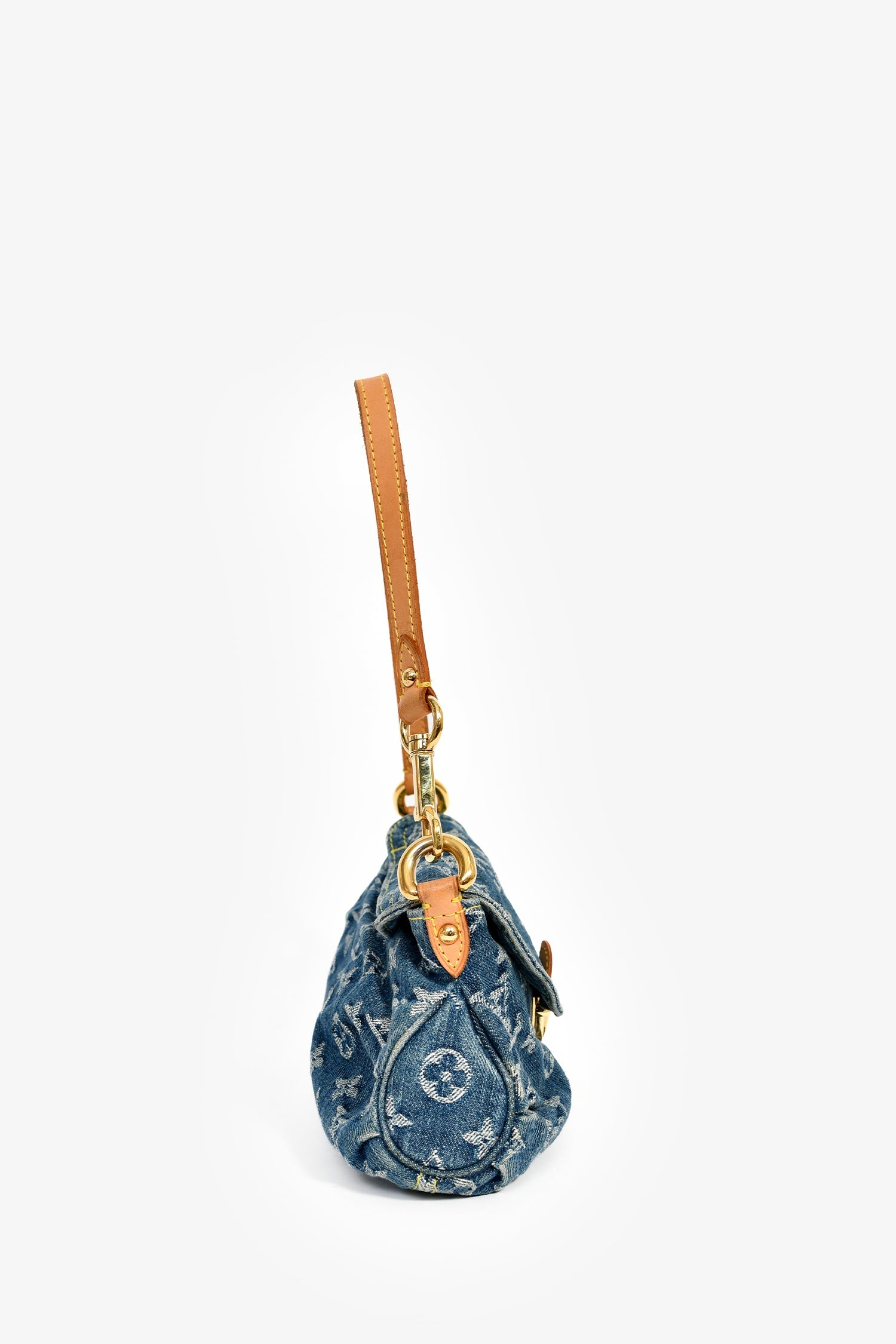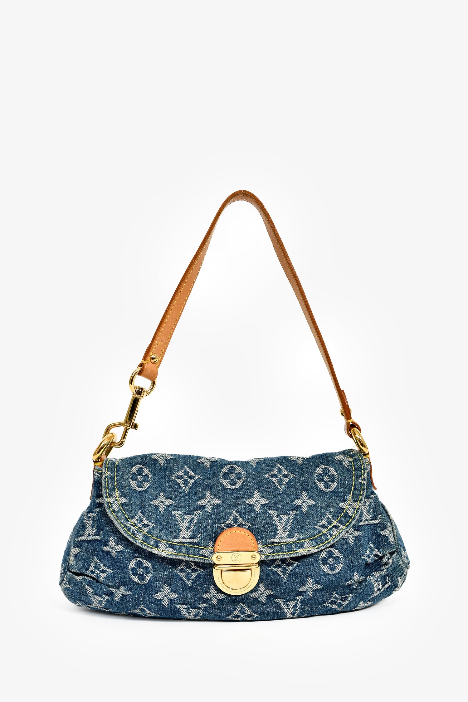 Louis Vuitton 2005 Denim Monogram Pleaty Shoulder Bag. Fold-over flap with a press-lock closure. Single shoulder strap. Lined suede interior with a single card slot. Gold-tone hardware. Contrast stitching.