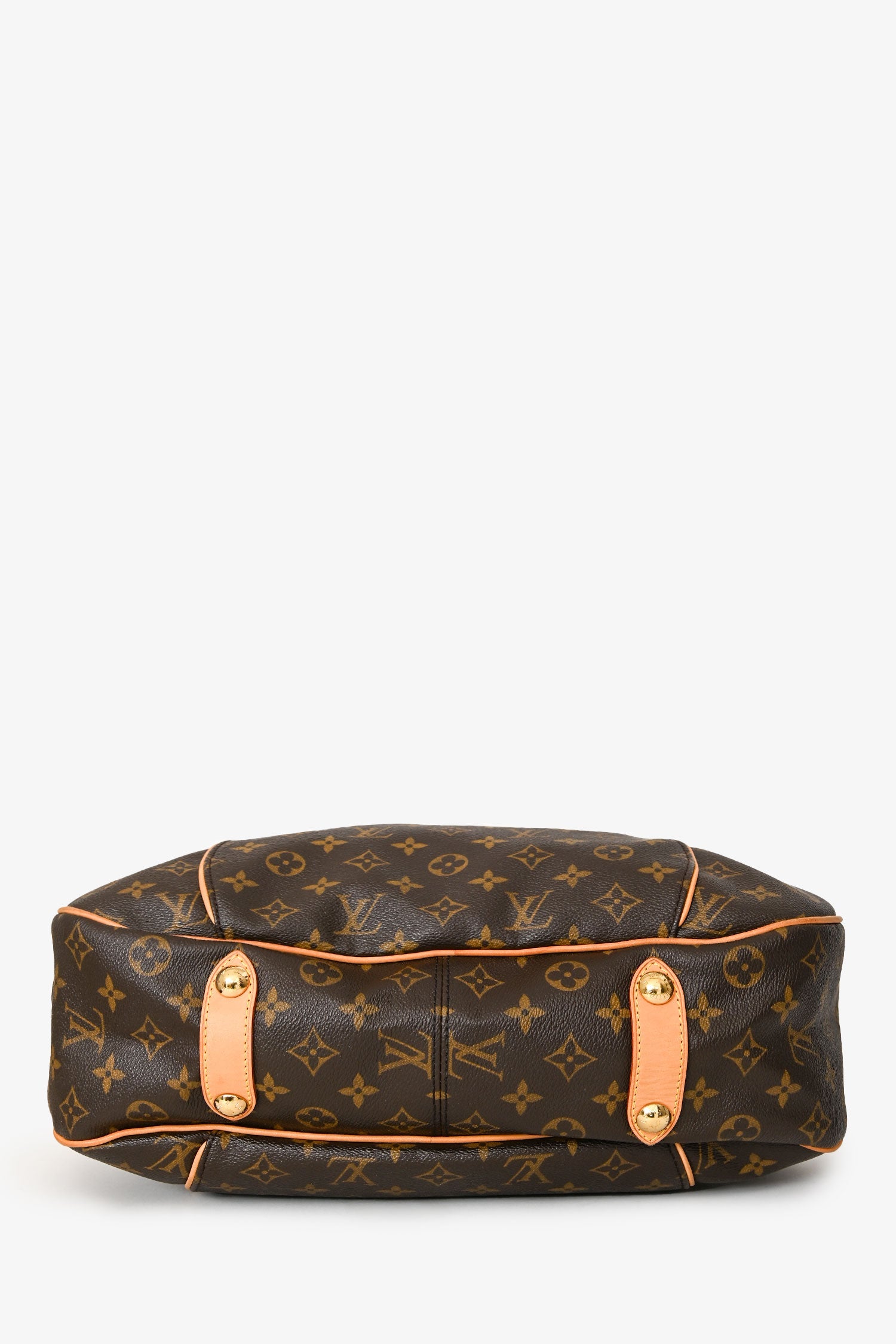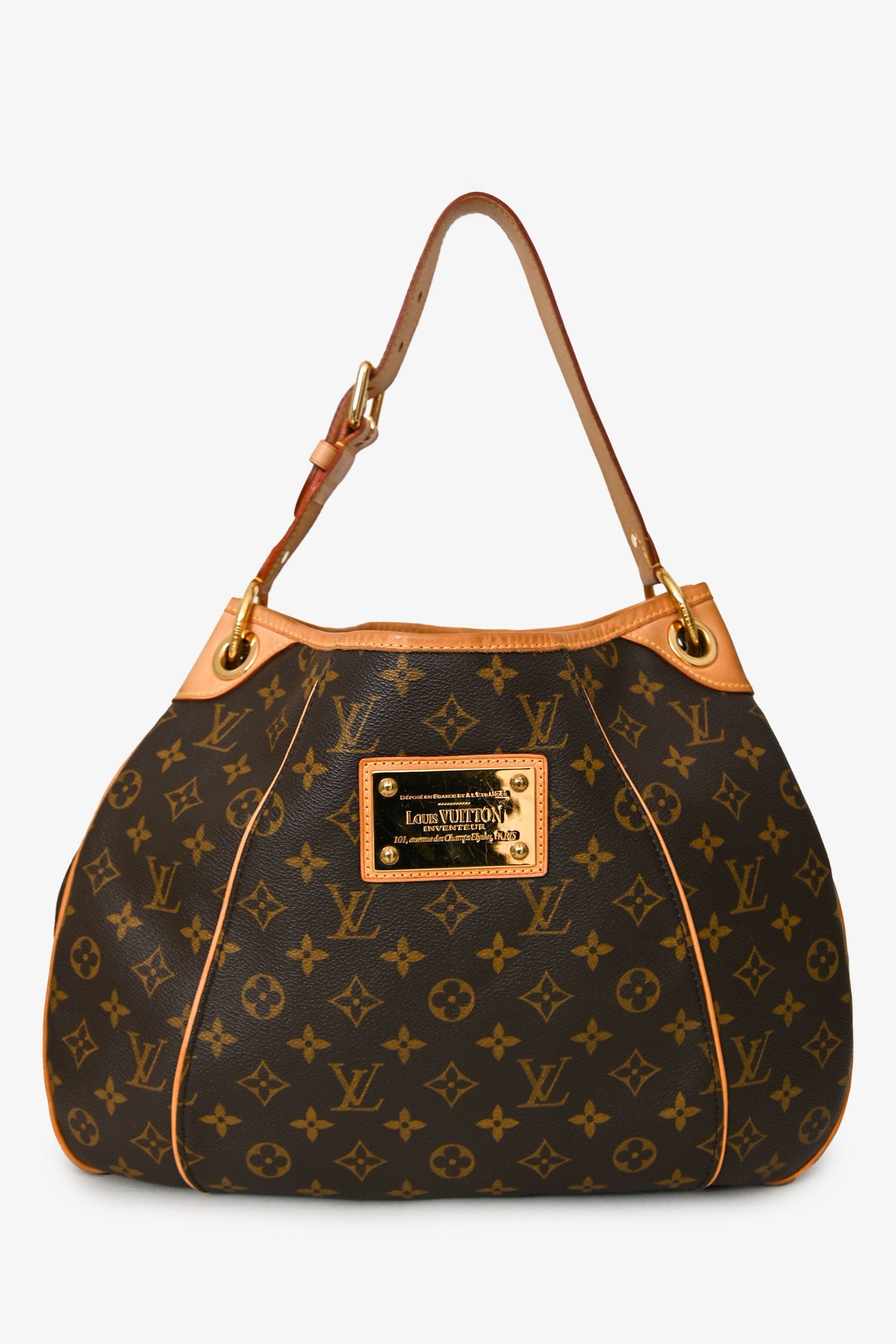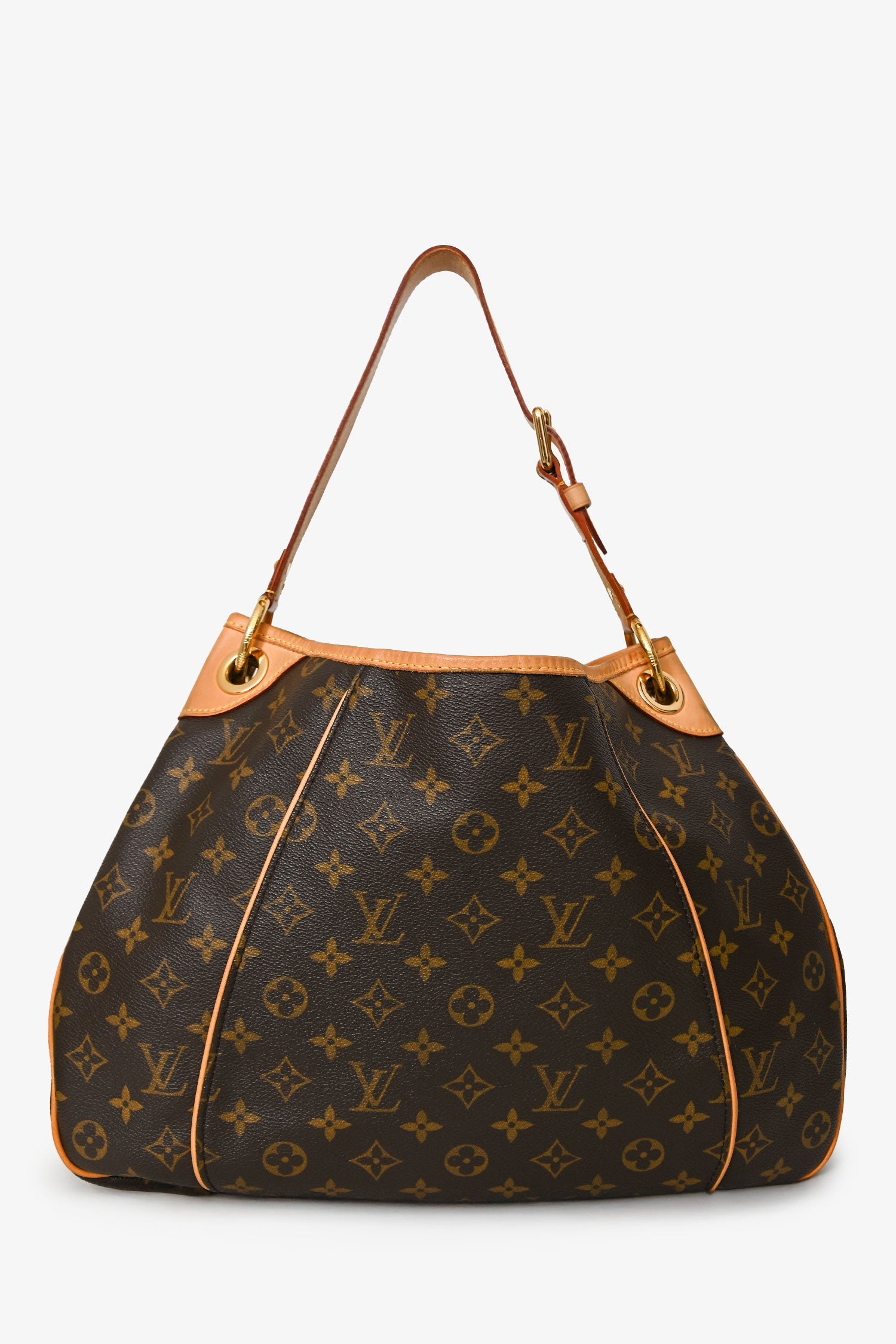 Louis Vuitton 2008 Brown Monogram Canvas/Leather Monogram Galliera Shoulder Bag. Magnetic snap closure. Single flat shoulder strap with adjustable buckle. Single main compartment; 1 interior snap flap pocket; 1 interior slip pocket. 4 protective base studs. Gold-tone hardware. Contrast stitching.