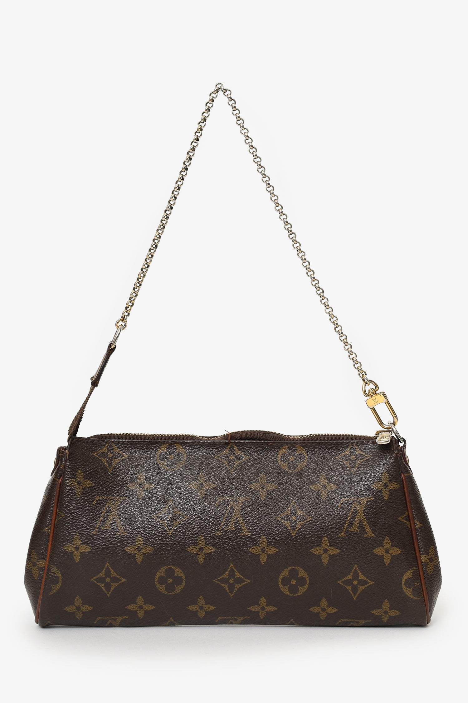 Louis Vuitton 2014 Brown Monogram 'Eva' Pochette. Top zip closure. Chainlink shoulder strap with clasp closure to one end. Gold-tone hardware. Tonal stitching.
