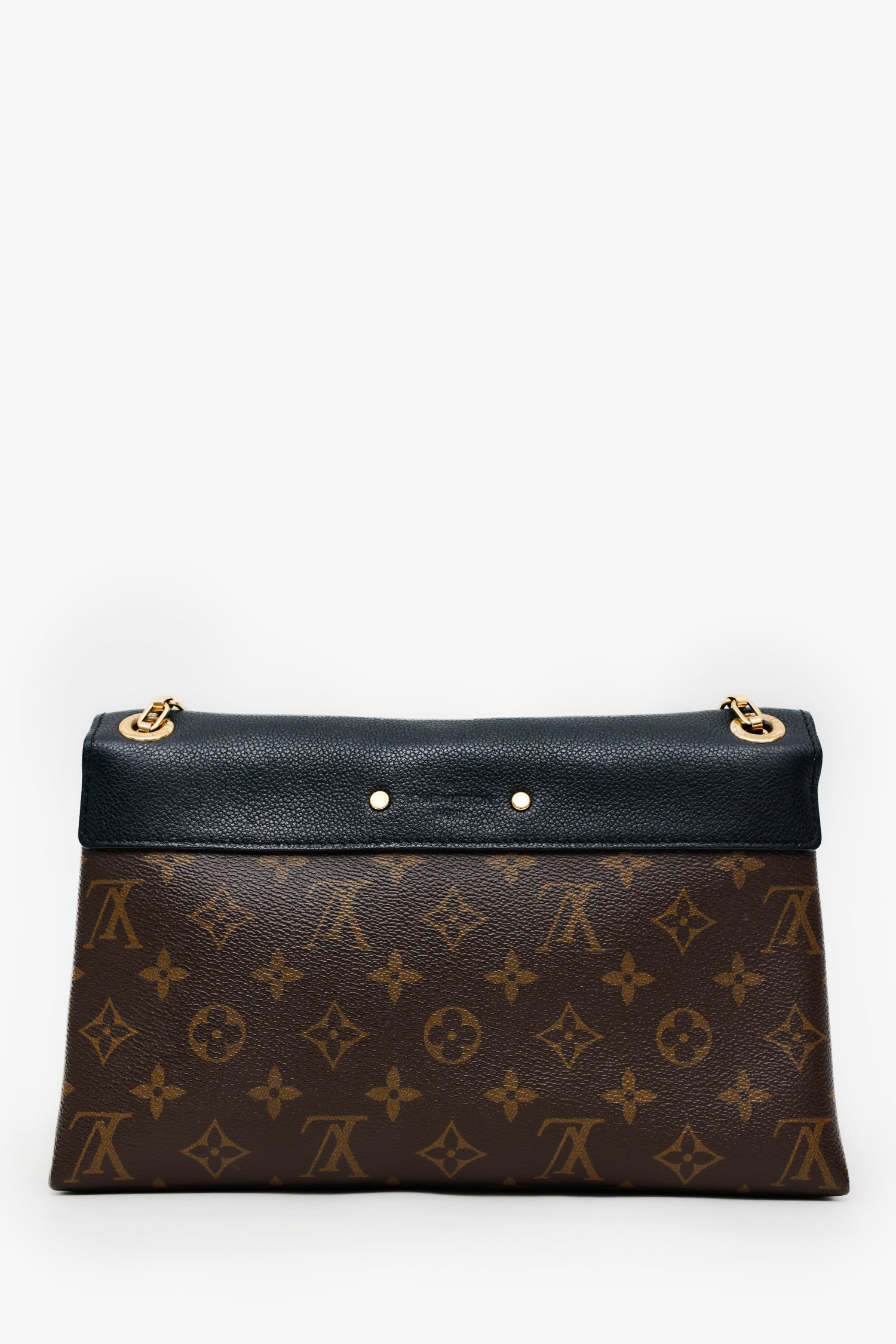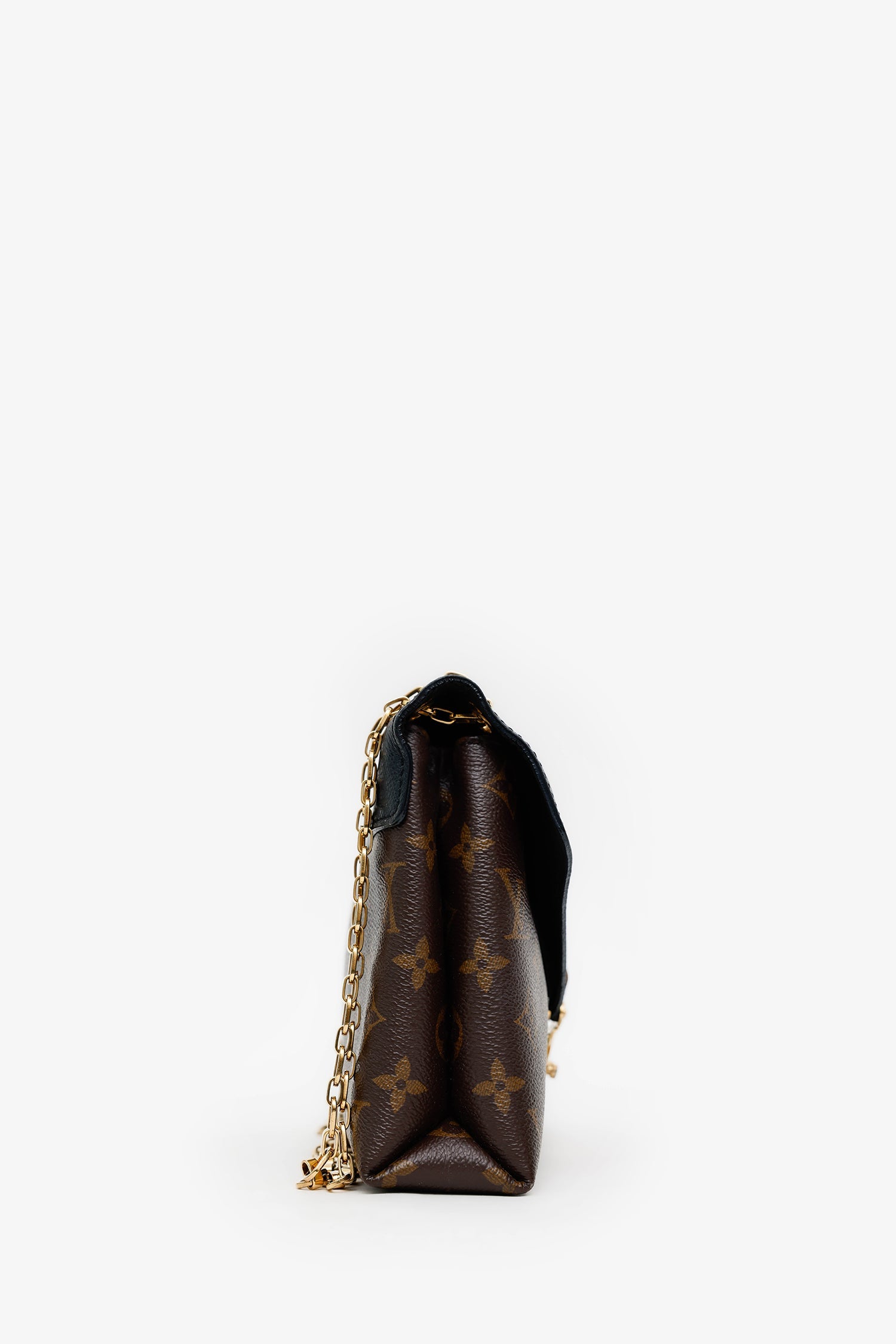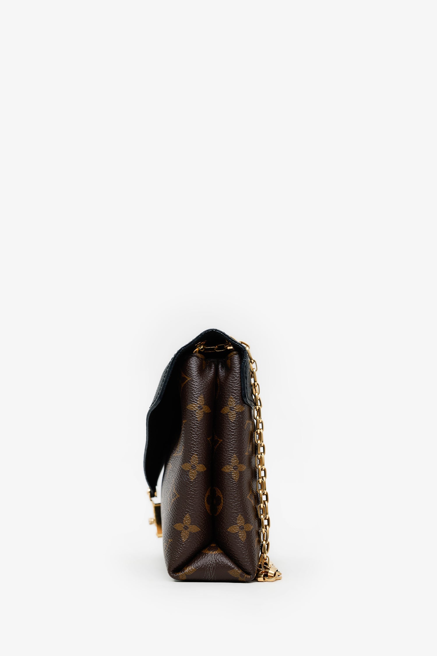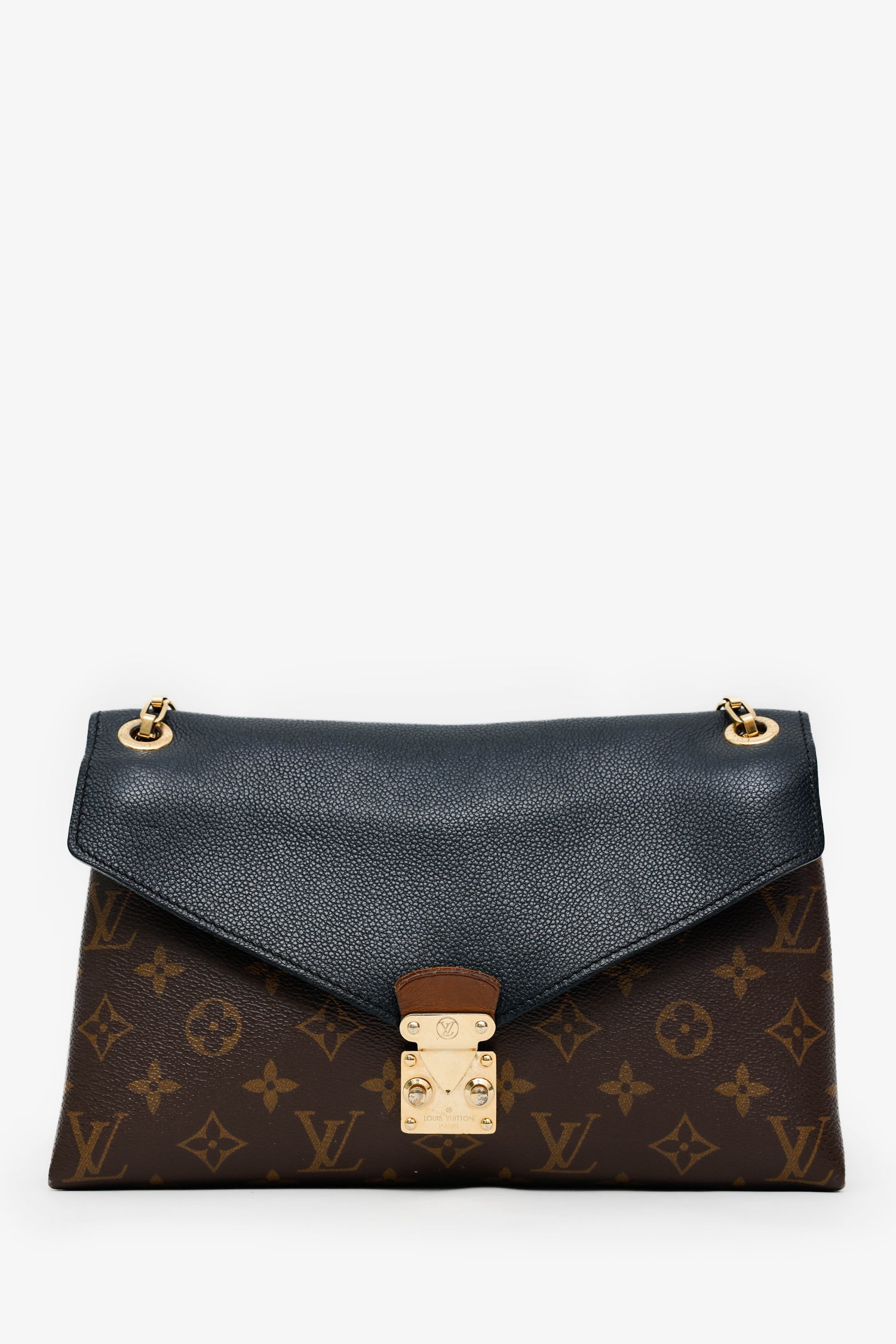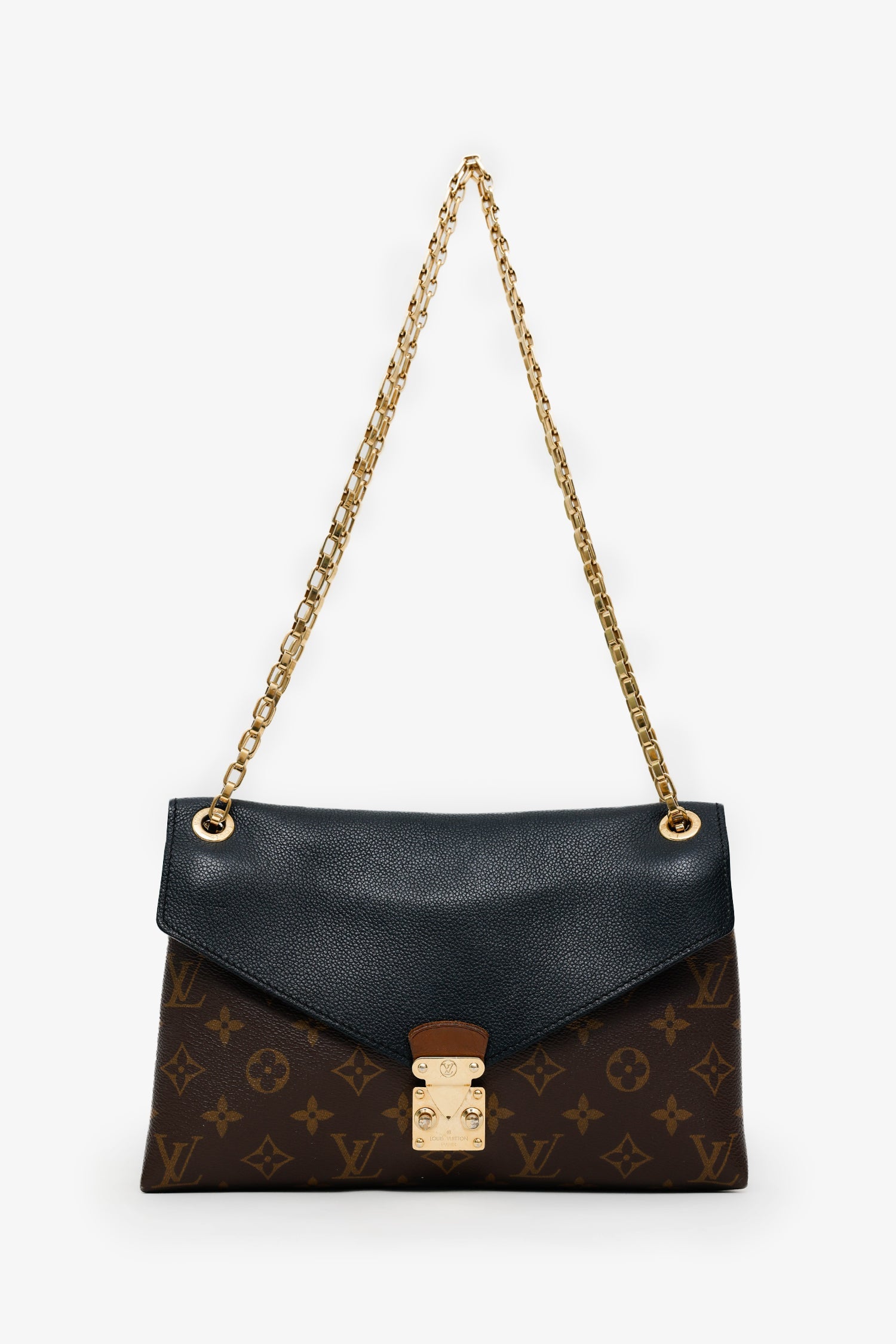 Louis Vuitton 2016 Black Monogram Pallas Chain Bag. Front fold-over flap with push-lock closure. 2-way chainlink shoulder strap. Lined interior with 5 pockets; 4 slip, and 1 zip. Gold-tone hardware. Tonal stitching.