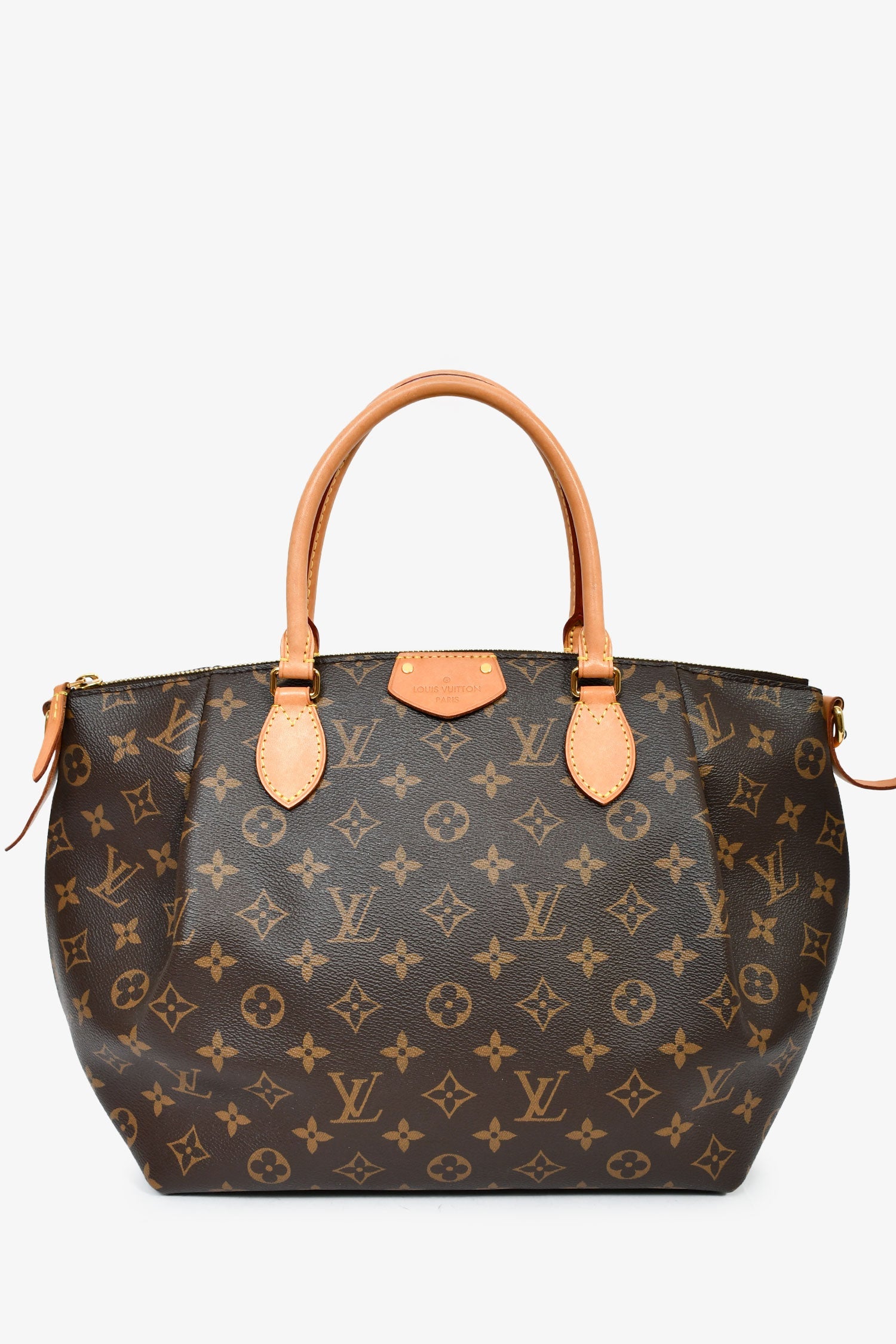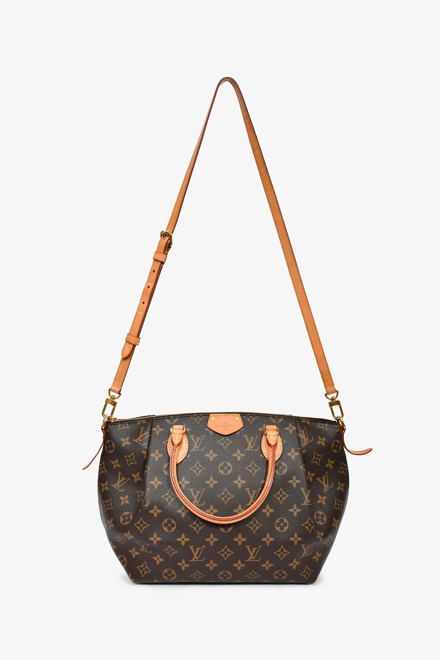 Louis Vuitton 2017 Monogram Turenne MM Crossbody. Top zip closure. Dual handles. Detachable and adjustable strap. Textile-lined interior. 3 interior wall slip pockets. Gold-tone hardware. Tonal stitching.