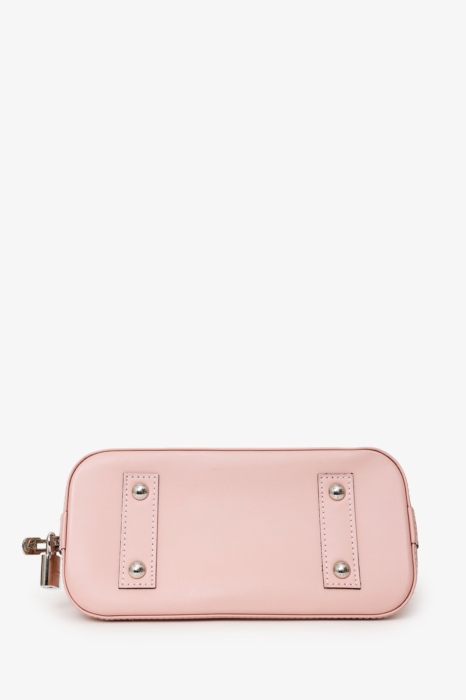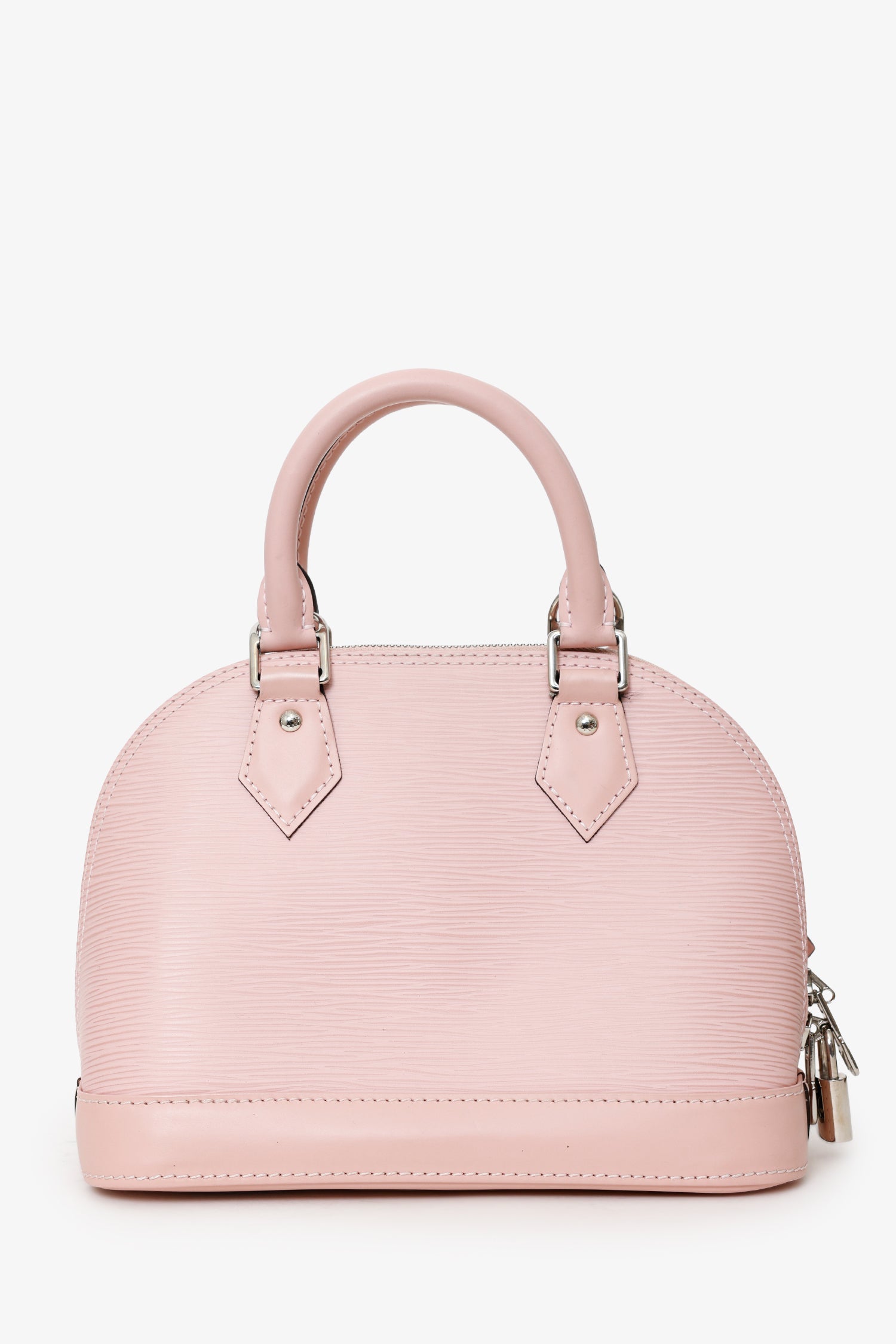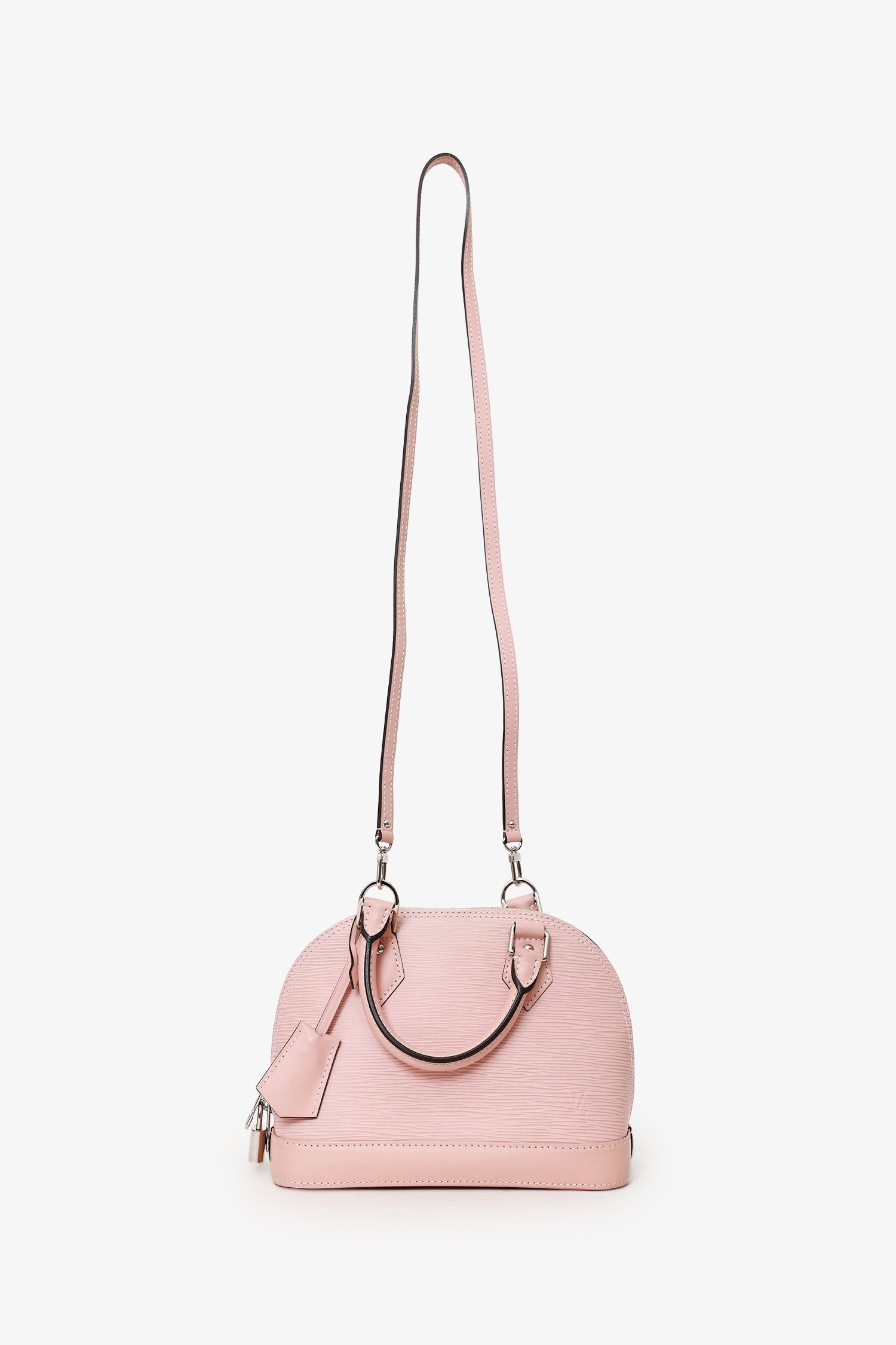Louis Vuitton 2017 Pink Epi Leather Alma BB With Strap. Top zip-up closure. Twin top handles. Removable crossbody strap with clasp closure. Protective base studs. Lined interior with single rear slip pocket. Additional bag tag with lock-and-keys. Silver-tone hardware. Tonal stitching.
