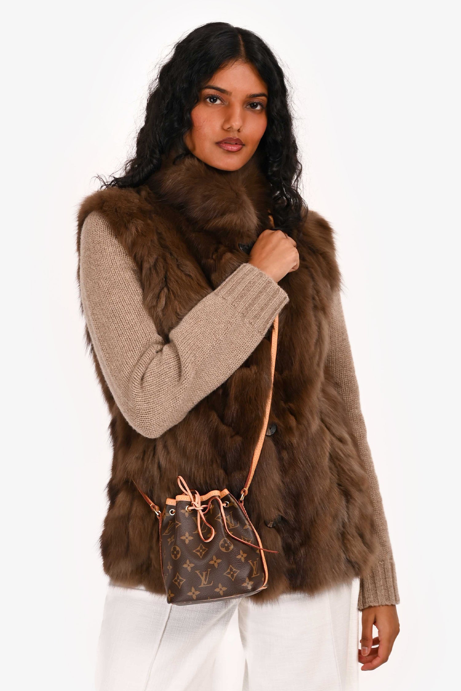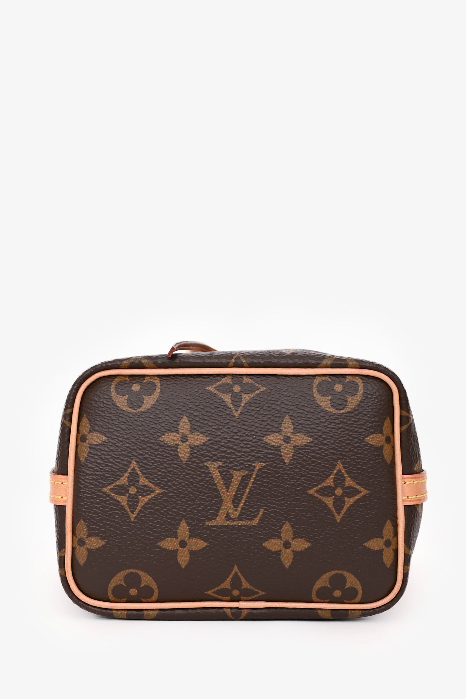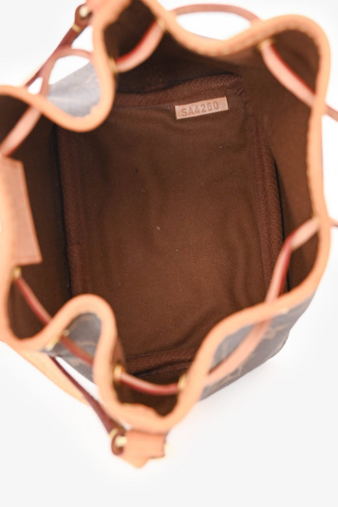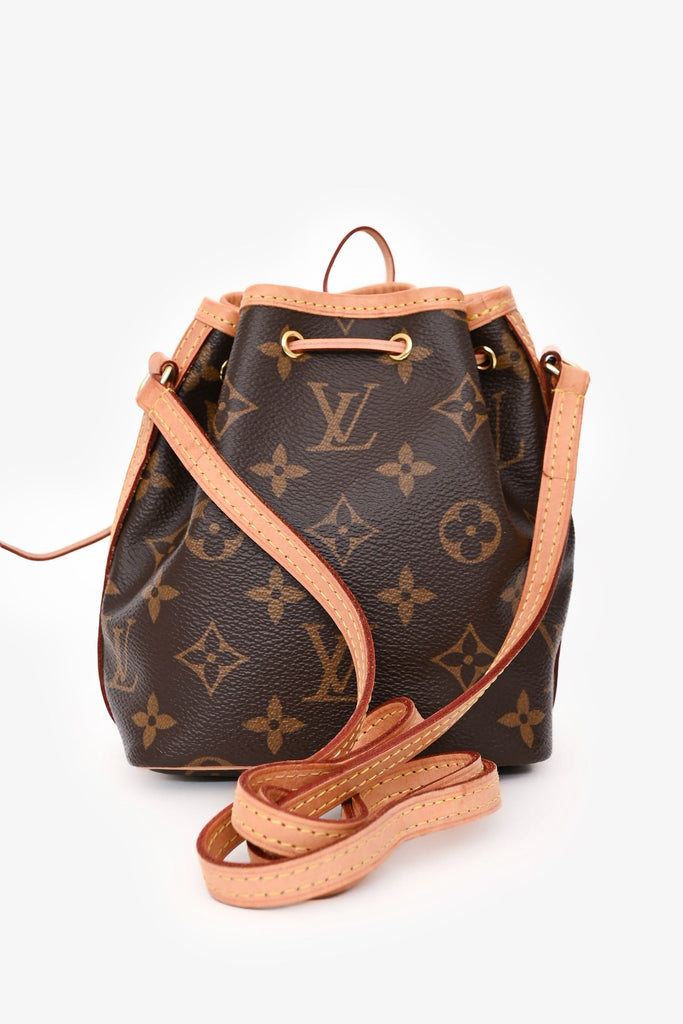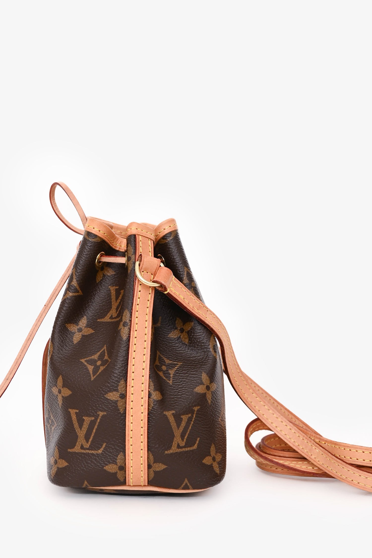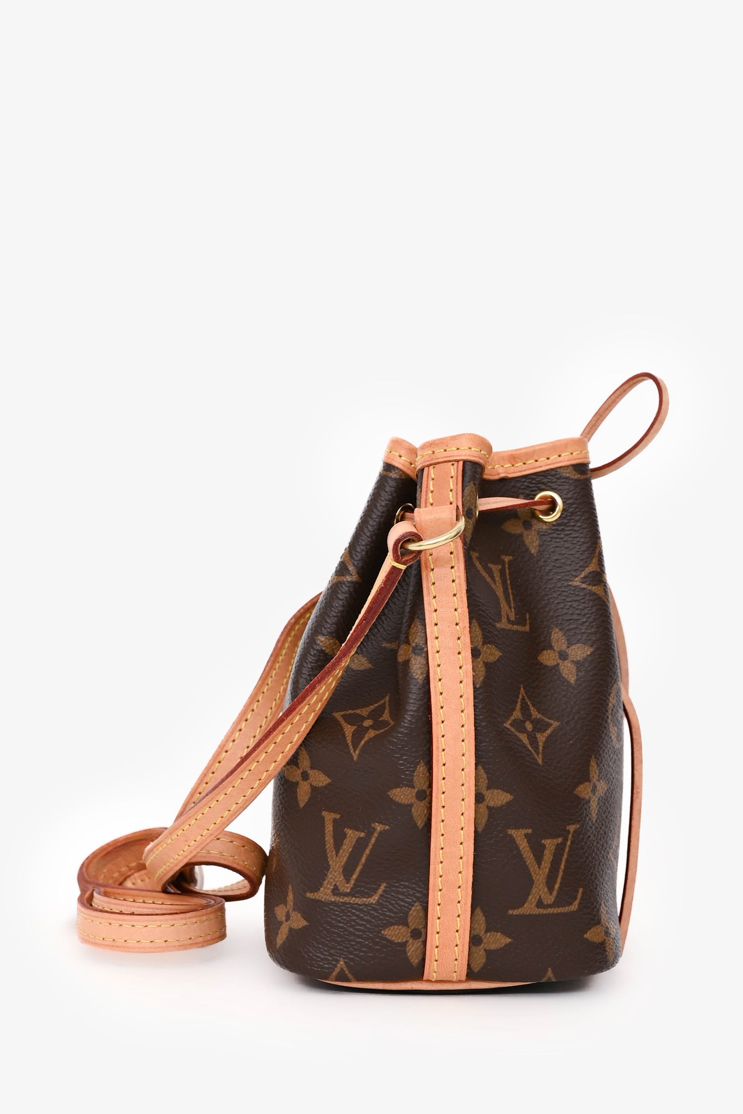 Louis Vuitton 2020 Monogram Nano Noé. Drawstring closure. Adjustable leather crossbody strap. Monogram coated canvas exterior with leather trim. Gold-tone hardware. Tonal stitching.