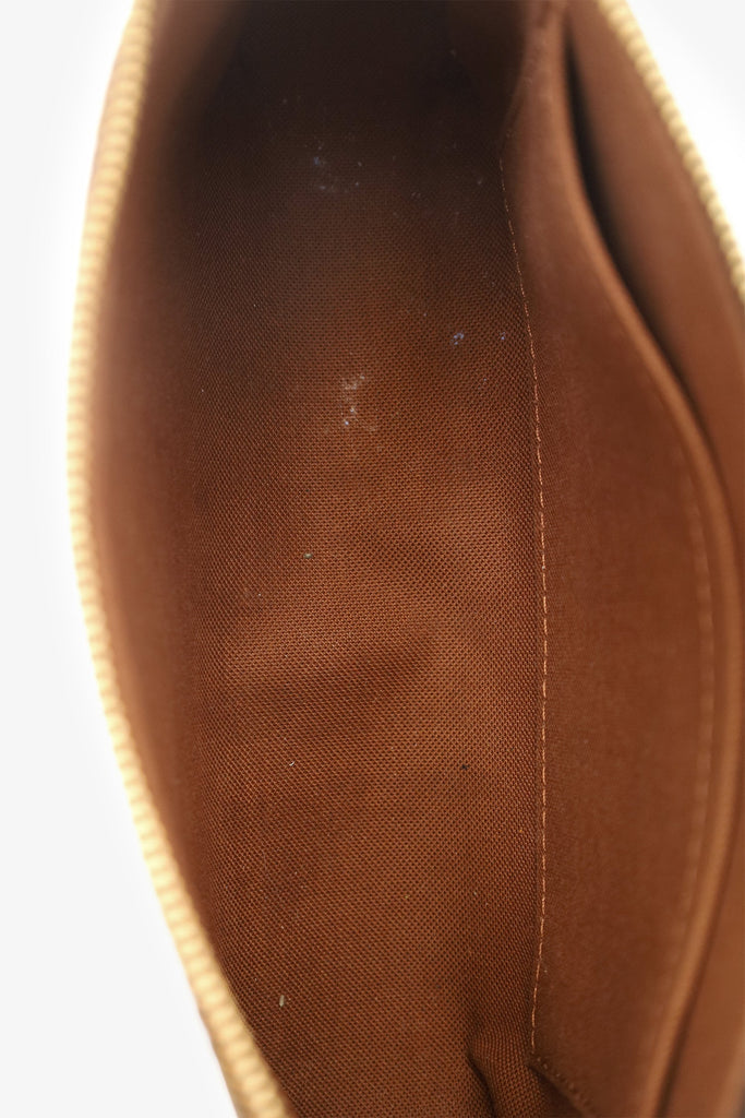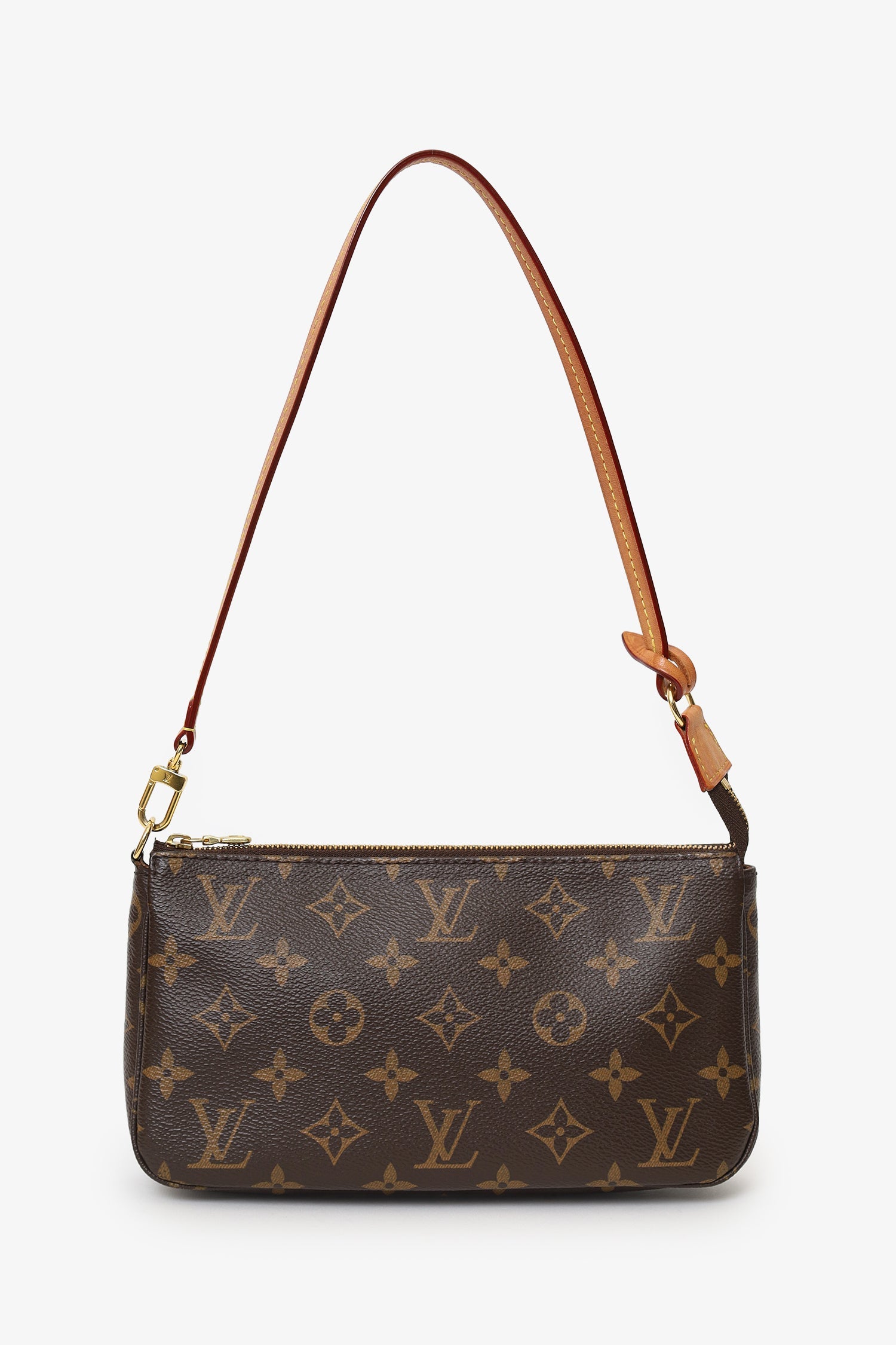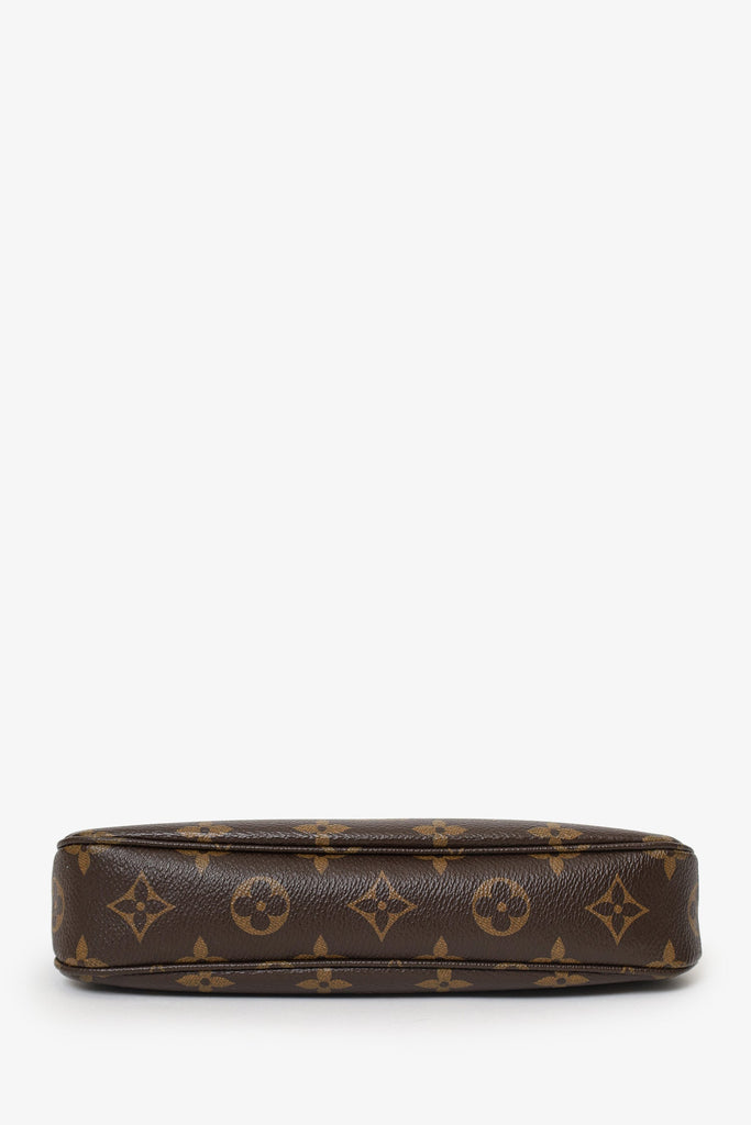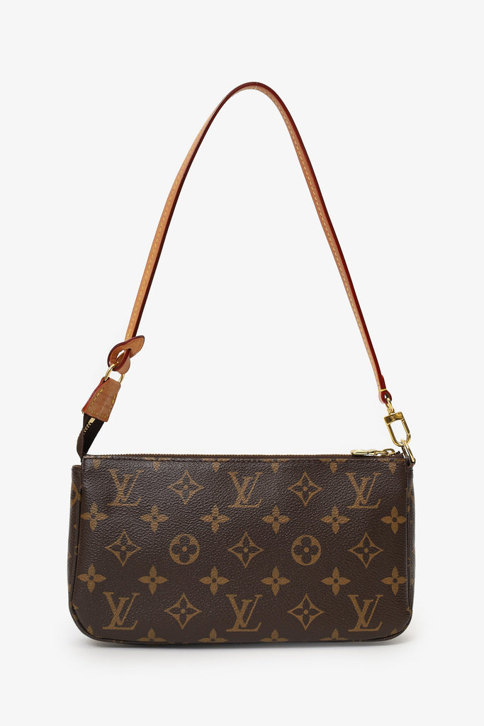 Louis Vuitton 2021 Monogram Pochette. Top zip closure. Removable leather strap. Lined interior. Single interior slip pocket. Gold-tone hardware. Tonal and contrast stitching.