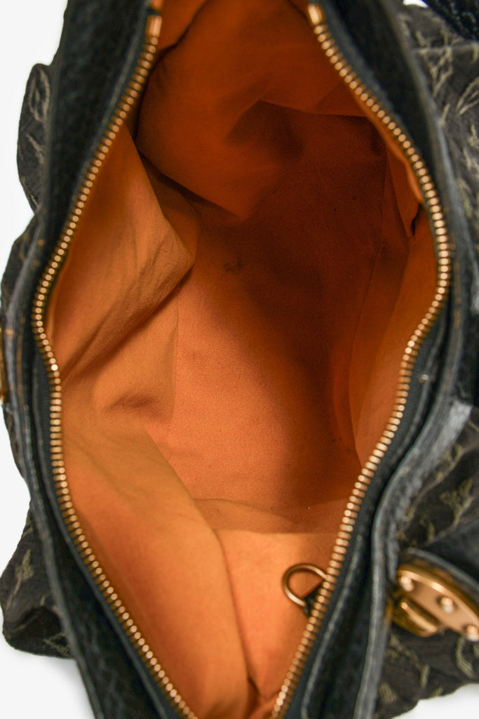 Louis Vuitton Black Denim Light Wash Monogram Hobo Bag. Gold-tone hardware. Pull-through closure. Leather trim and shoulder strap. Monogramed denim. Lined suede interior with 2 pockets. Tonal stitching.