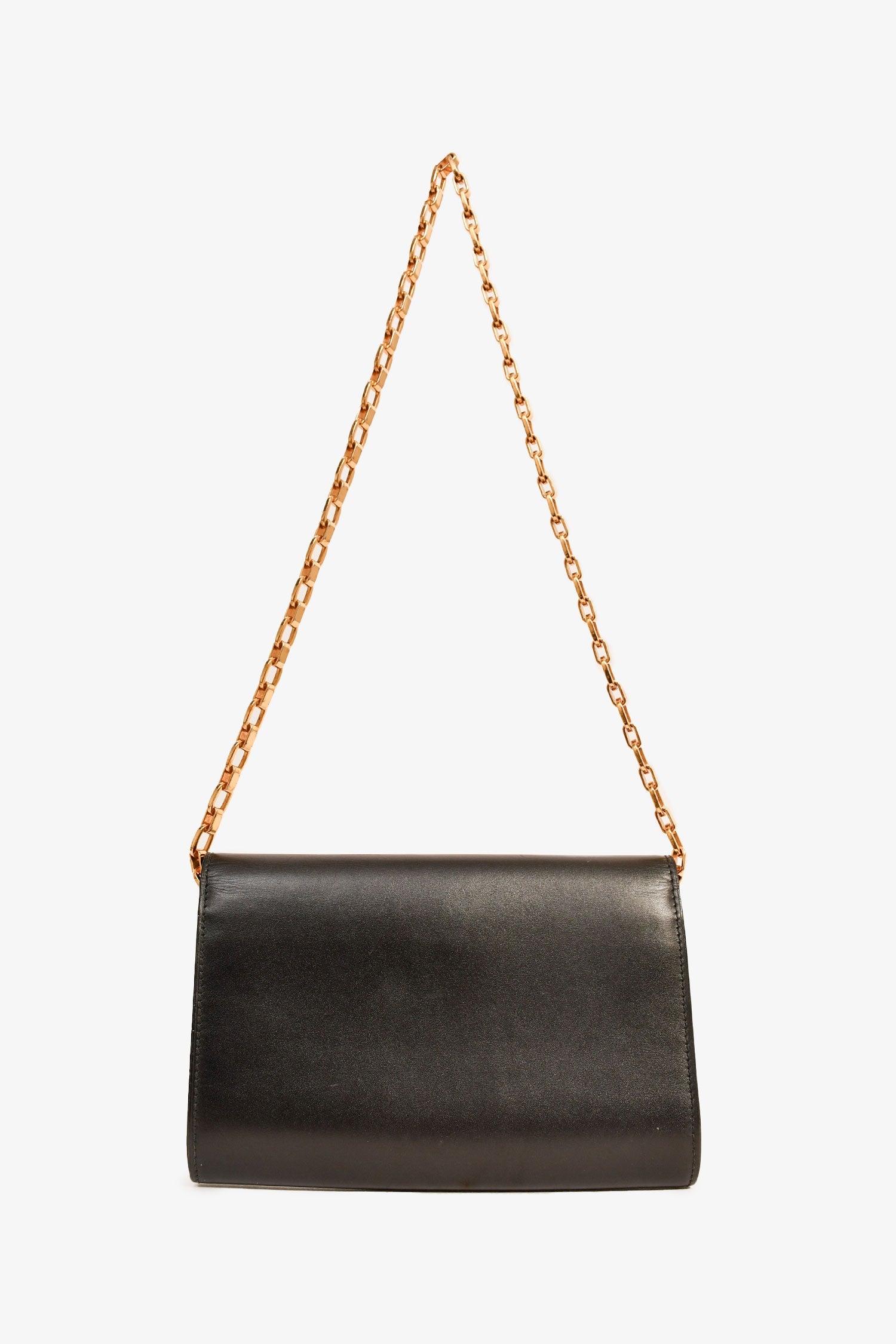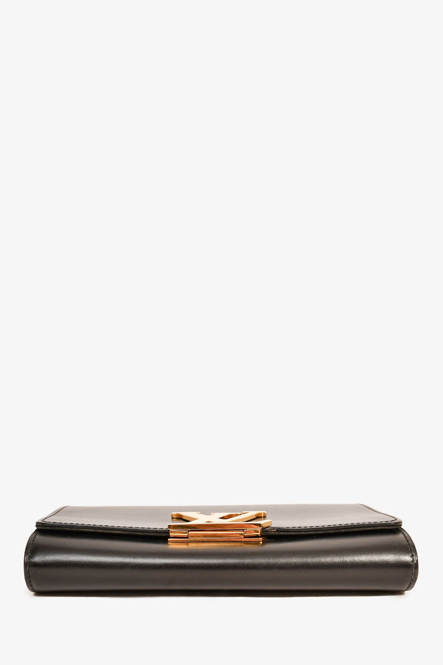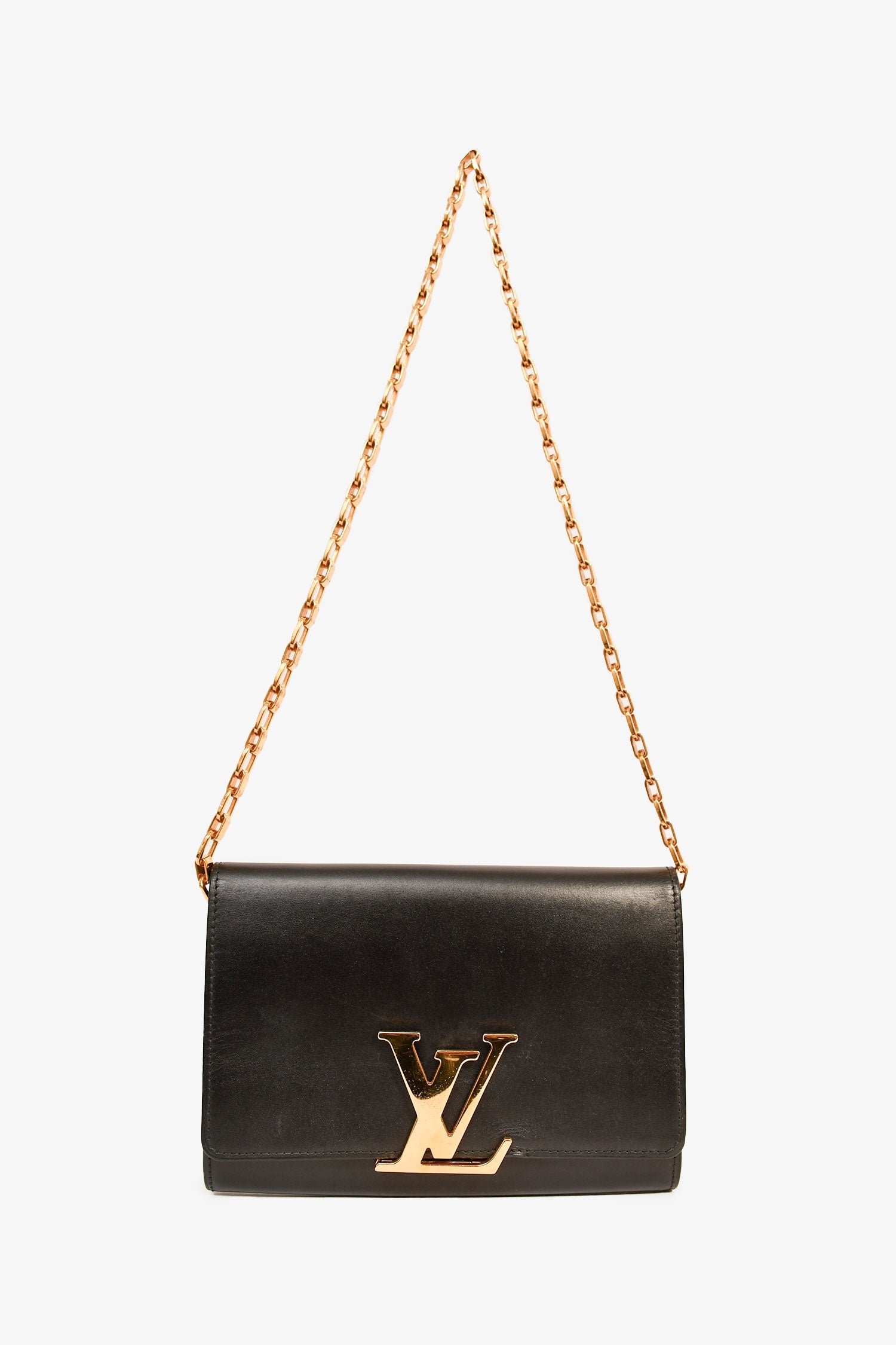 Louis Vuitton Black Leather LV 'Louise' GM Shoulder Bag. Gold-tone hardware. 'LV' flip-lock closure. Fold-over flap. Chain-link shoulder strap. Suede lined interior with 6 card slots. Single zipped compartment. Slip compartment. Tonal stitching.