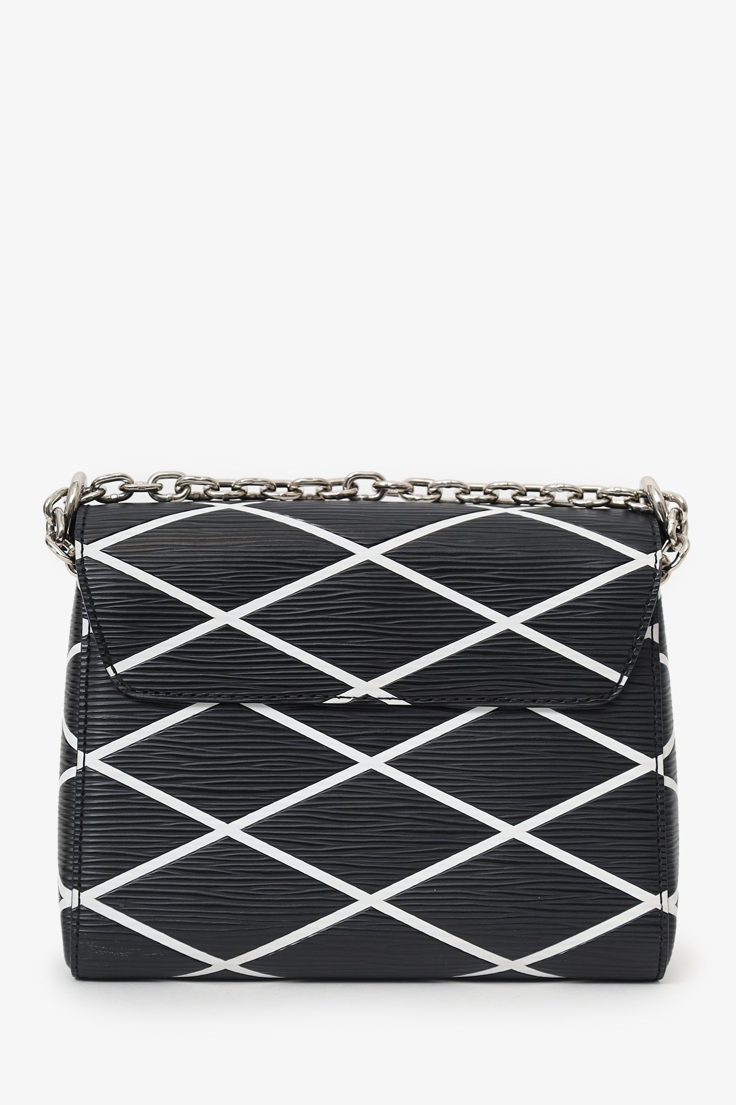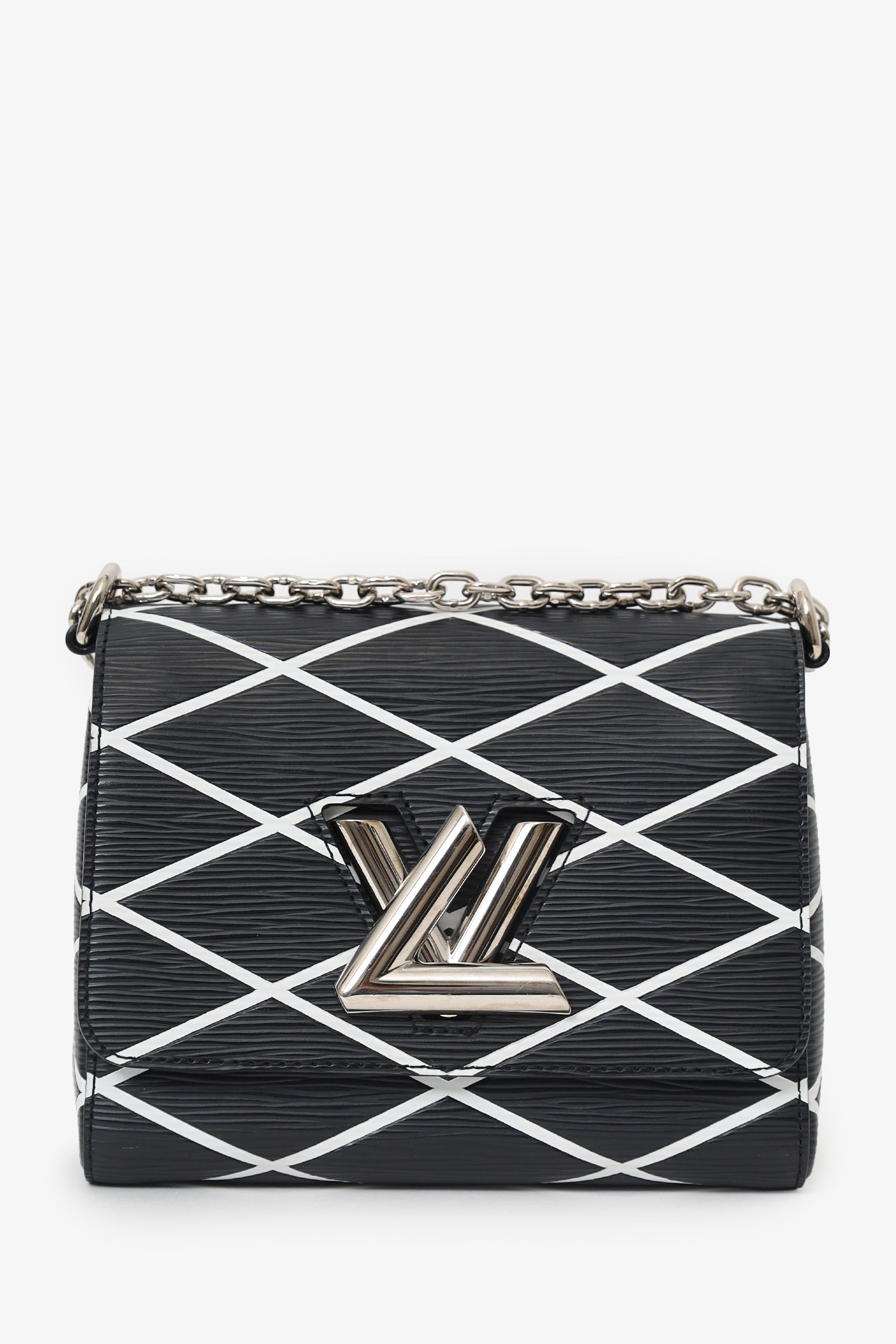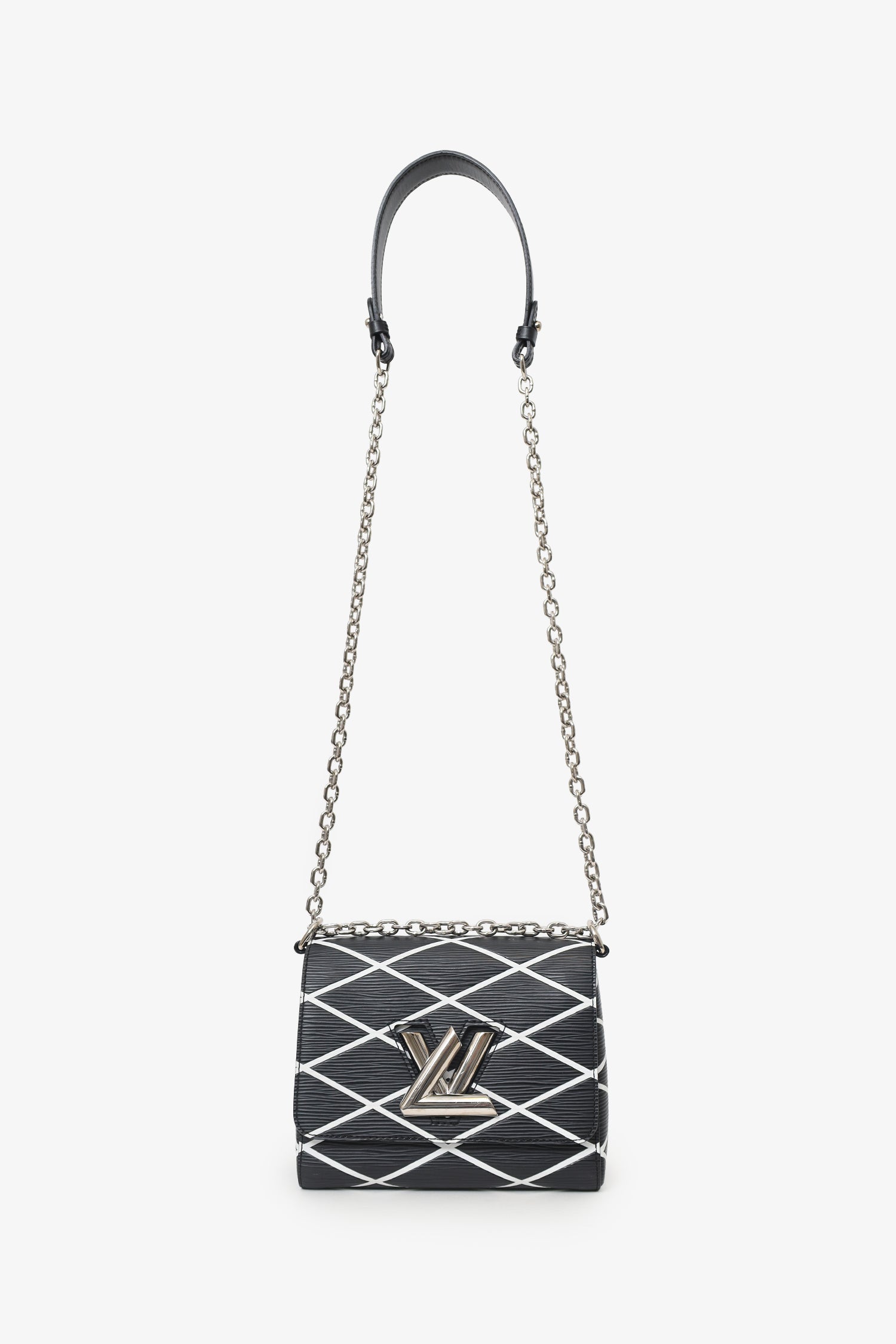 Louis Vuitton Black/White Malletage Leather Twist PM Shoulder Bag. Front fold-over-flap with turn-lock closure. Chain link shoulder strap. Lined interior with 2 slip pockets. Silver-tone hardware. Tonal stitching.
