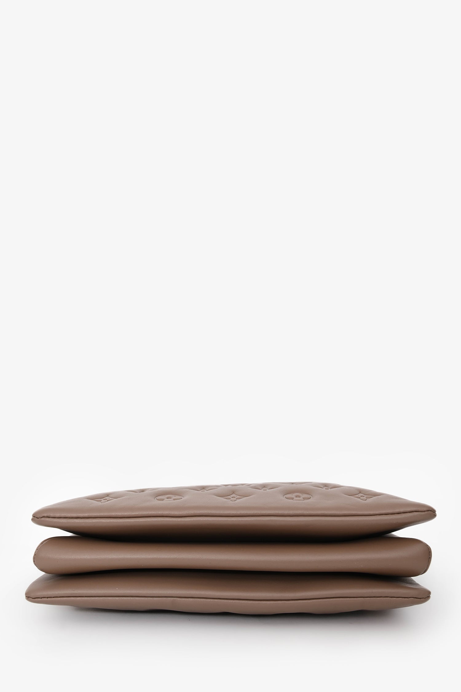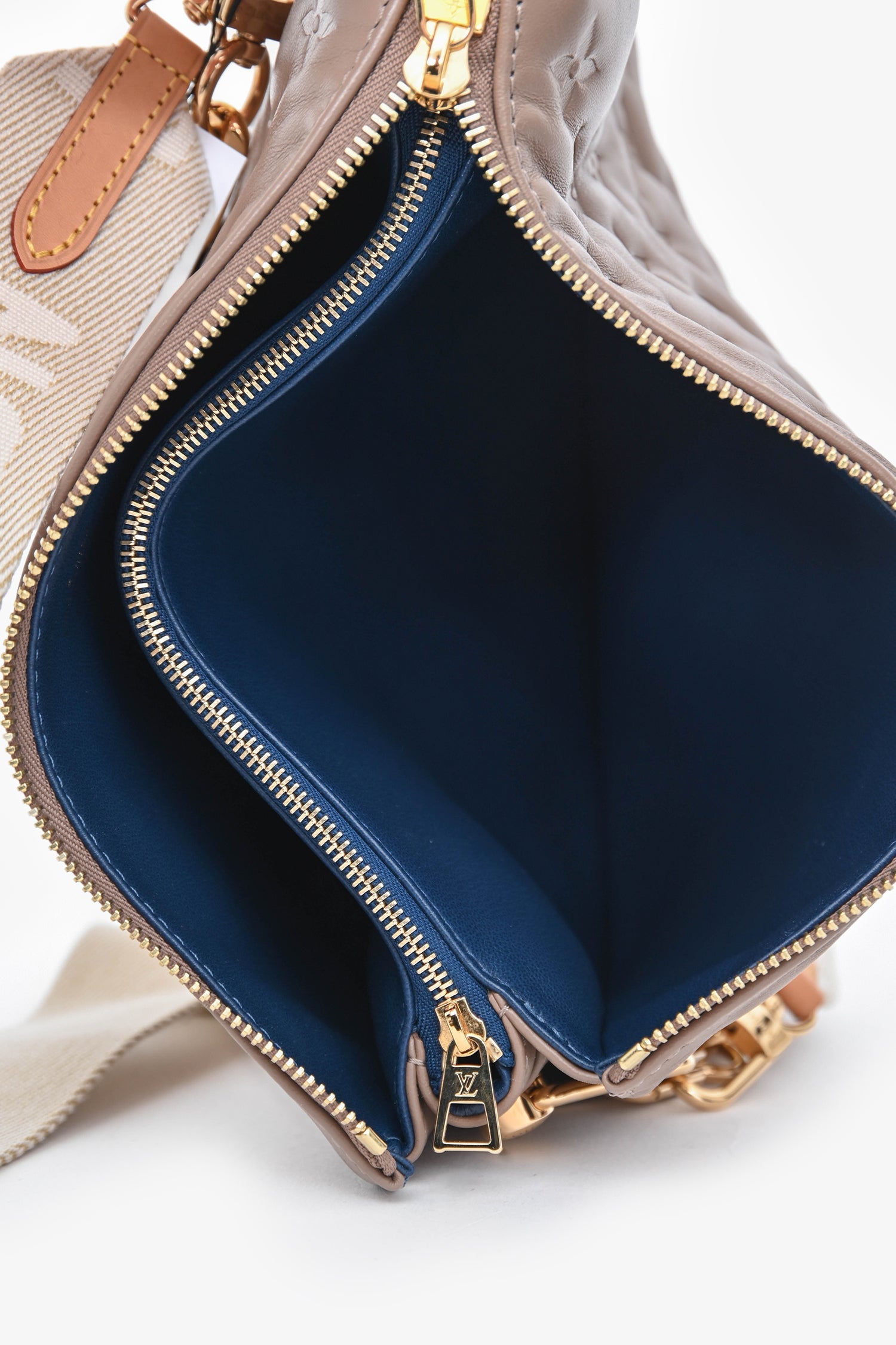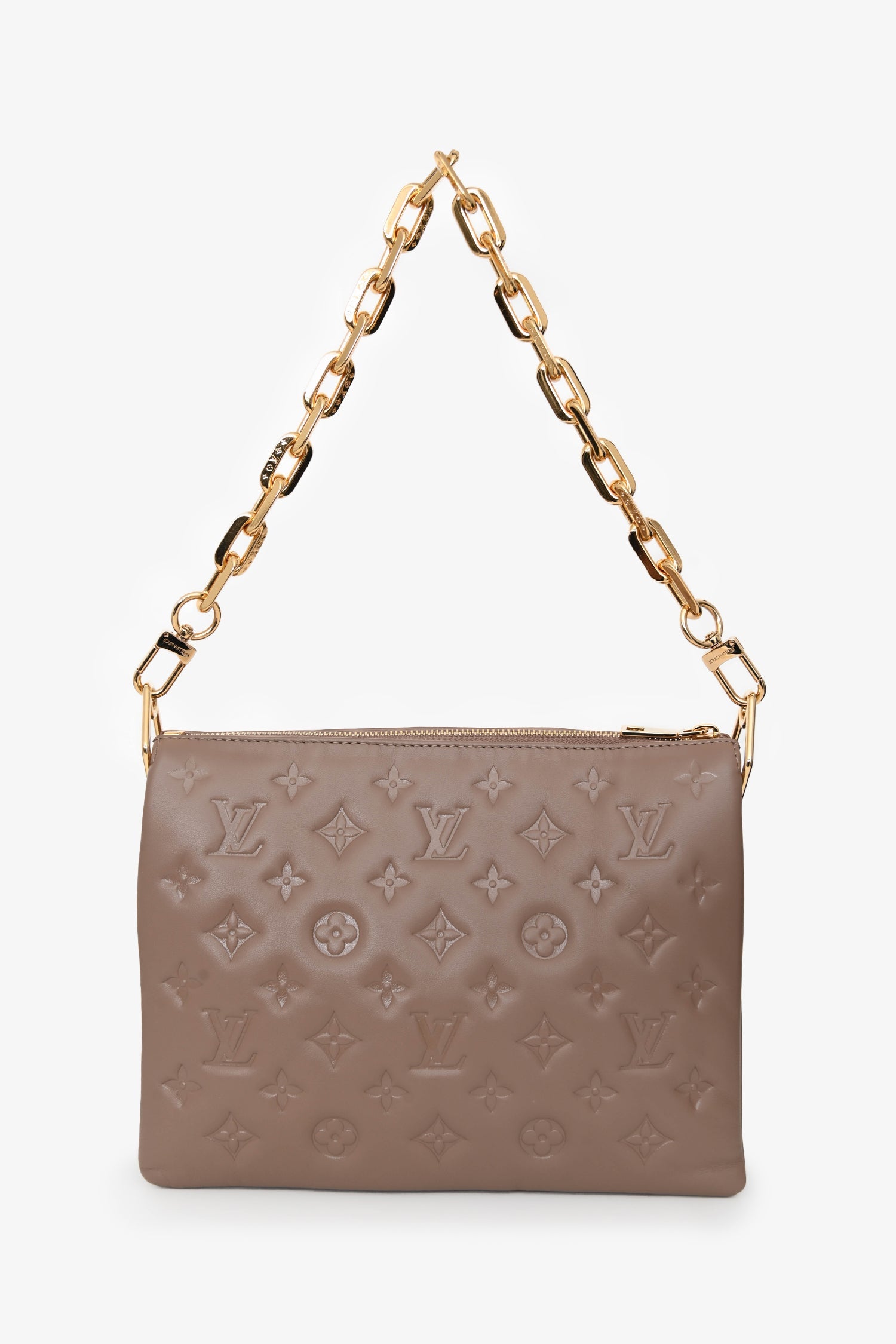 Louis Vuitton Camel Beige Leather Coussin PM Crossbody Bag with Chain Strap. Top zip closure. 2 removable straps; chainlink strap and canvas strap with adjustable buckle closure. Lined interior. 3 interior compartments; 2 side open compartments and middle zip compartment. Gold-tone hardware. Tonal stitching.