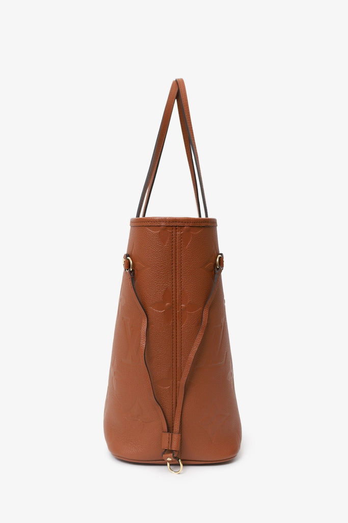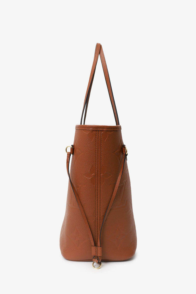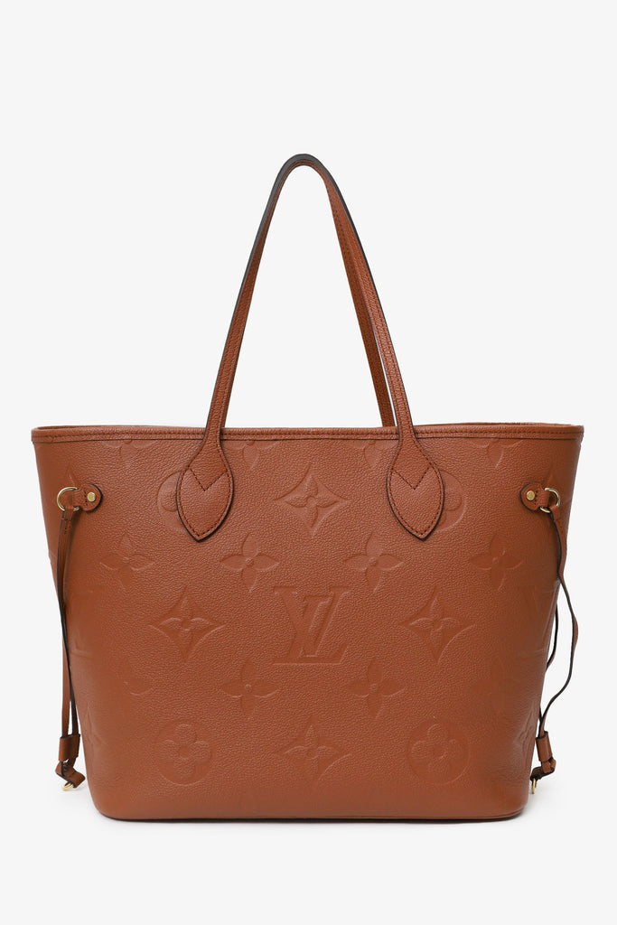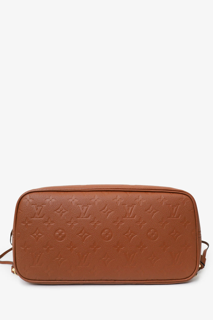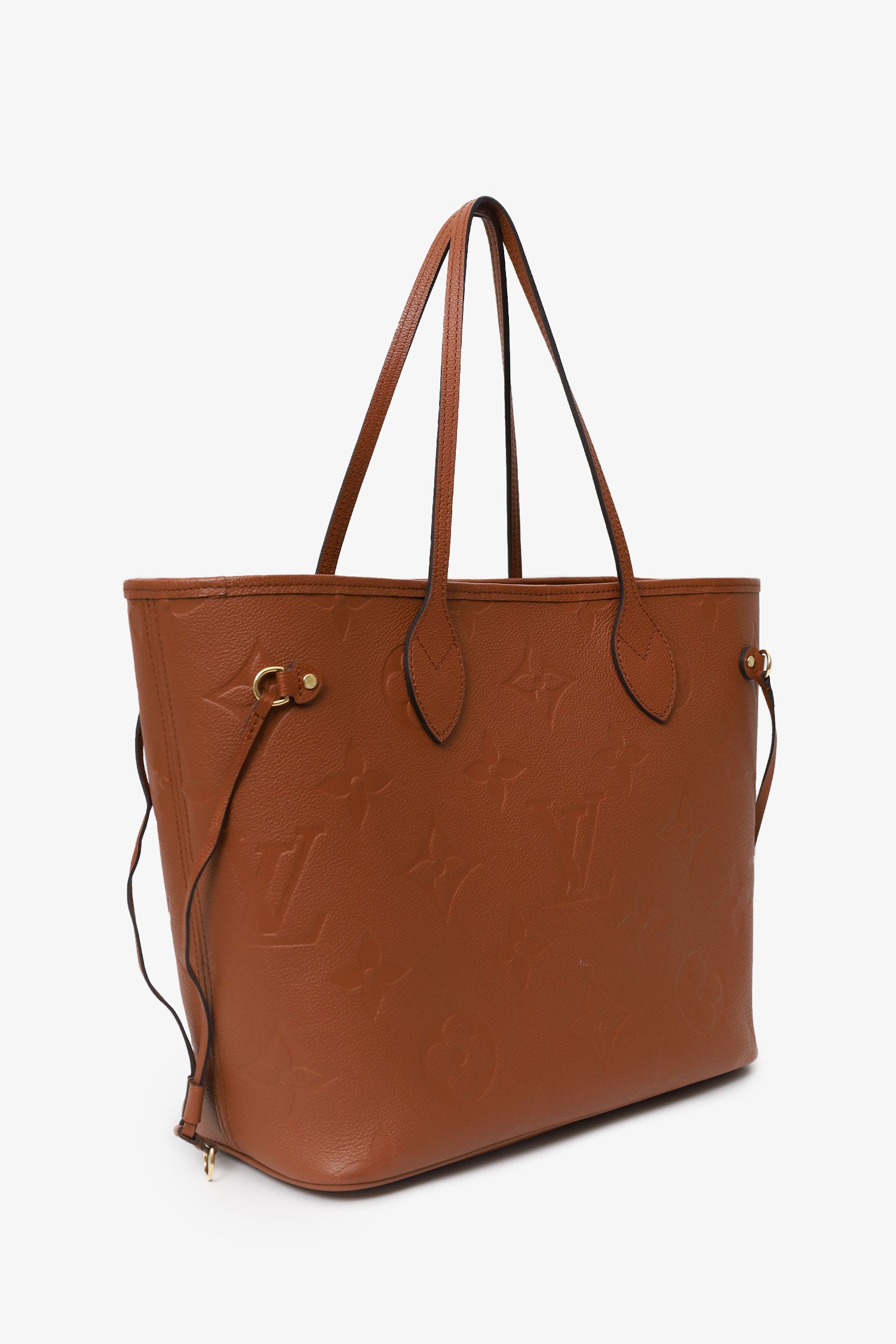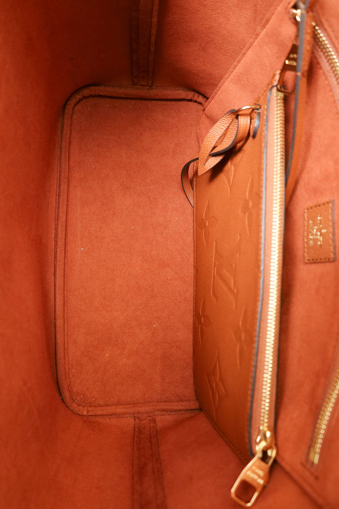 Louis Vuitton Cognac Leather Empreinte Neverfull. Top open with lobster-clasp closure. Twin shoulder strap. Suede lined interior with single zip pocket. Additional removable zip-up pochette with lobster clasp closure. Gold-tone hardware. Tonal stitching.