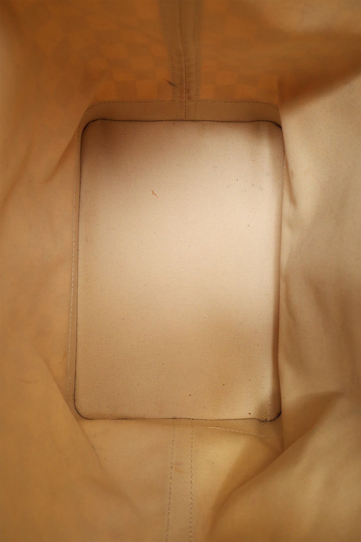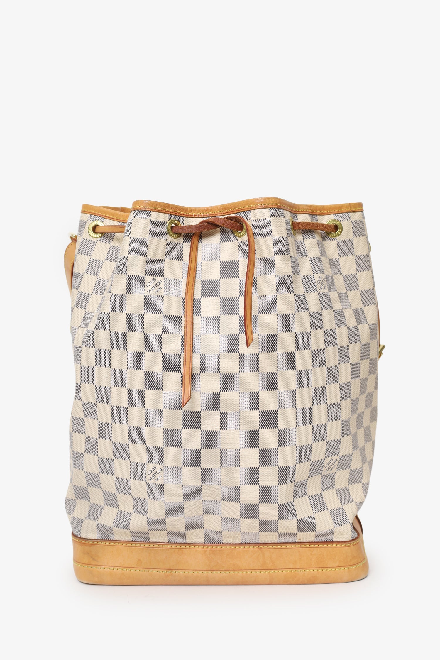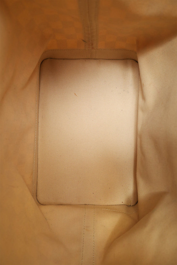 Louis Vuitton Cream Damier Bag. Open top with front tie-up drawstring closure. Adjustable shoulder strap. Canvas-lined interior. Gold-tone hardware. Contrast stitching.