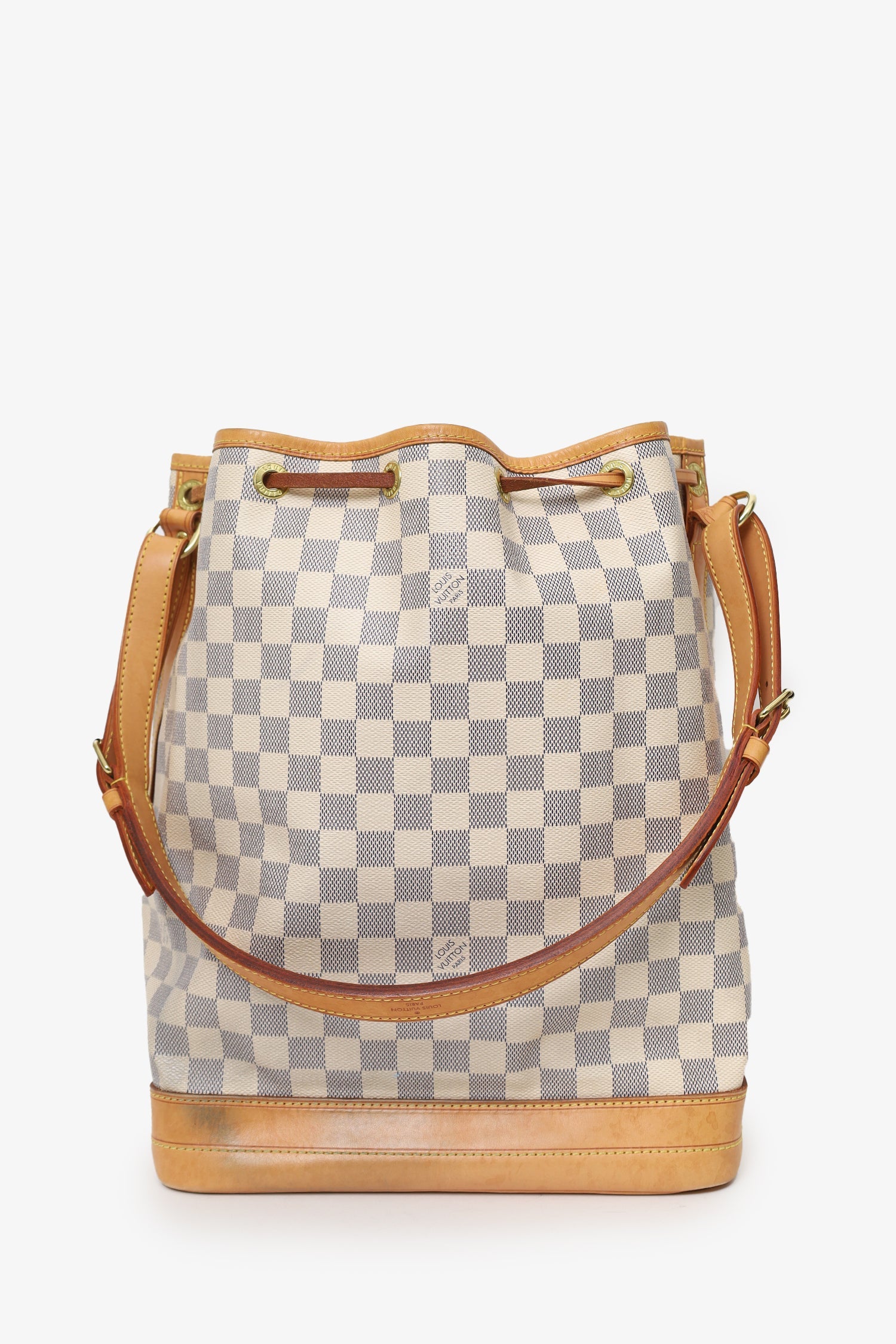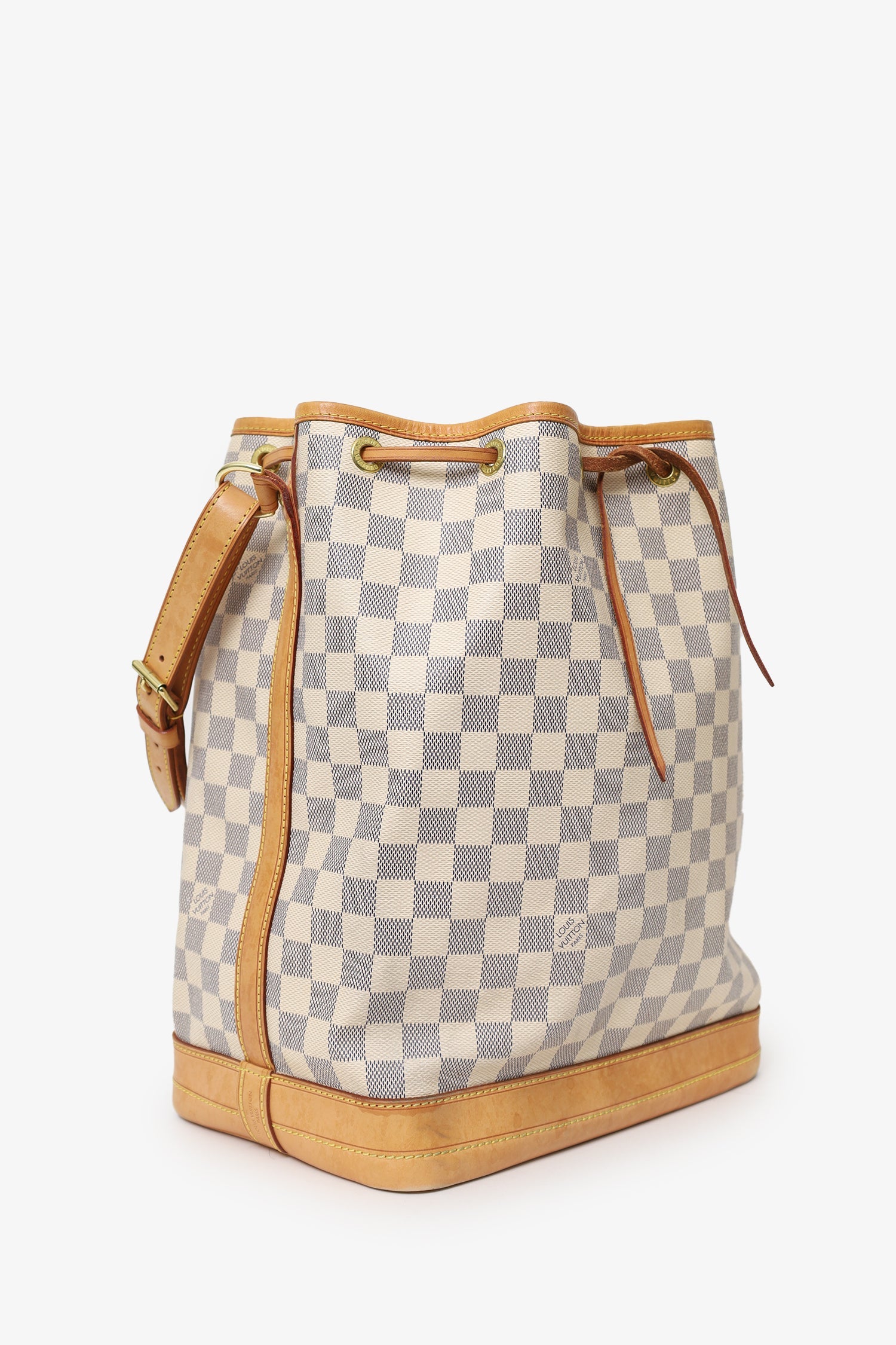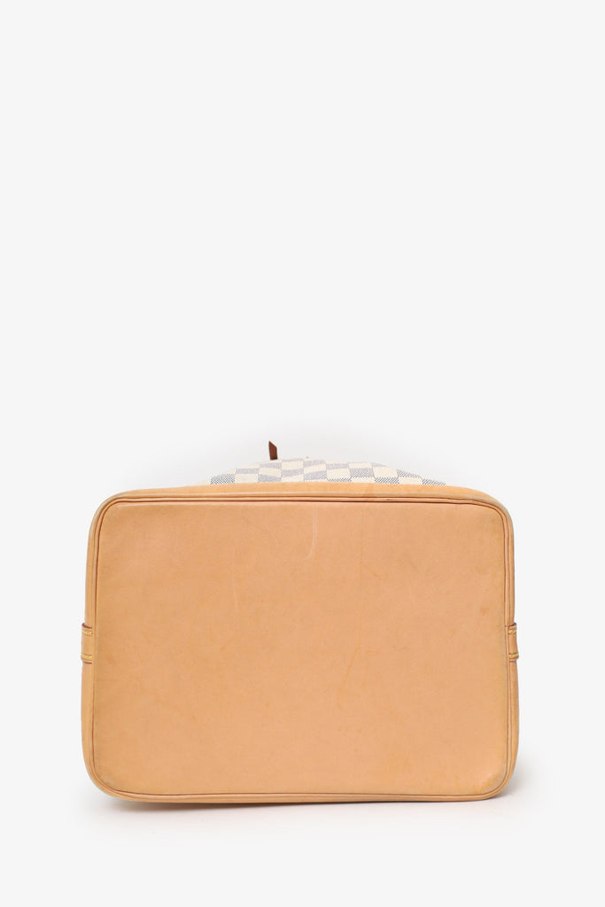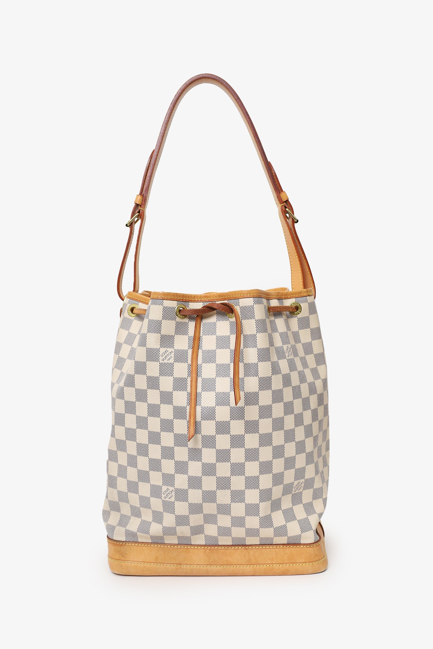 Louis Vuitton Cream Damier Bag. Open top with front tie-up drawstring closure. Adjustable shoulder strap. Canvas-lined interior. Gold-tone hardware. Contrast stitching.
