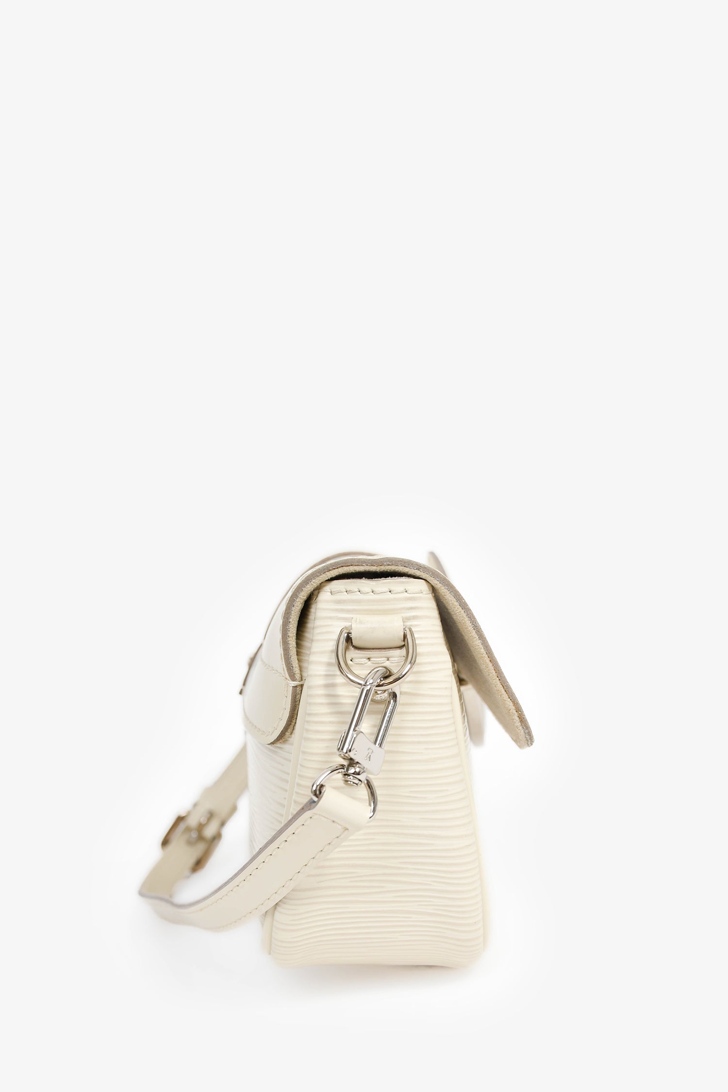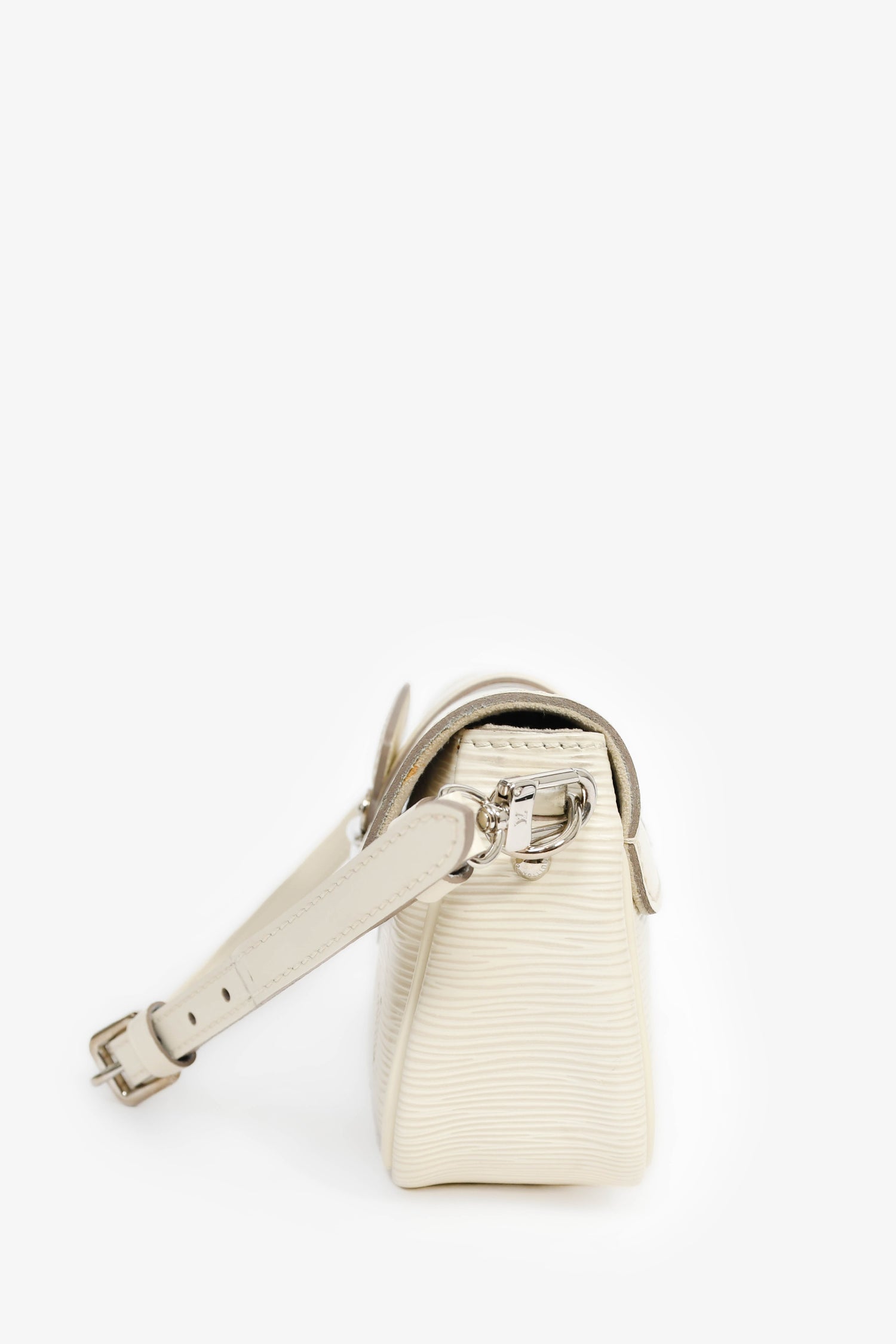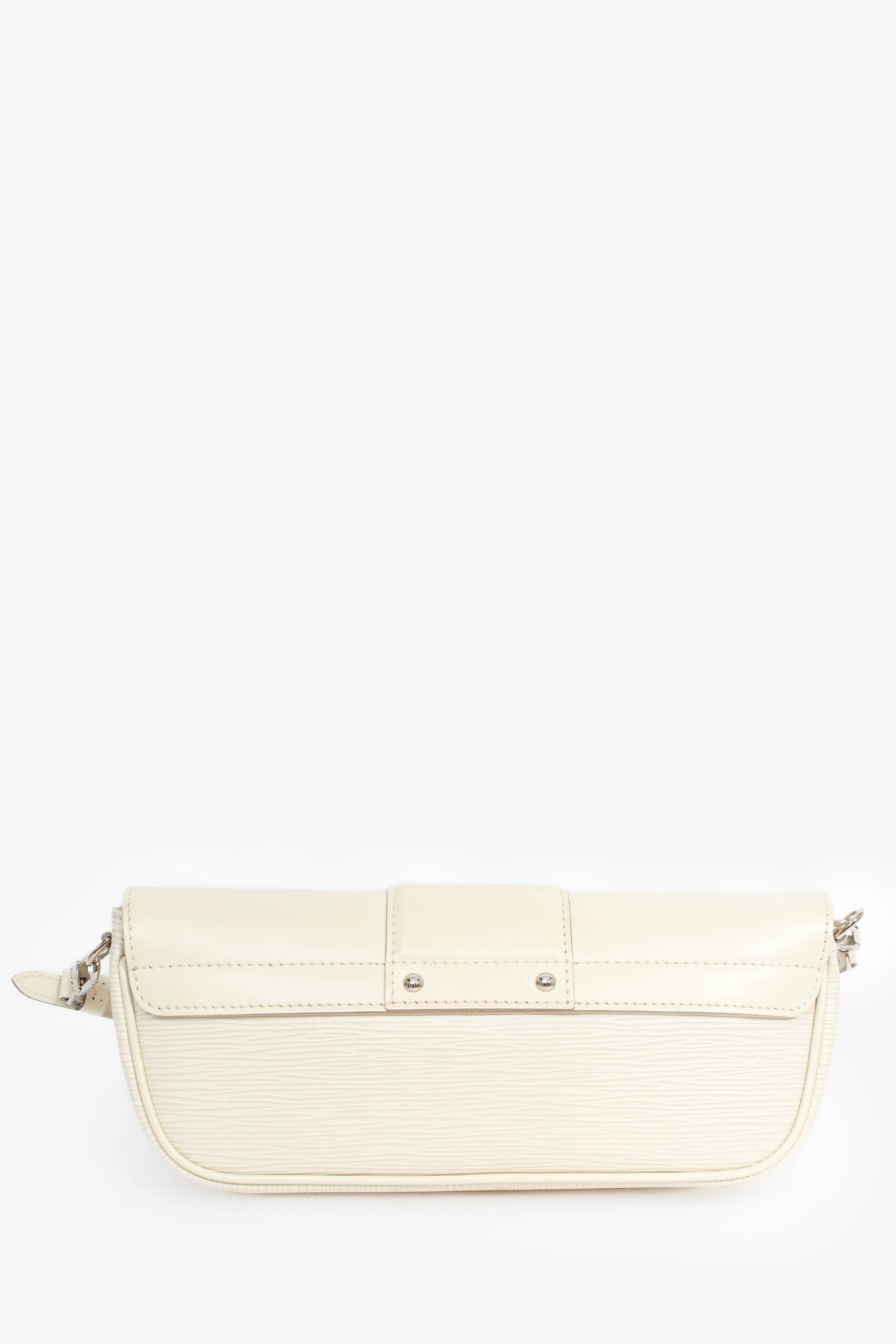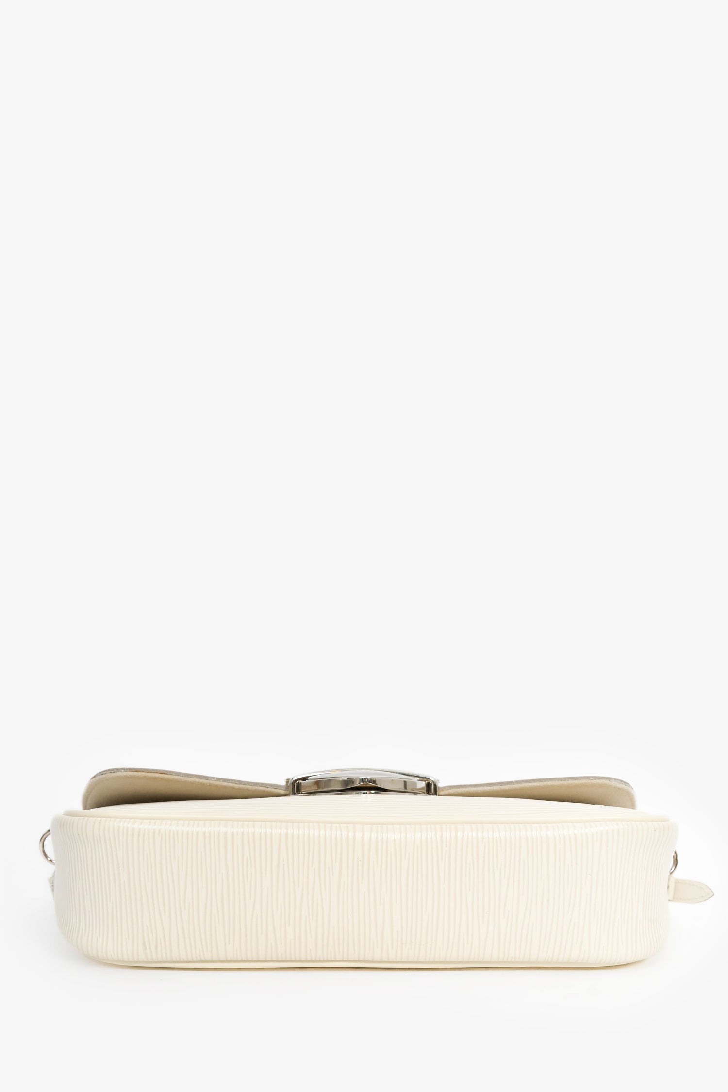 Louis Vuitton Cream Epi Leather 'Suhail' Shoulder Bag. Front fold-over flap with push-lock closure. Adjustable and detachable strap. Suede-lined interior. Single interior wall slip pocket. Silver-tone hardware. Tonal stitching.