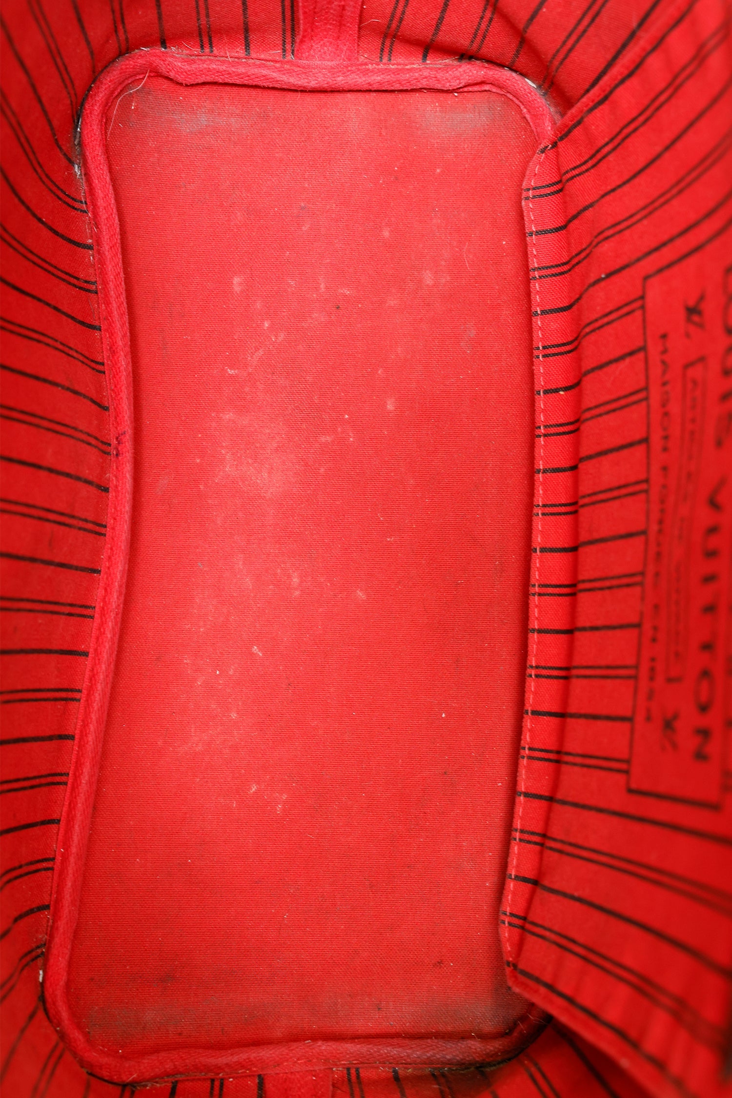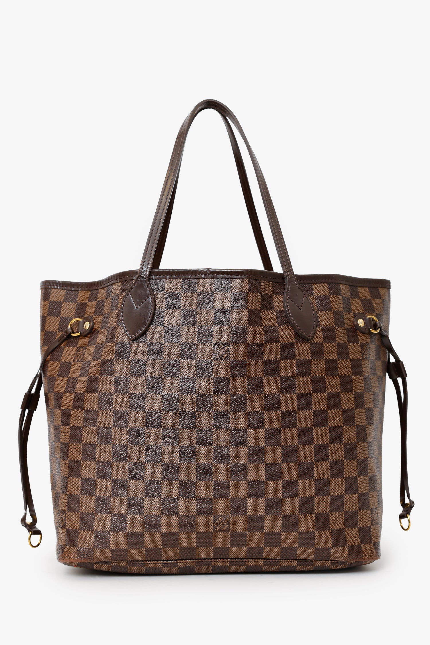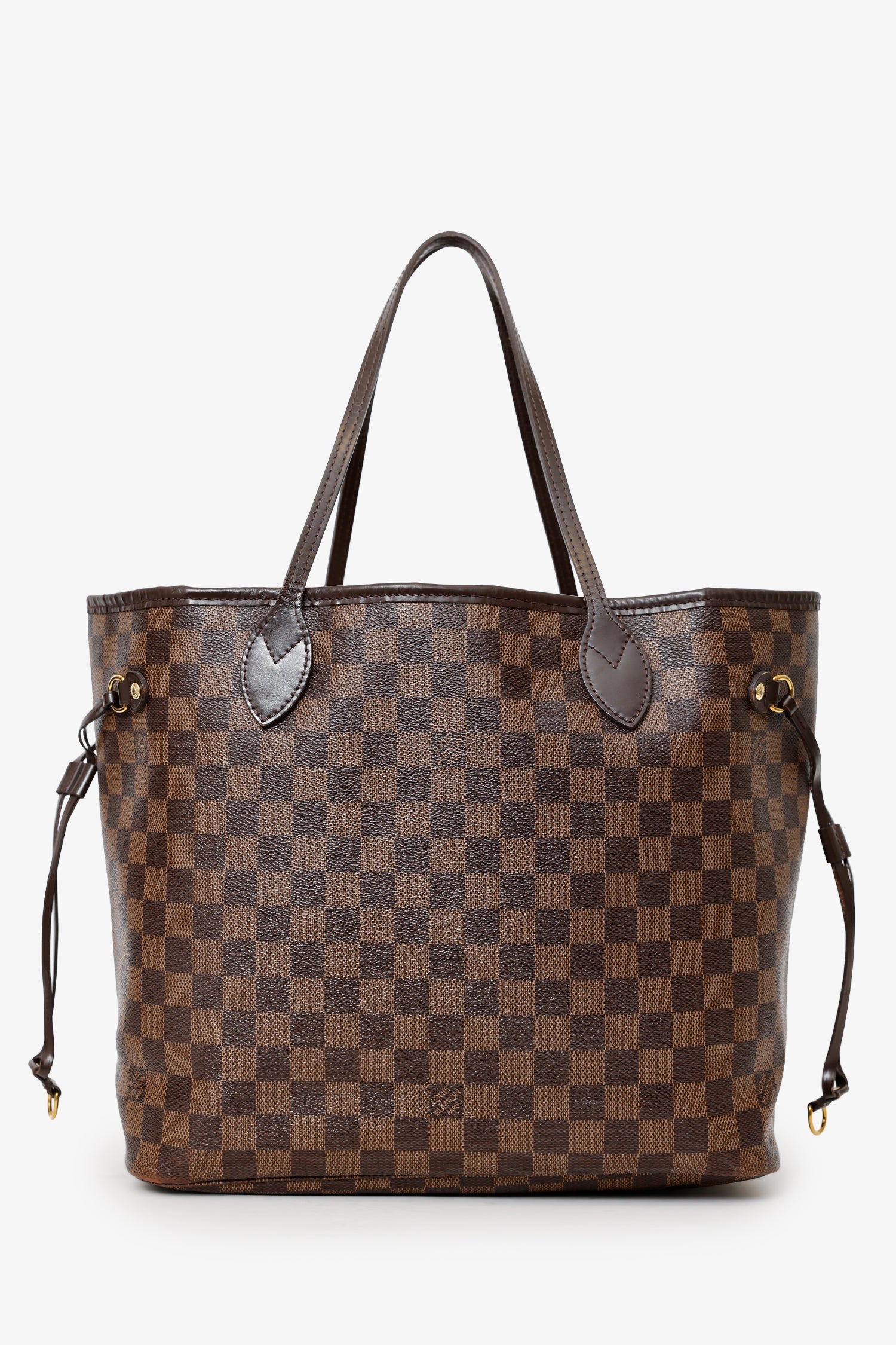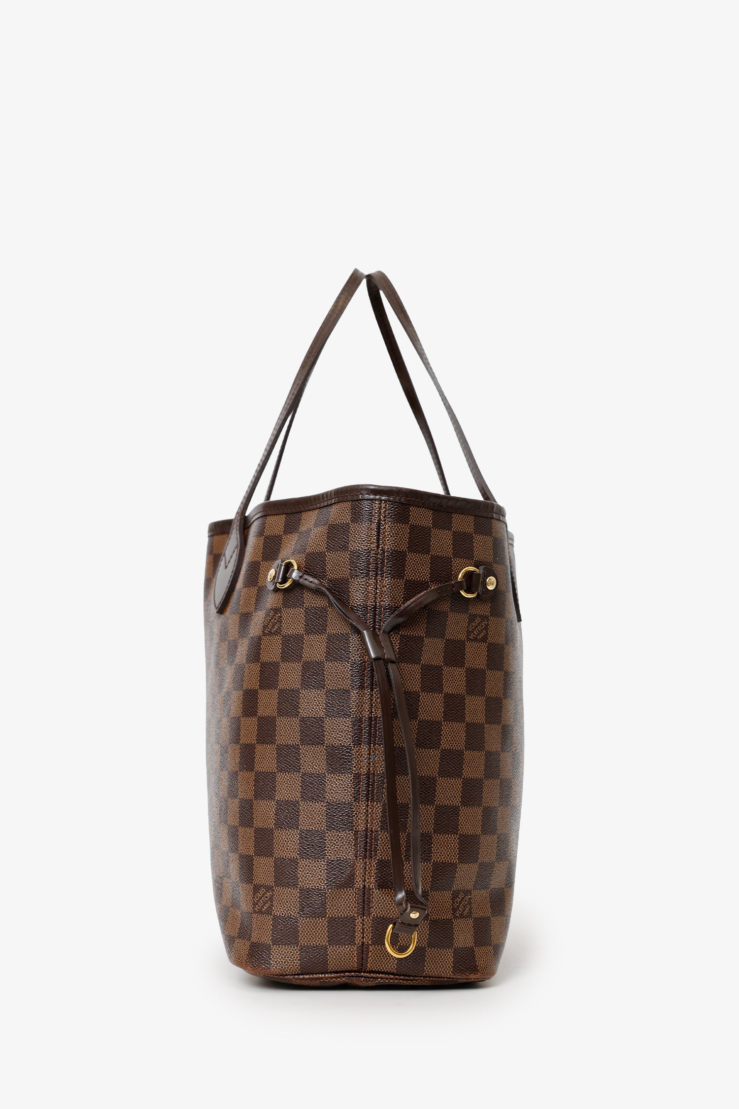 Louis Vuitton Damier Ebene Neverfull MM. Top open with interior clasp closure. Twin shoulder straps. 2 exterior side straps. Canvas-lined interior with rear zip-up pocket. Gold-tone hardware. Tonal stitching.