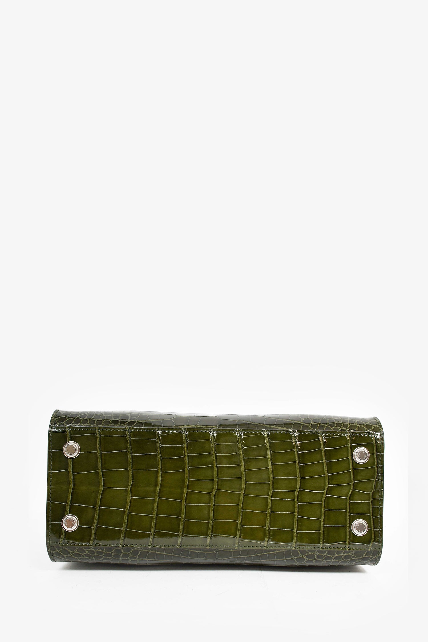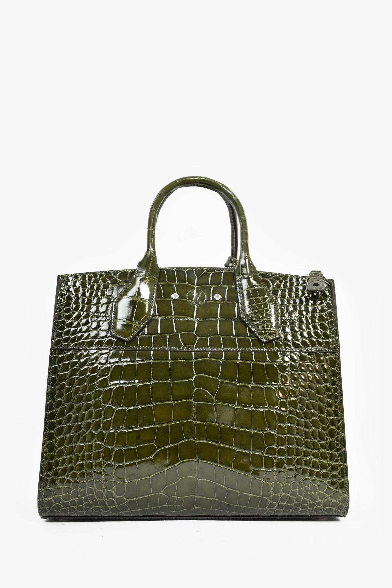 Louis Vuitton Green Alligator Mississippiensis City Steamer MM Top Handle with Strap. Dual rolled handles. Interior latch closure. Two interior wall slip pockets. Tonal leather interior lining. Detachable strap and luggage tag. Protective metal bottom. Silver-tone hardware.