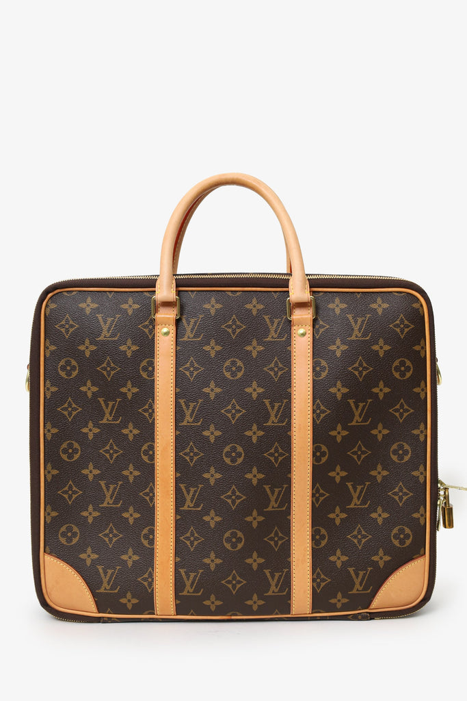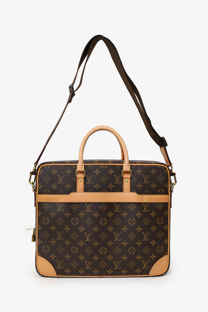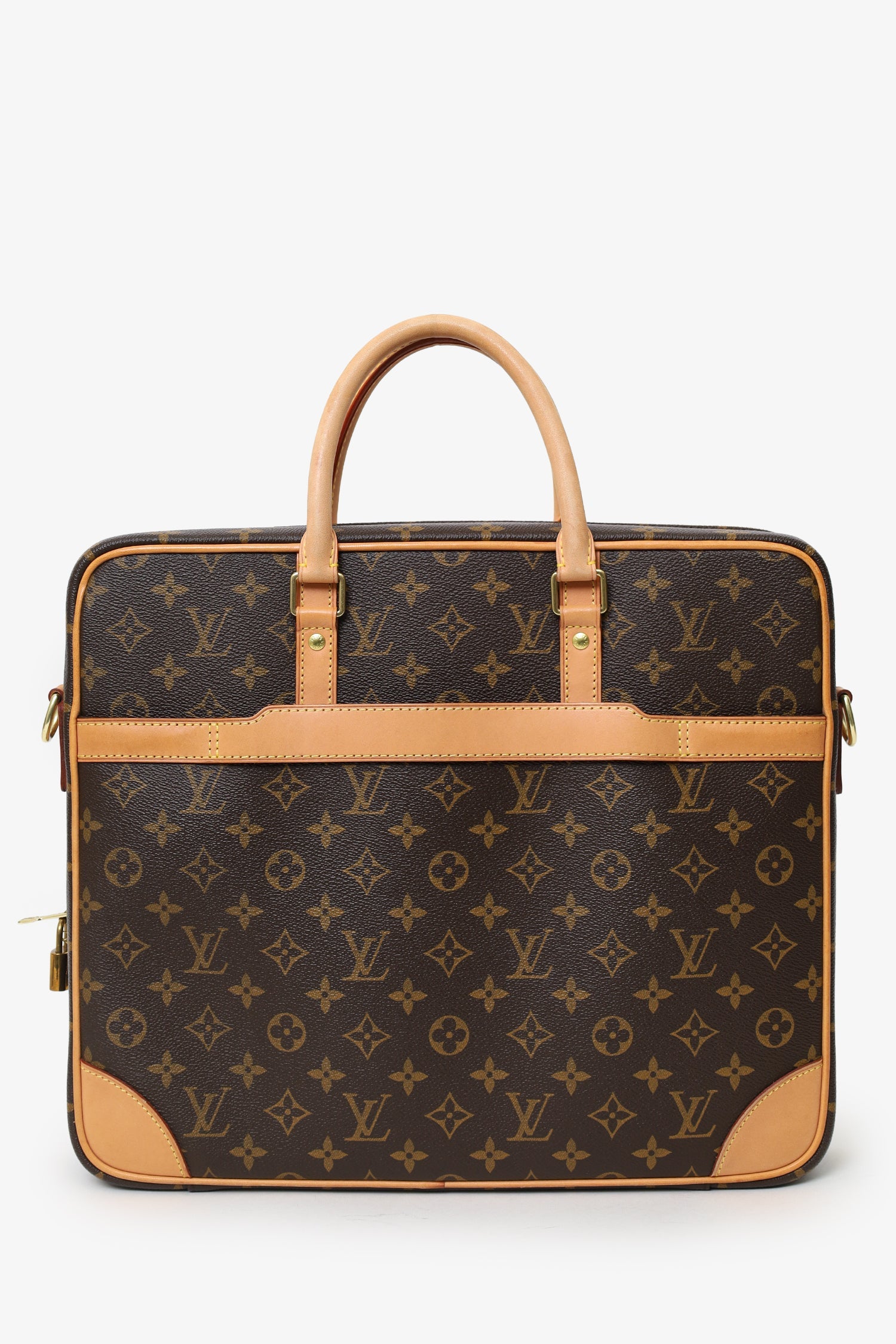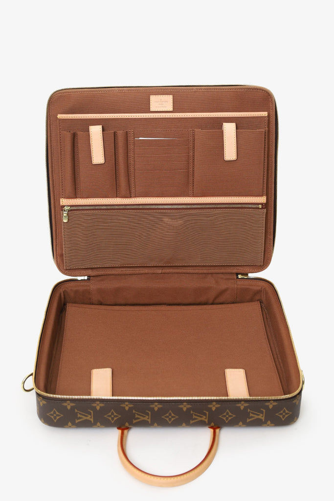 Louis Vuitton Monogram 'Cupertino' Laptop Case. Top wrap-around zip closure. Twin top handles. Adjustable and removable shoulder strap with clasp closure. Lined interior 2 compartments. Front compartment includes 11 pockets; 5 card, 2 velcro, 2 pen, 1 large slip, and 1 zip. Rear compartment includes 1 large laptop sleeve with velcro closure. Additional lock-and-key. Gold-tone hardware. Contrast and tonal stitching.