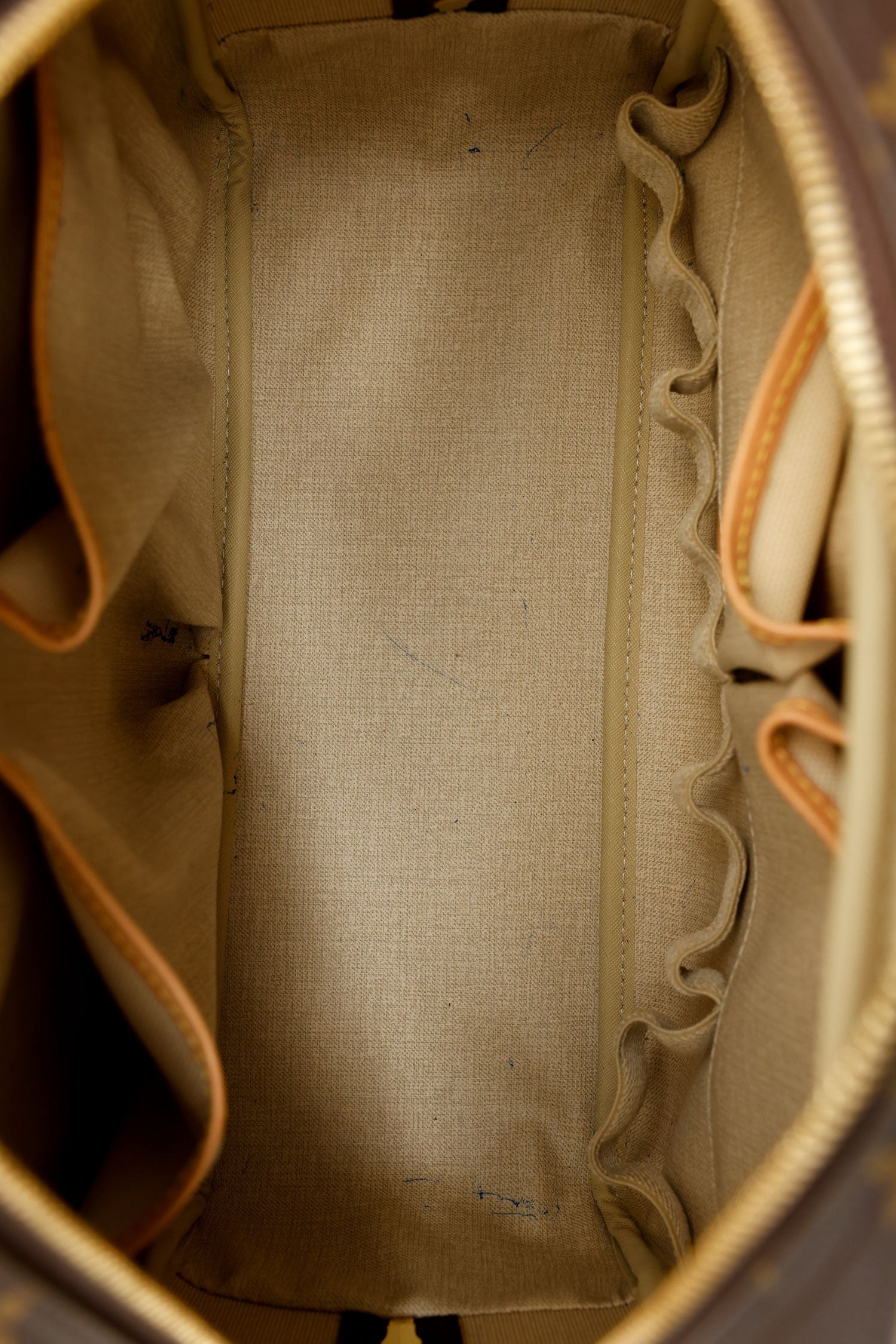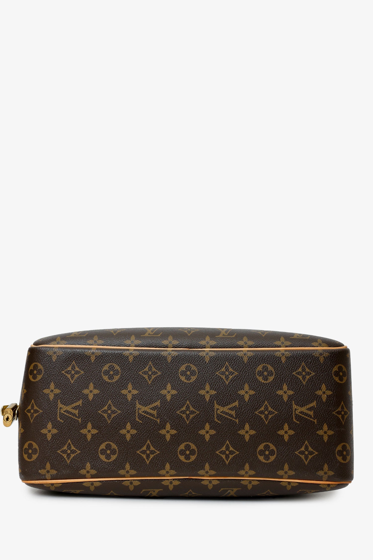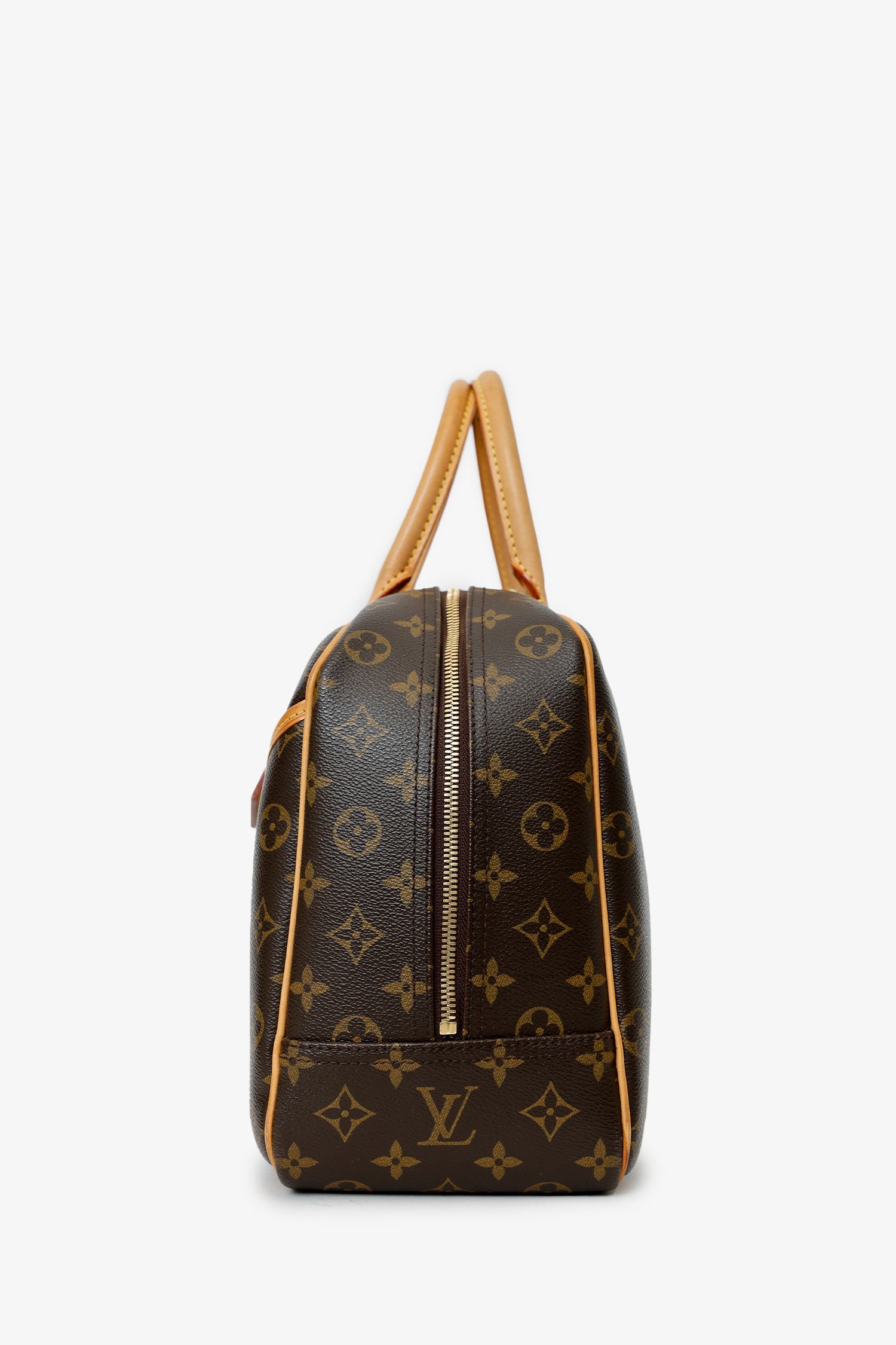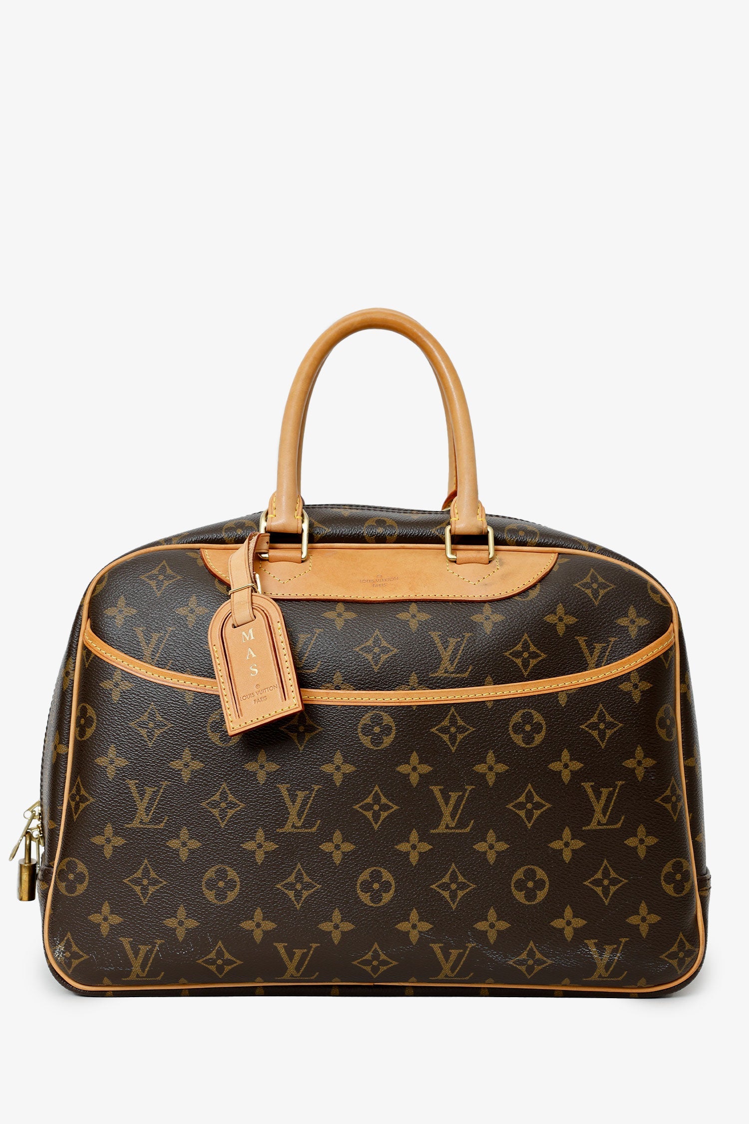 Louis Vuitton Monogram Deauville Top Handle. Top zip closure. Twin top handles. Single front exterior slip pocket. Lined interior. Interior elasticized band. 4 slip pockets. Removable clochette with push-pin buckle closure. Gold-tone hardware. Tonal and contrast stitching.