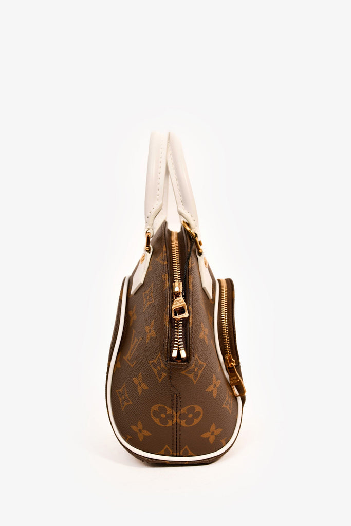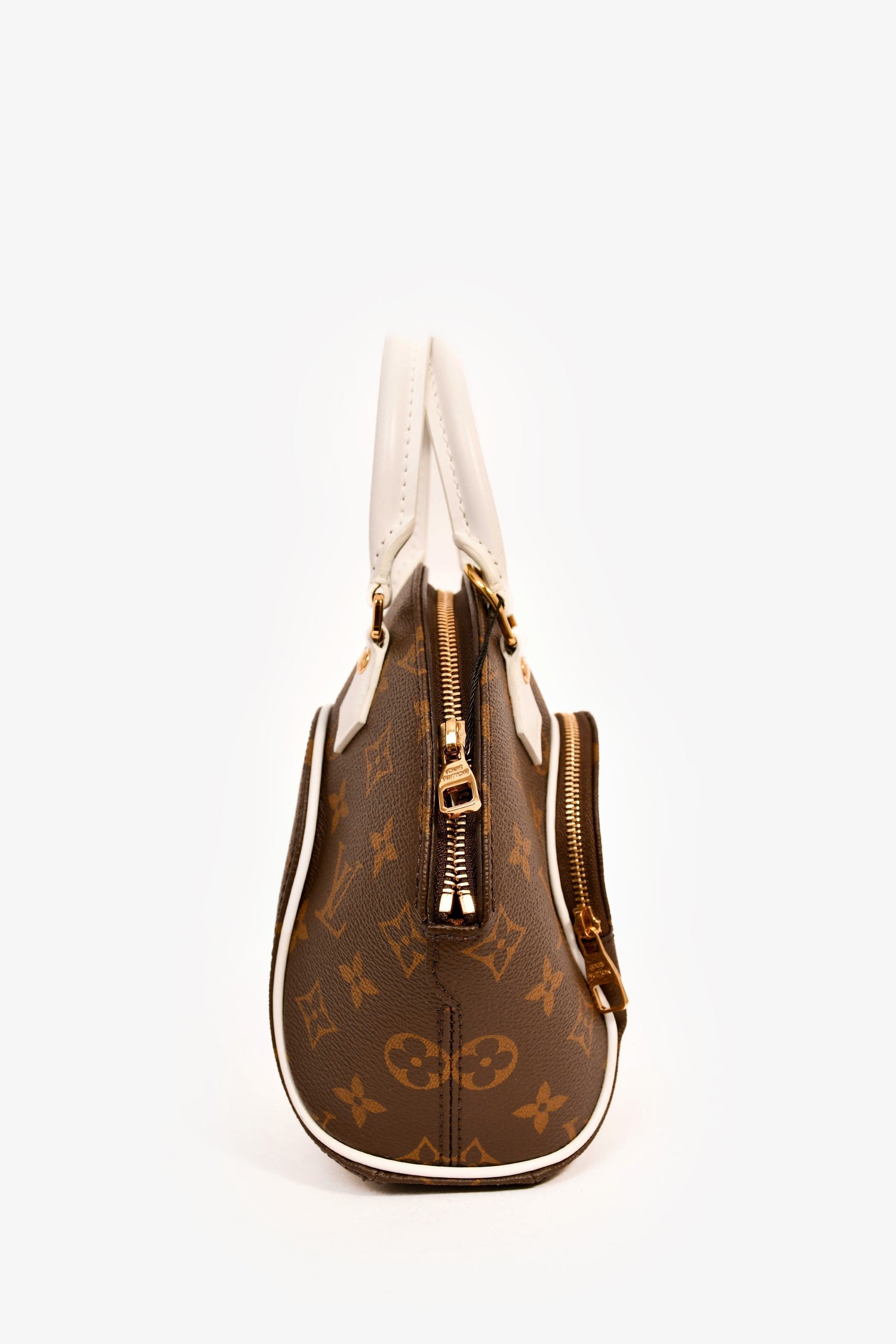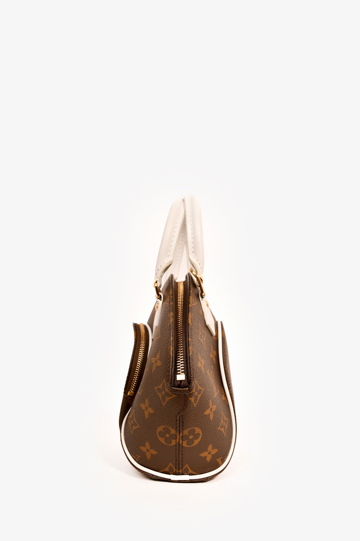Louis Vuitton Monogram White Accent Leather 'Elipse BB' Top Handle with Strap. Dual handles. Front zip pocket. Top zip closure. Brown textile interior lining. Open interior. Detachable and adjustable strap. Gold-tone hardware.