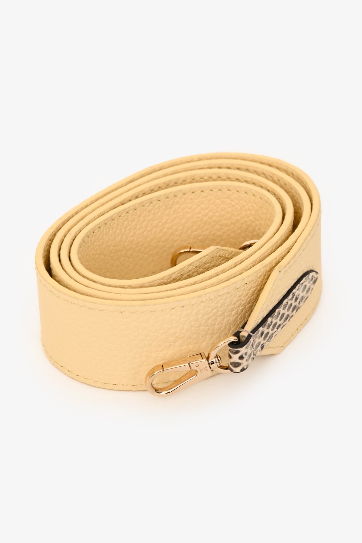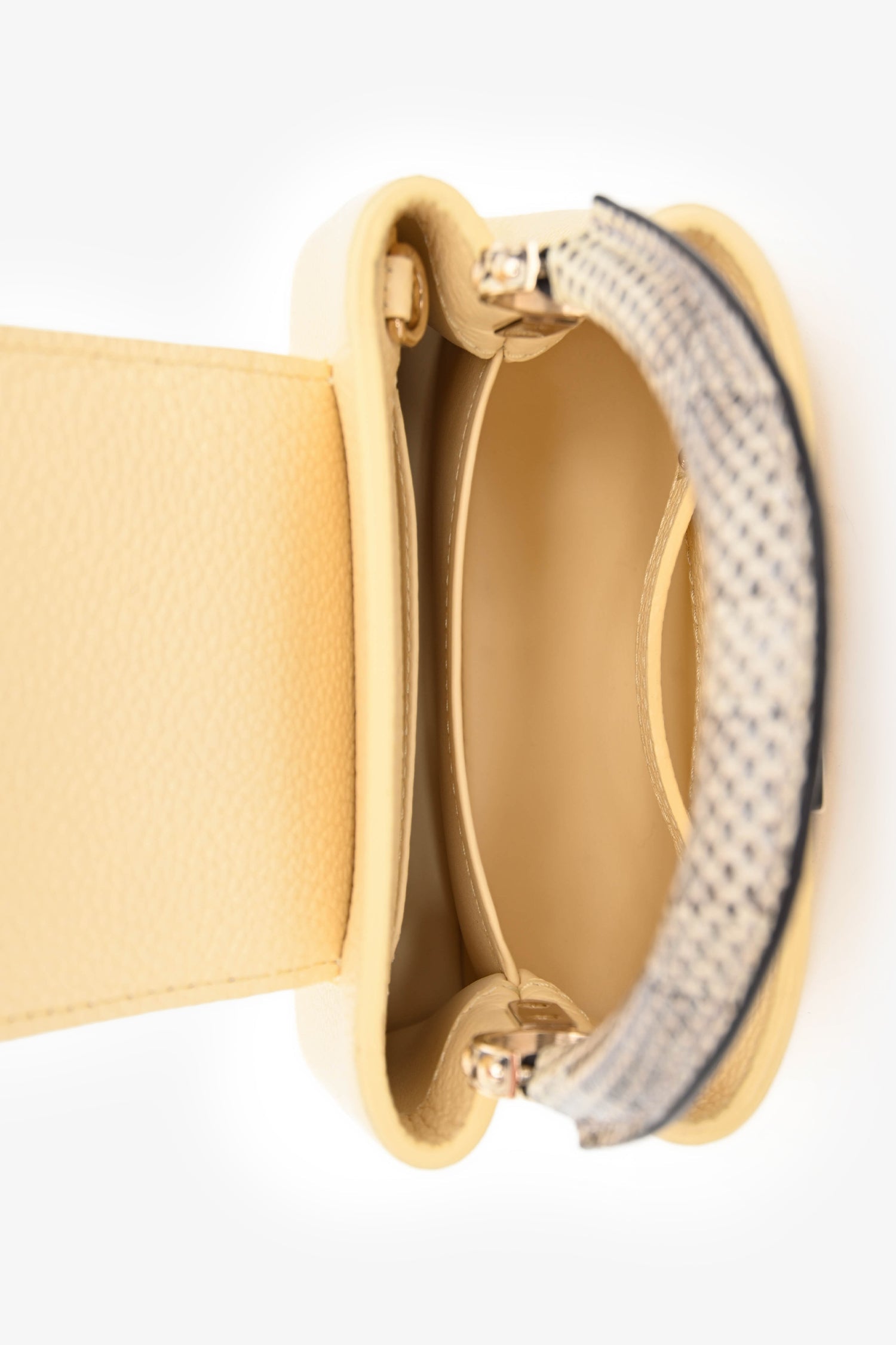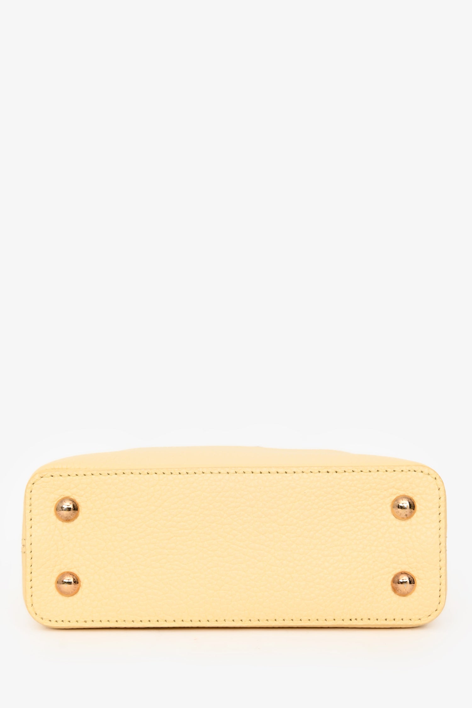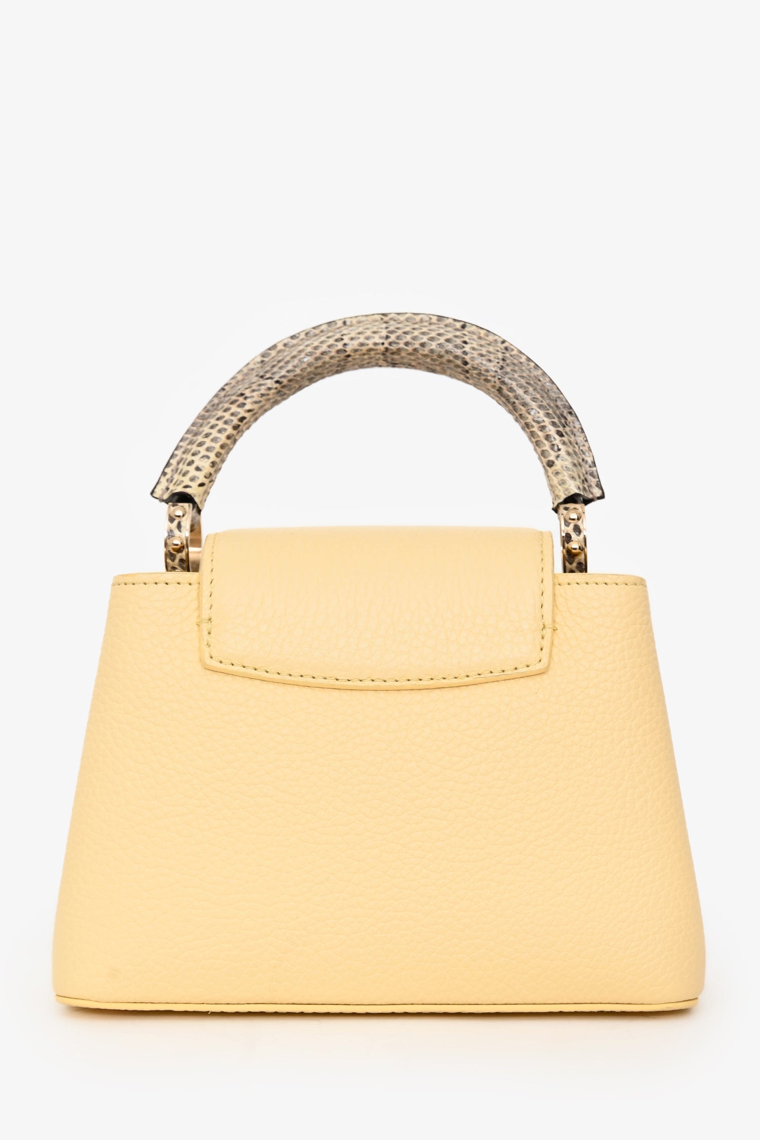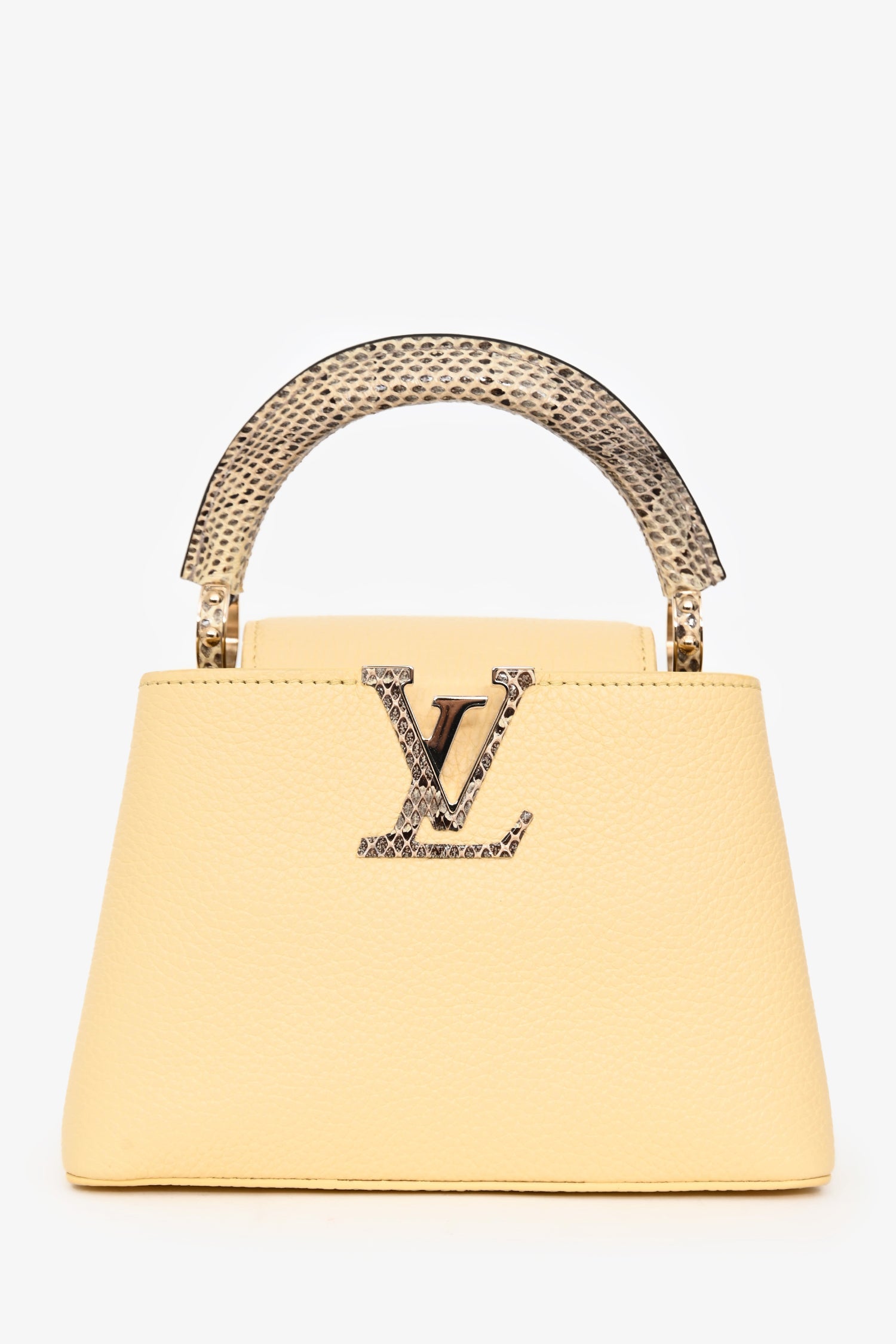 Louis Vuitton Pale Yellow Grained Leather Python Trim Mini Capucines Top Handle with Strap. Fold-over flap. Single top handle. Removable strap with lobster clasp closure. Protective studs on bottom. Leather-lined interior. 2 interior compartments. 1 interior wall pocket. Gold-tone hardware. Tonal stitching.