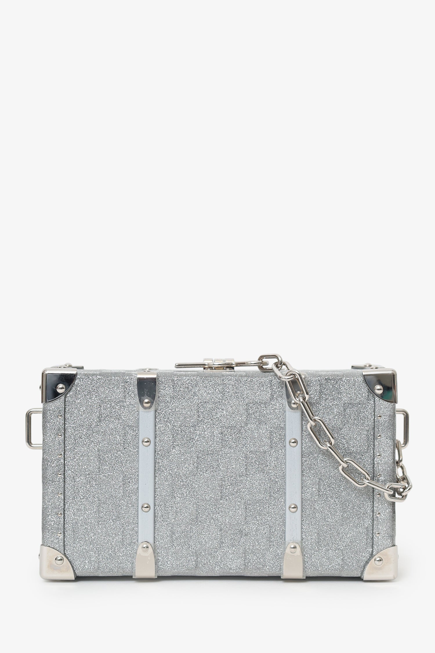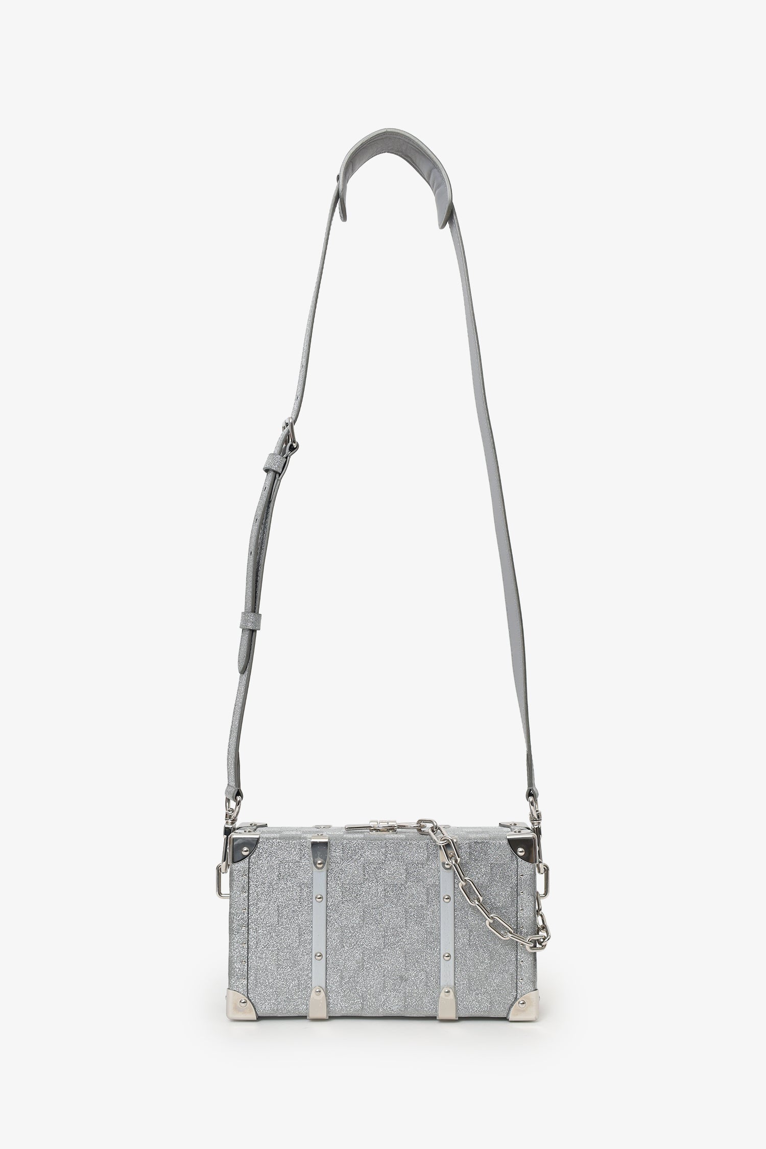 Louis Vuitton Silver Glitter Aluminum Monogram Special Order Briefcase Trunk With Strap. Top pull-lock closure. Adjustable and removable crossbody strap with clasp closure. Lined interior with 9 pockets; 6 card slots, and 3 slip. Removable bag tag. Silver-tone hardware. Tonal stitching.