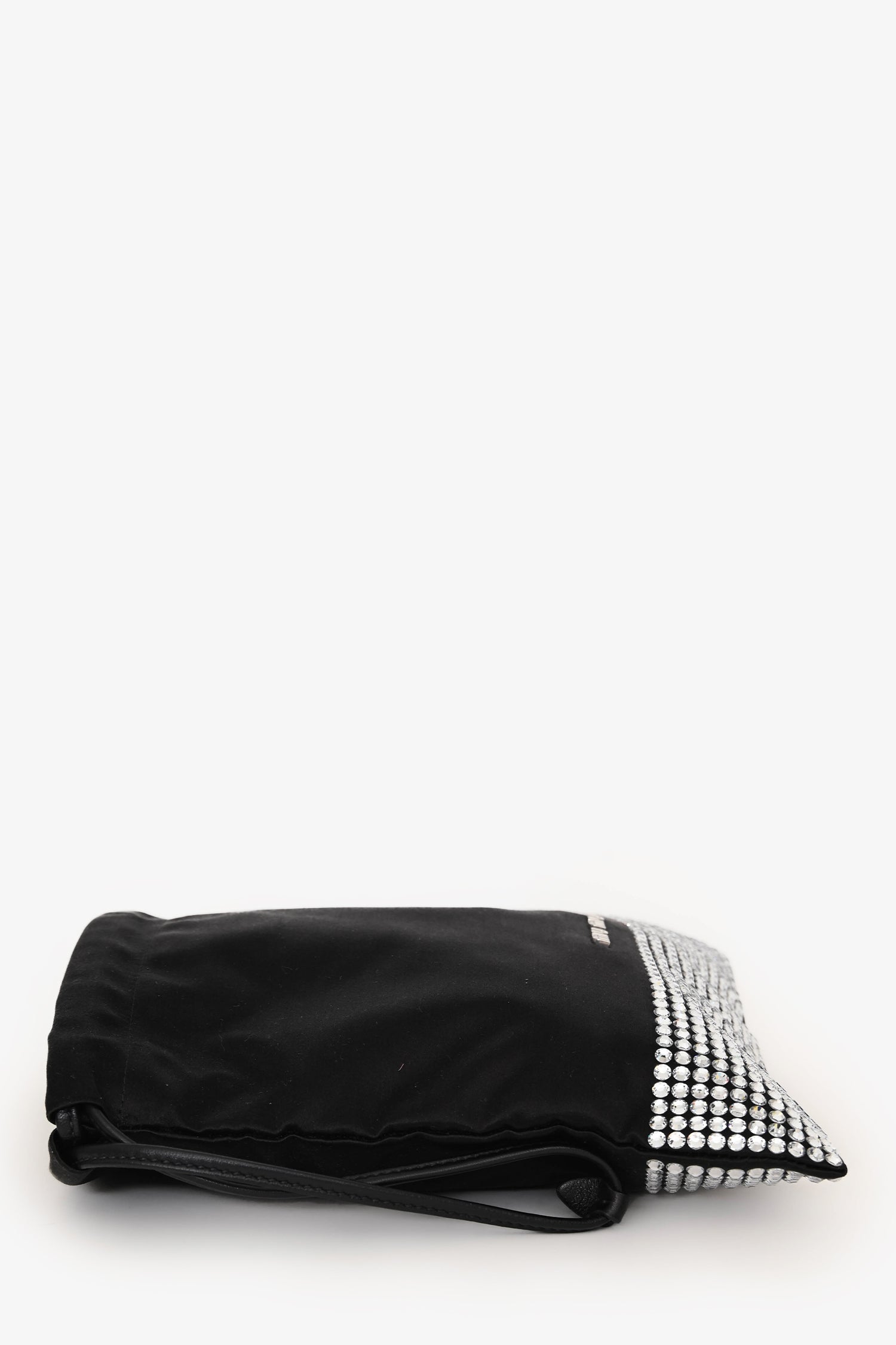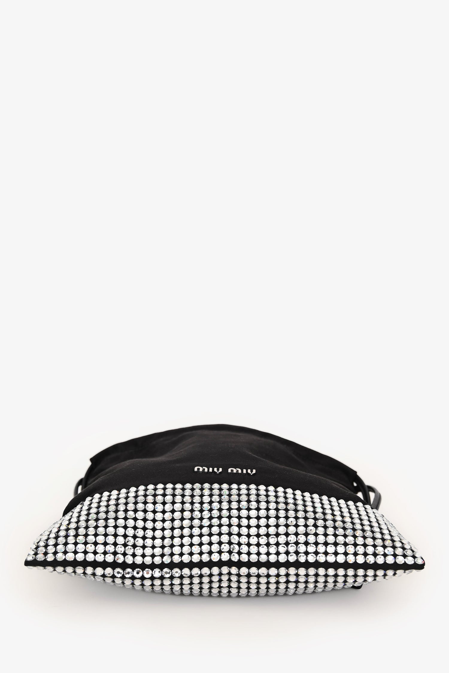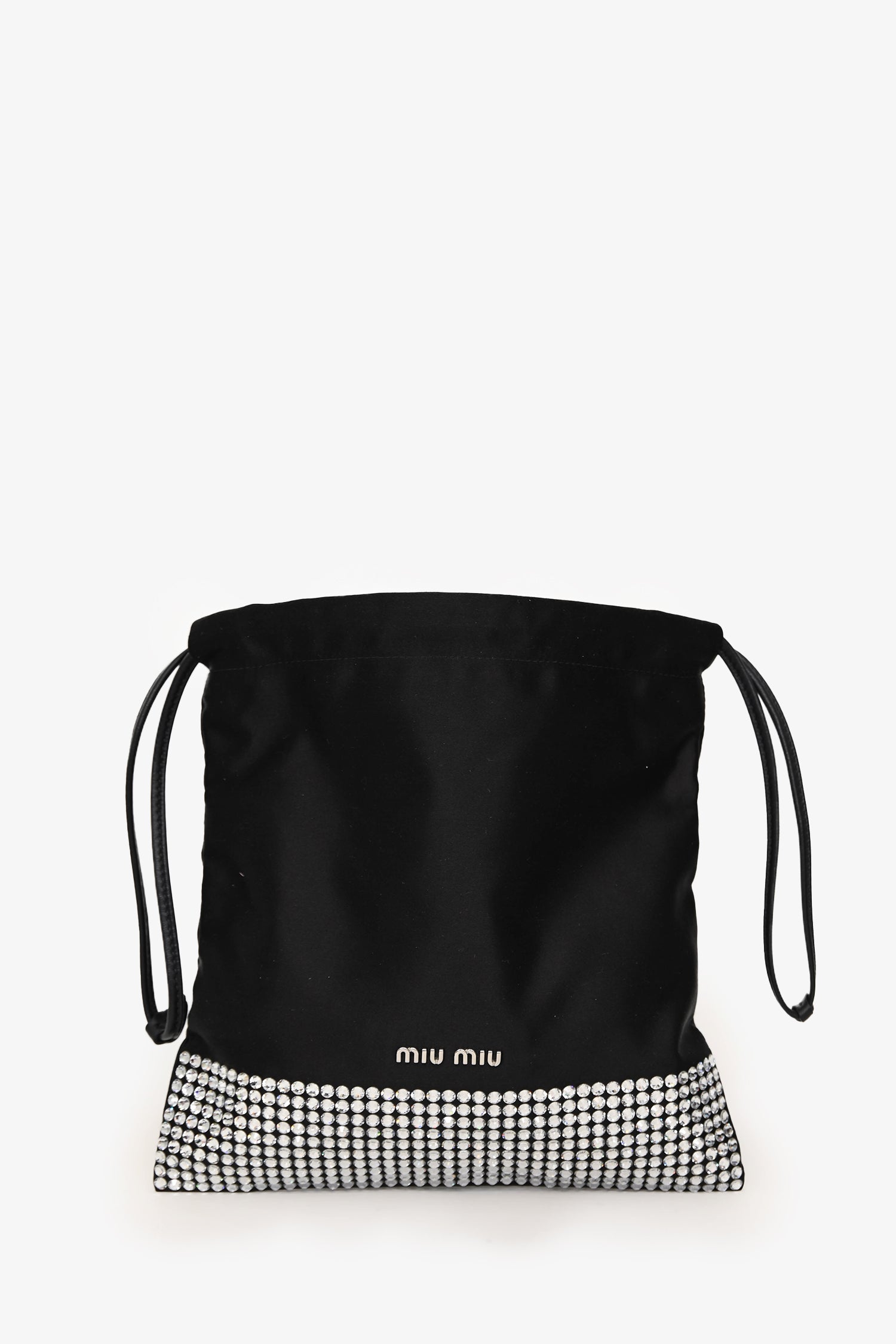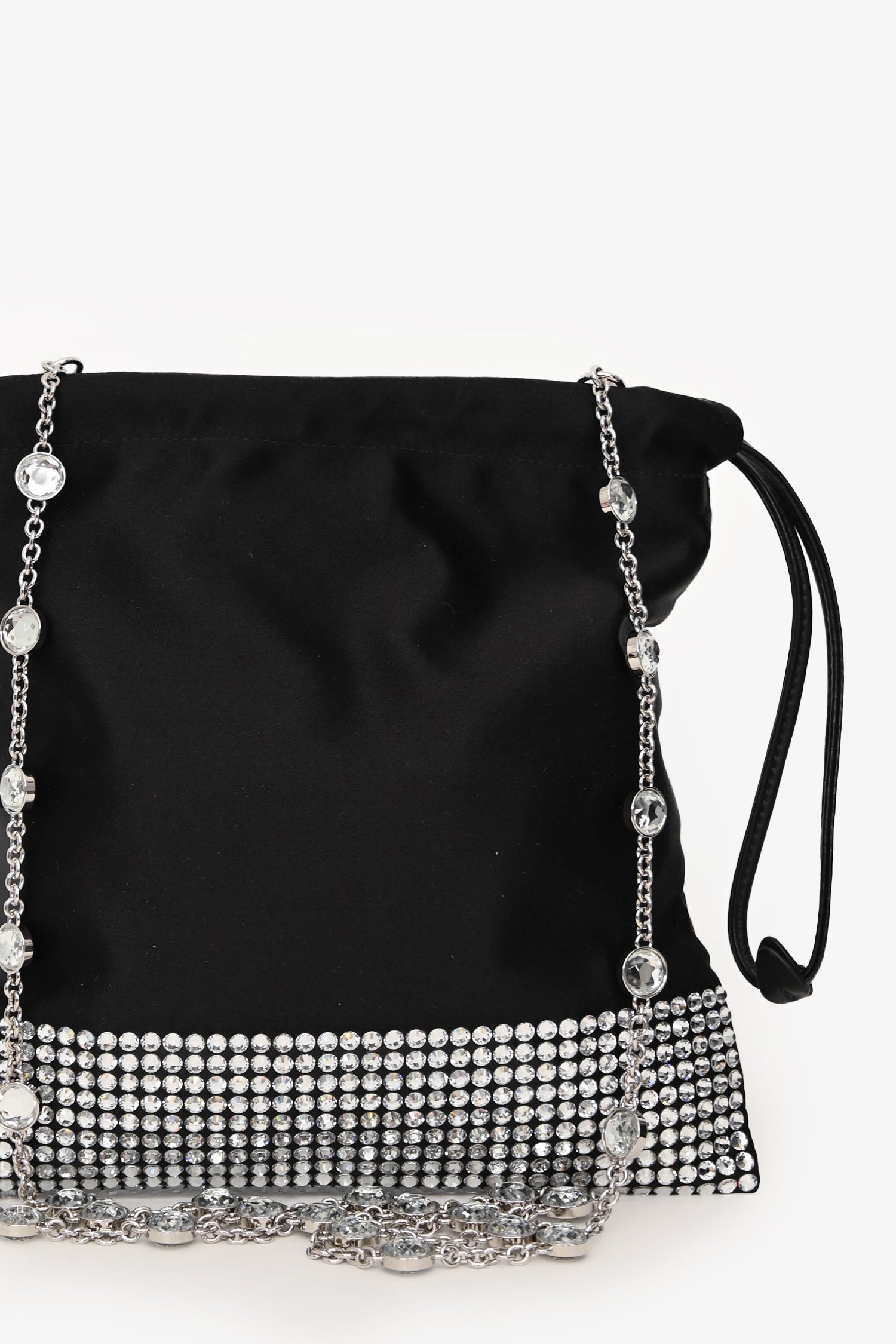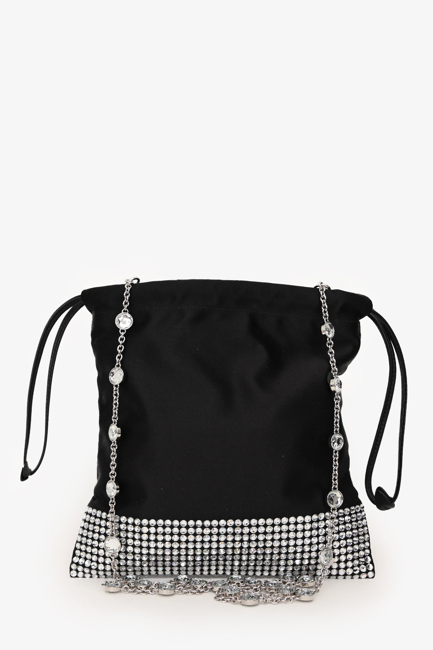 Miu Miu Black Satin Crystal Embellished Chain Crossbody. Top cinch closure with side pull strings. Detachable chain strap. Lined interior. Single interior wall slip pocket. Silver-tone hardware. Tonal stitching.