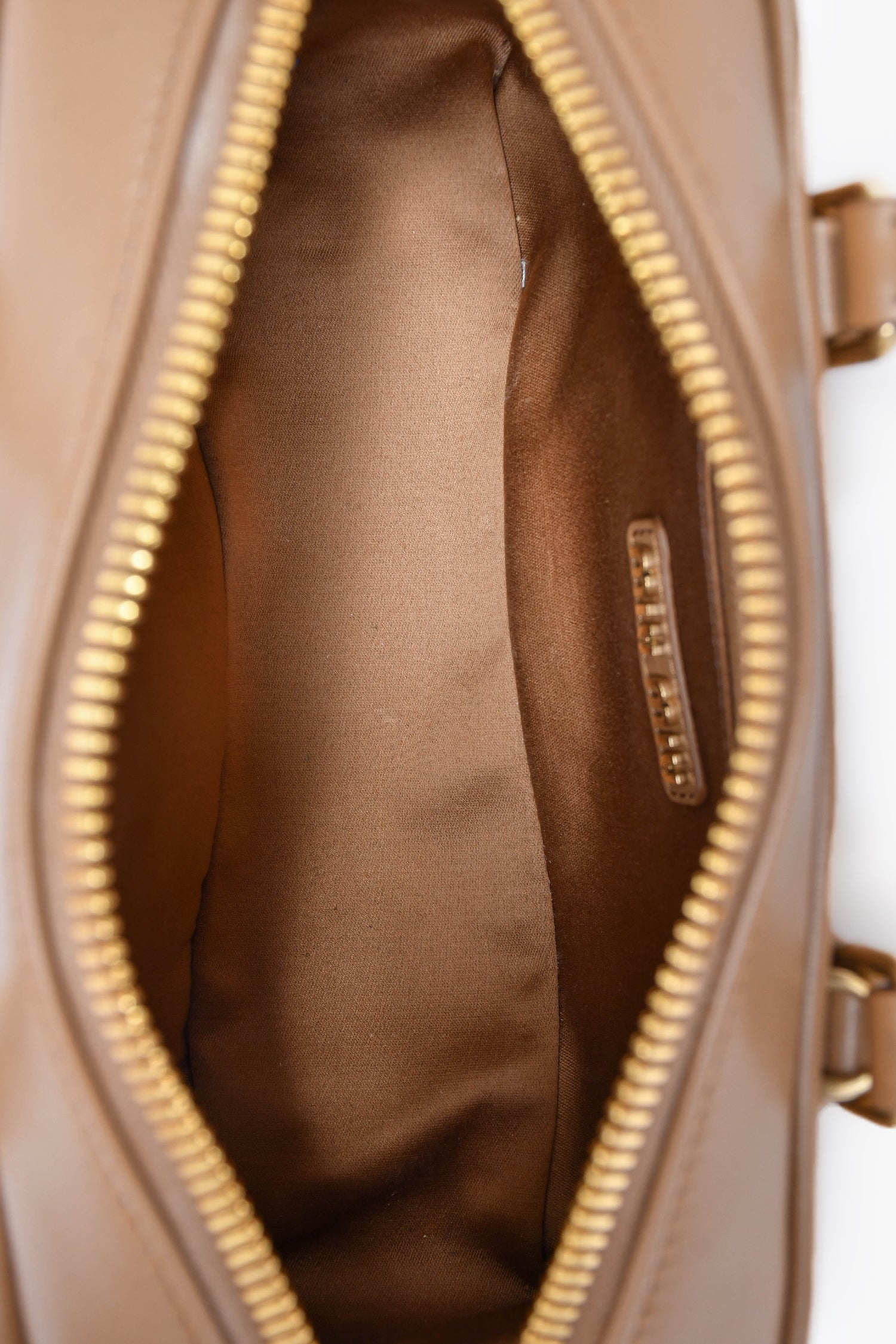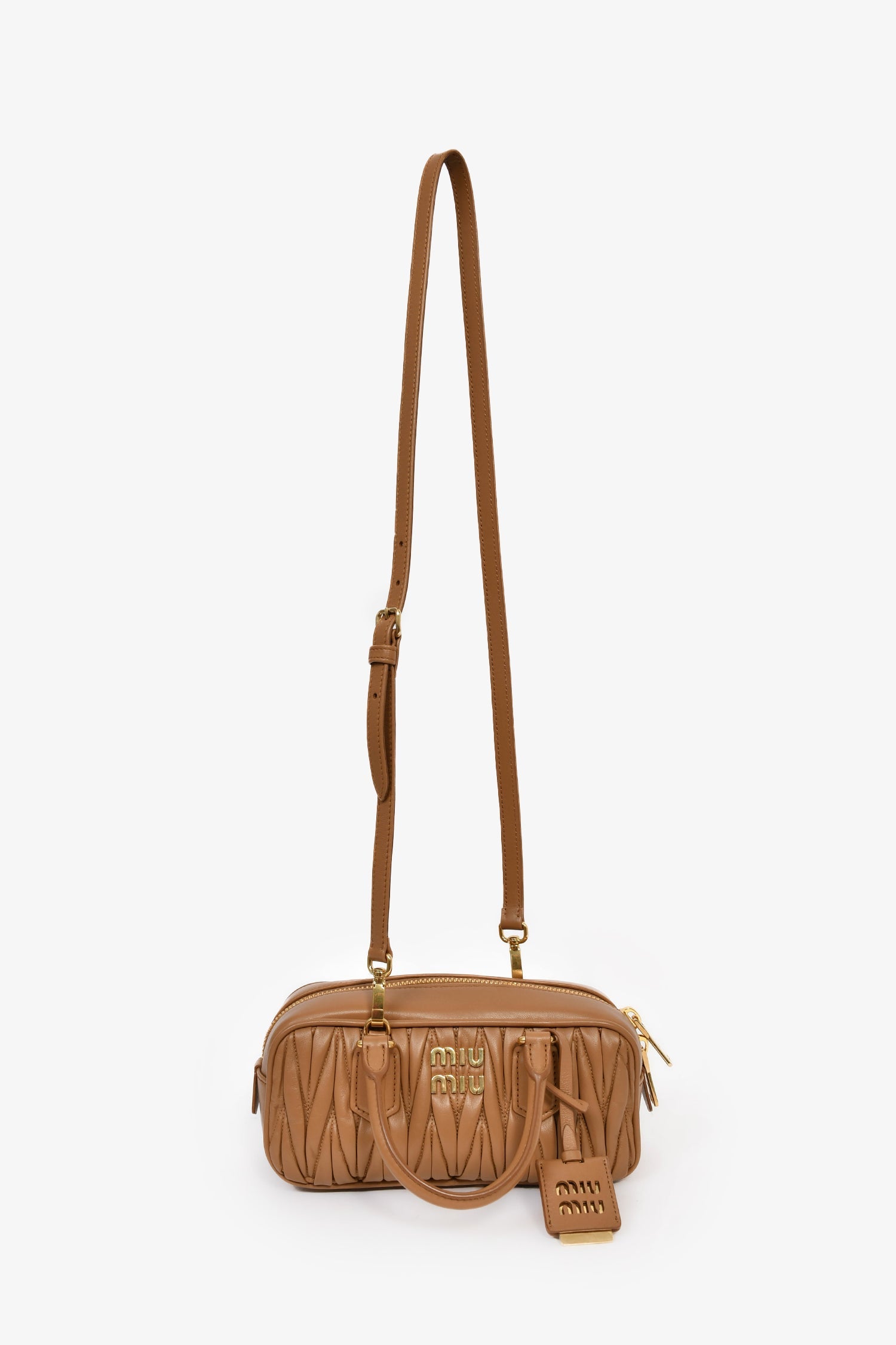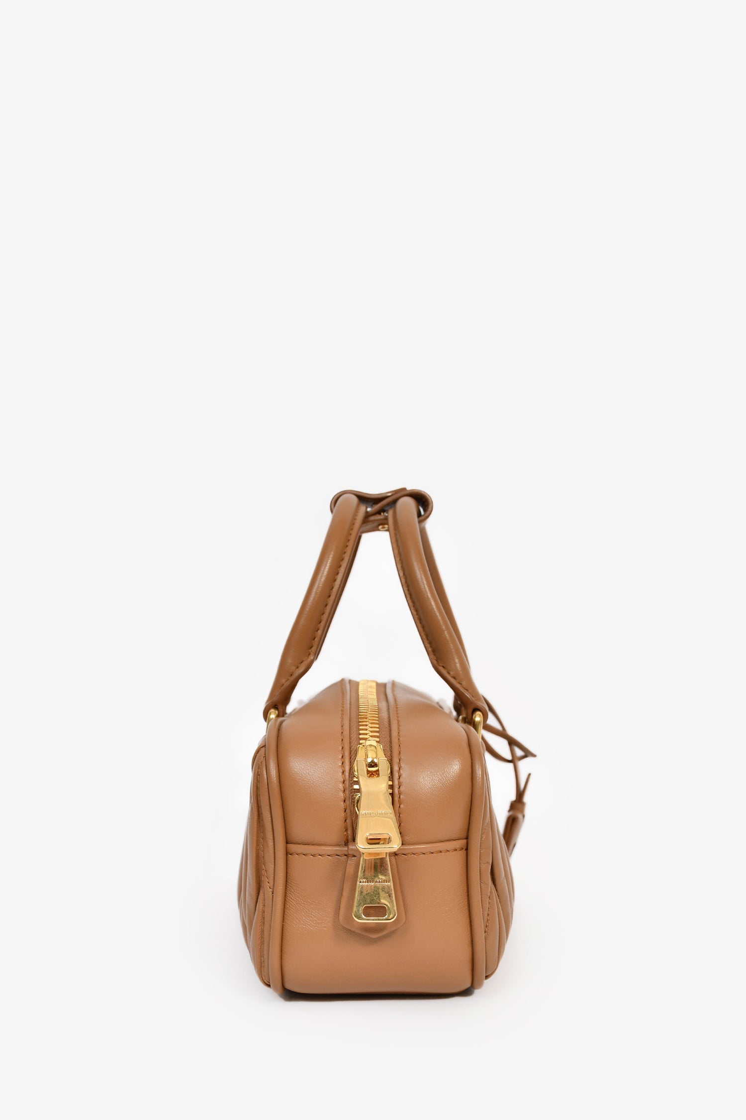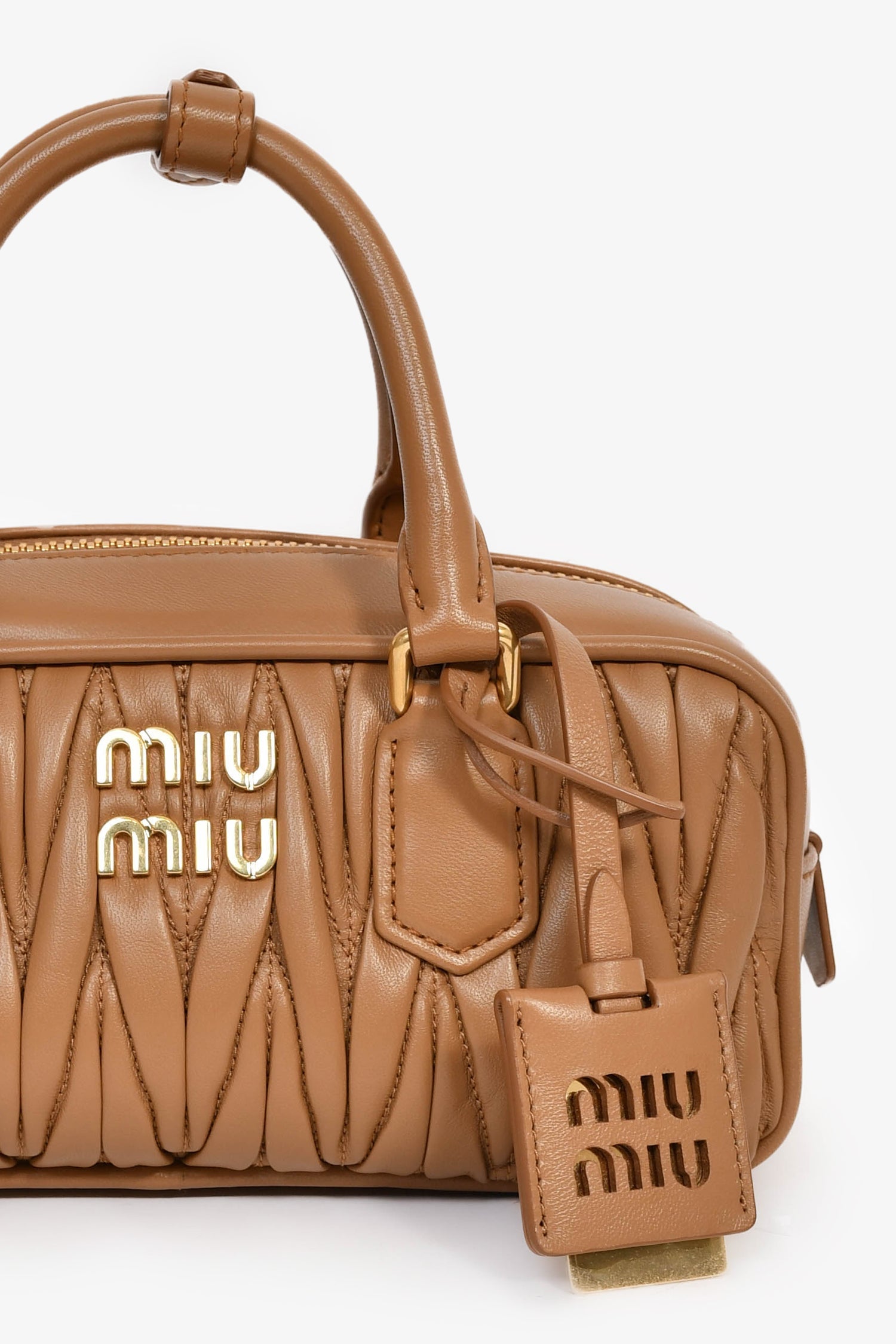 Miu Miu Caramel Nappa Leather Arcadie Matelassé Top Handle. Zip-around closure. Dual rolled handles and detachable leather strap. Satin-lined interior. Attached clochette. Gold-tone hardware. Tonal stitching.