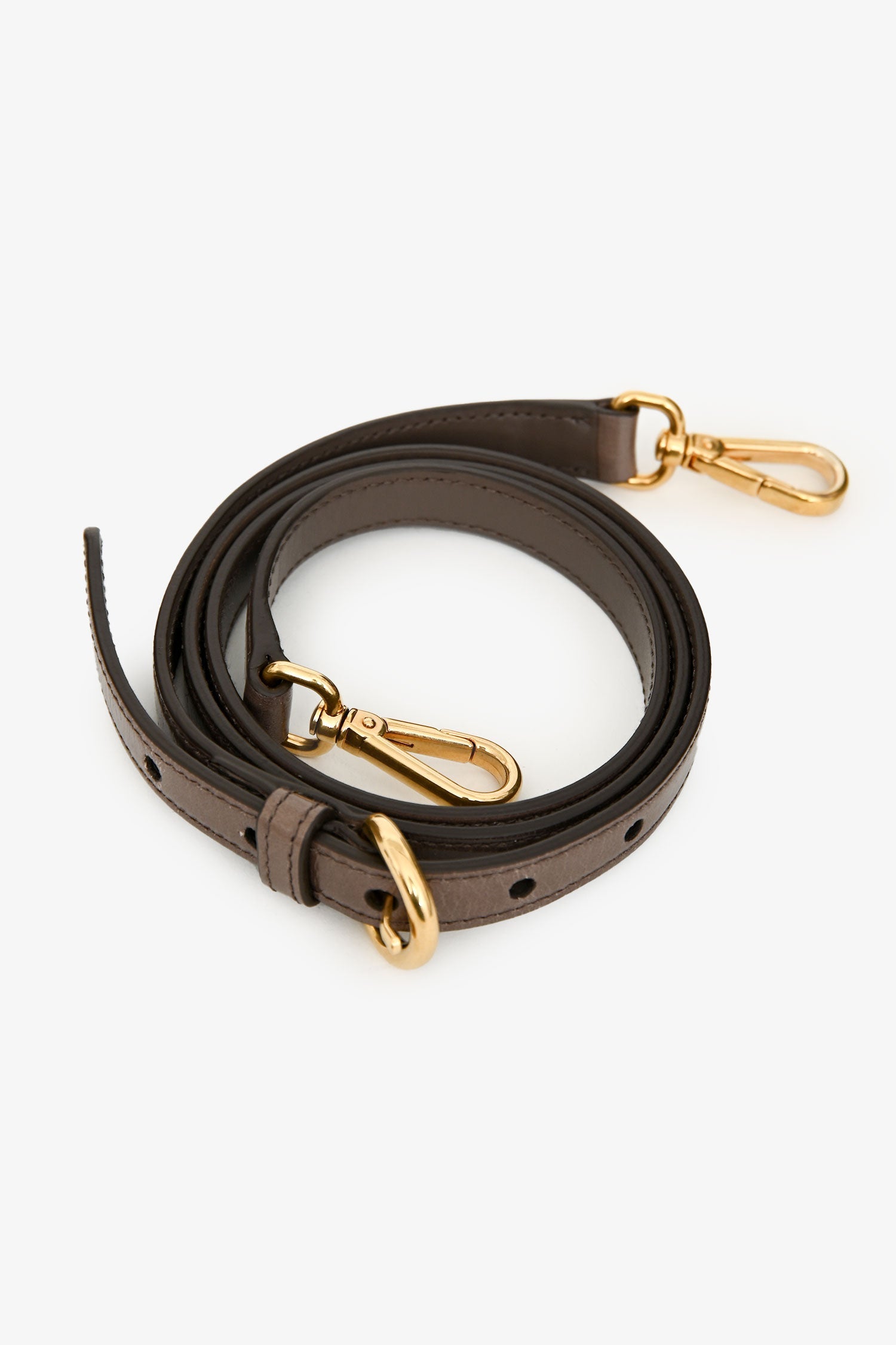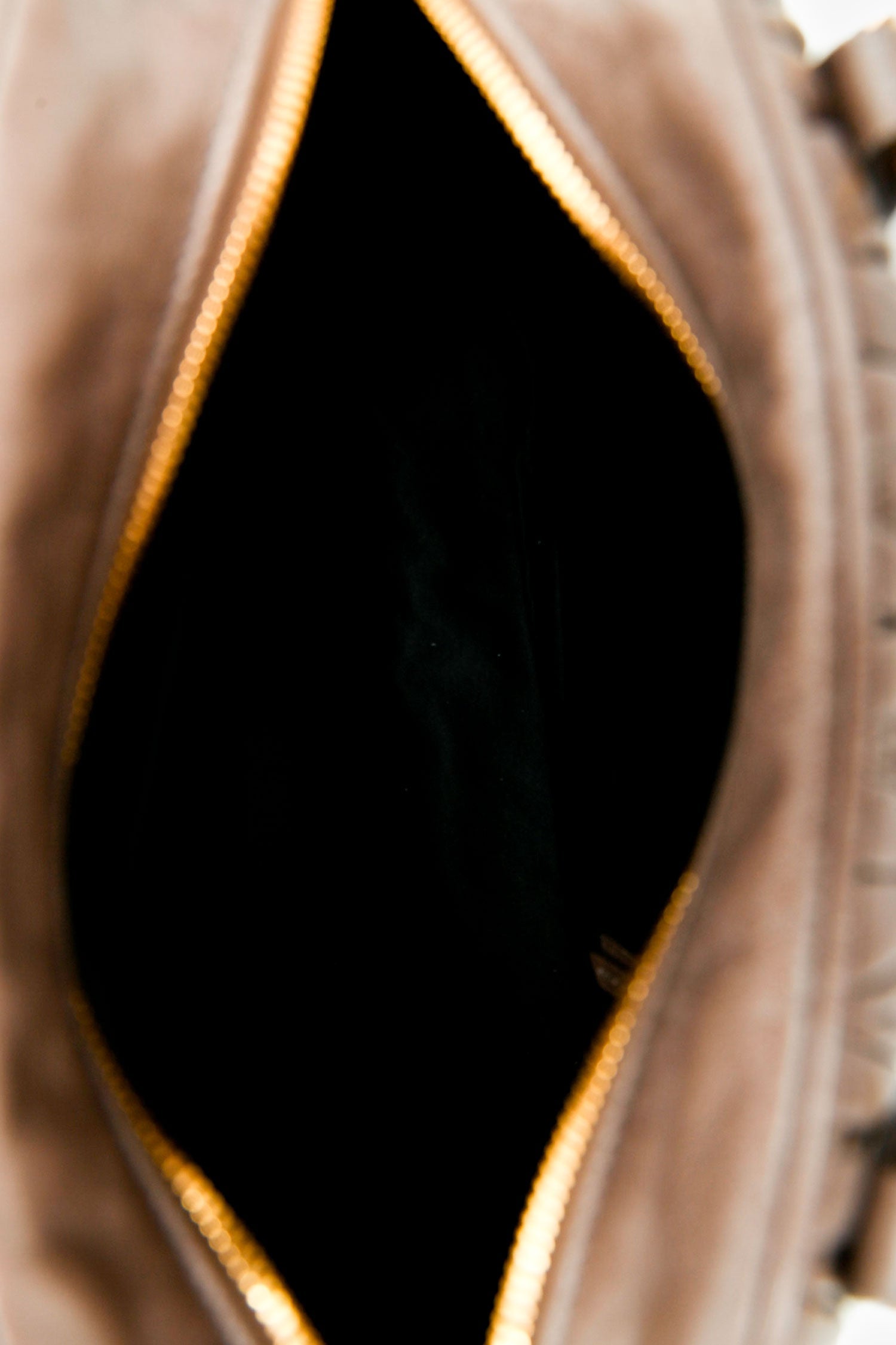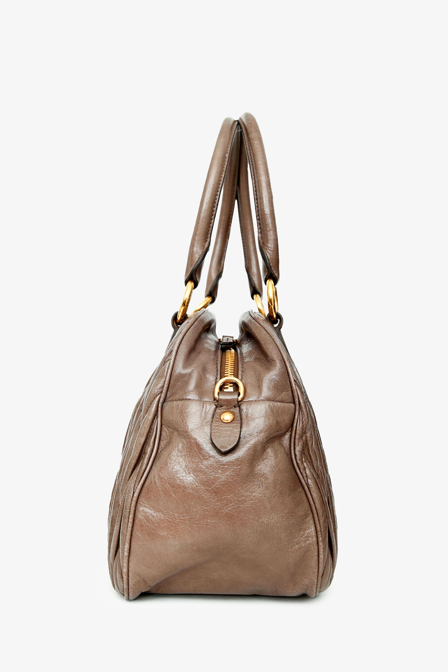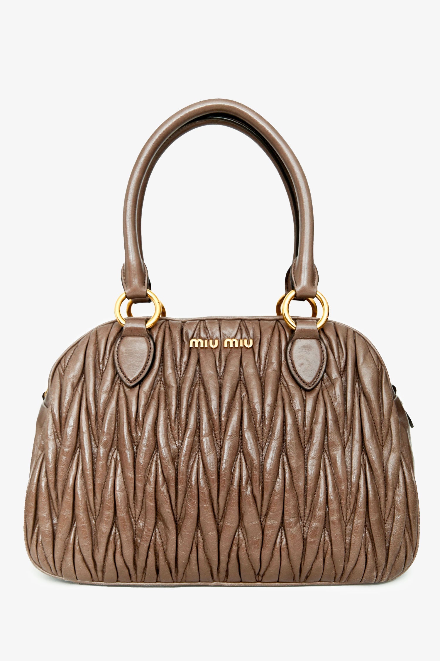Miu Miu Dark Beige Leather Matelassé Lux 'Baulleto' Top Handle Bag. Top zip closure. Twin top handles. Removable crossbody strap with lobster clasp closure. Fabric-lined interior. Single interior wall pocket with zip closure. Gold-tone hardware. Tonal stitching.