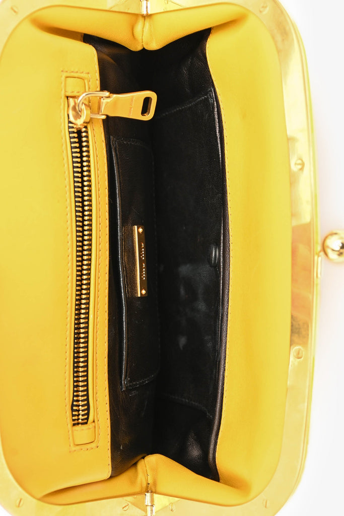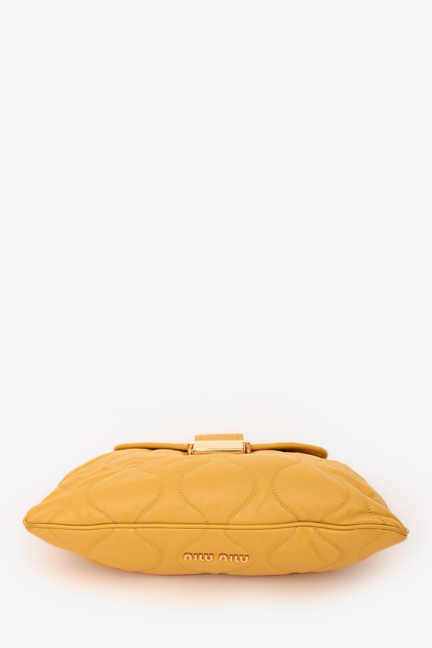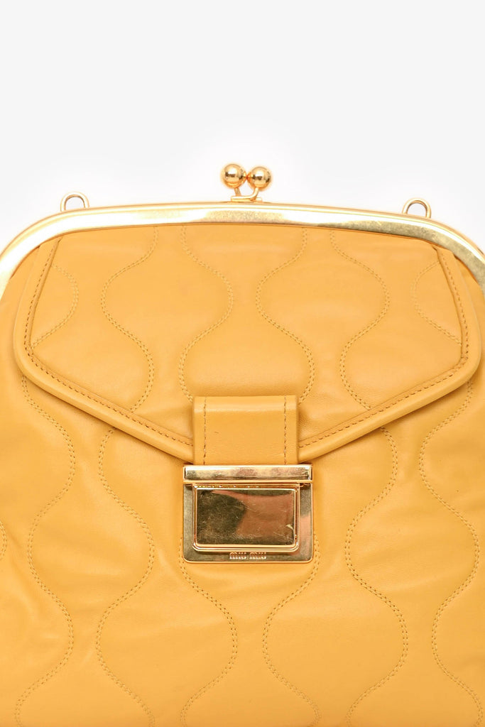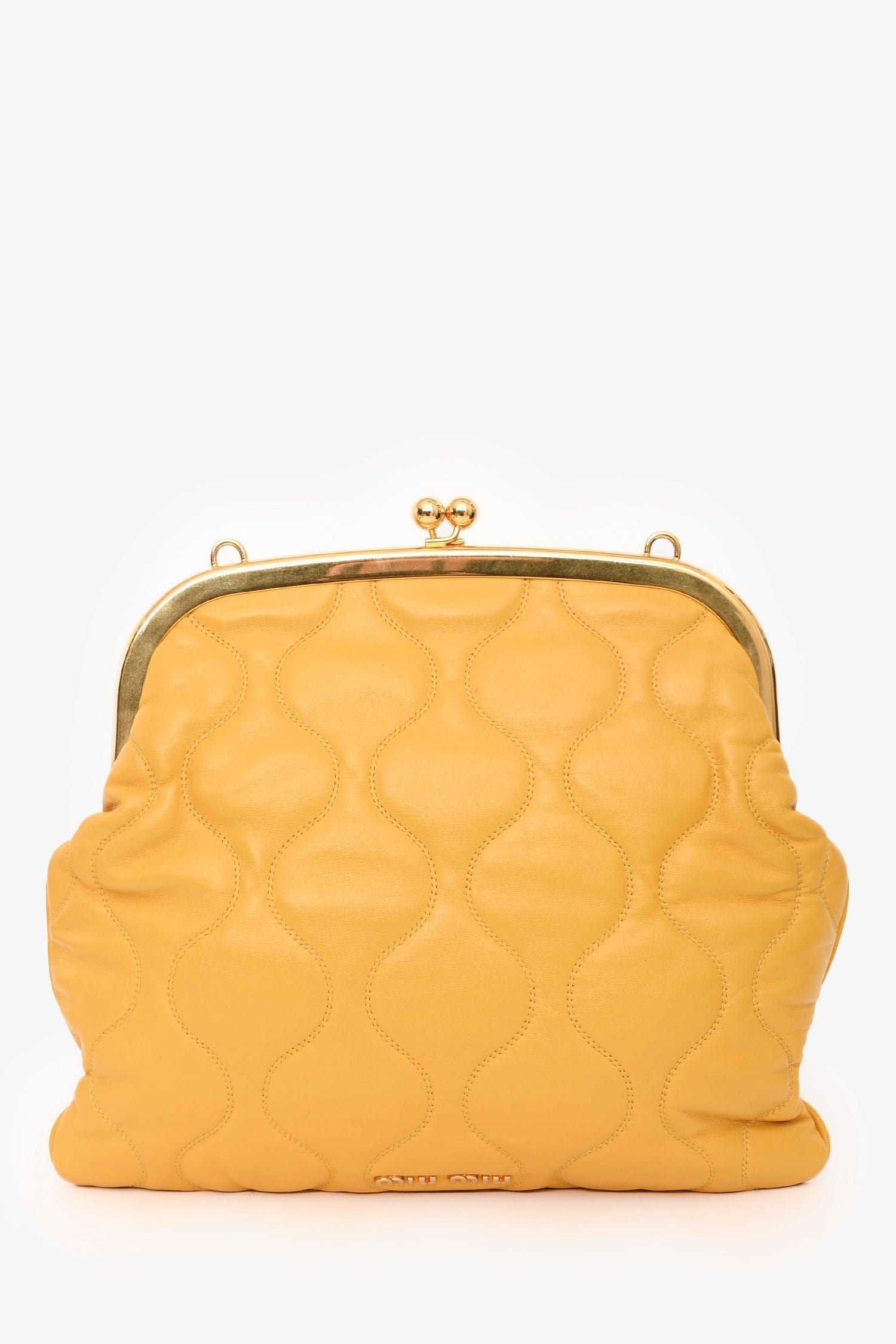 Miu Miu Yellow Leather Quilted Clasp Shoulder Bag. Framed top with metal clasp closure. Detachable leather shoulder strap. 3 interior pockets; 1 slip, 1 with clasp closure, 1 with zip closure. Gold-tone hardware. Tonal stitching.