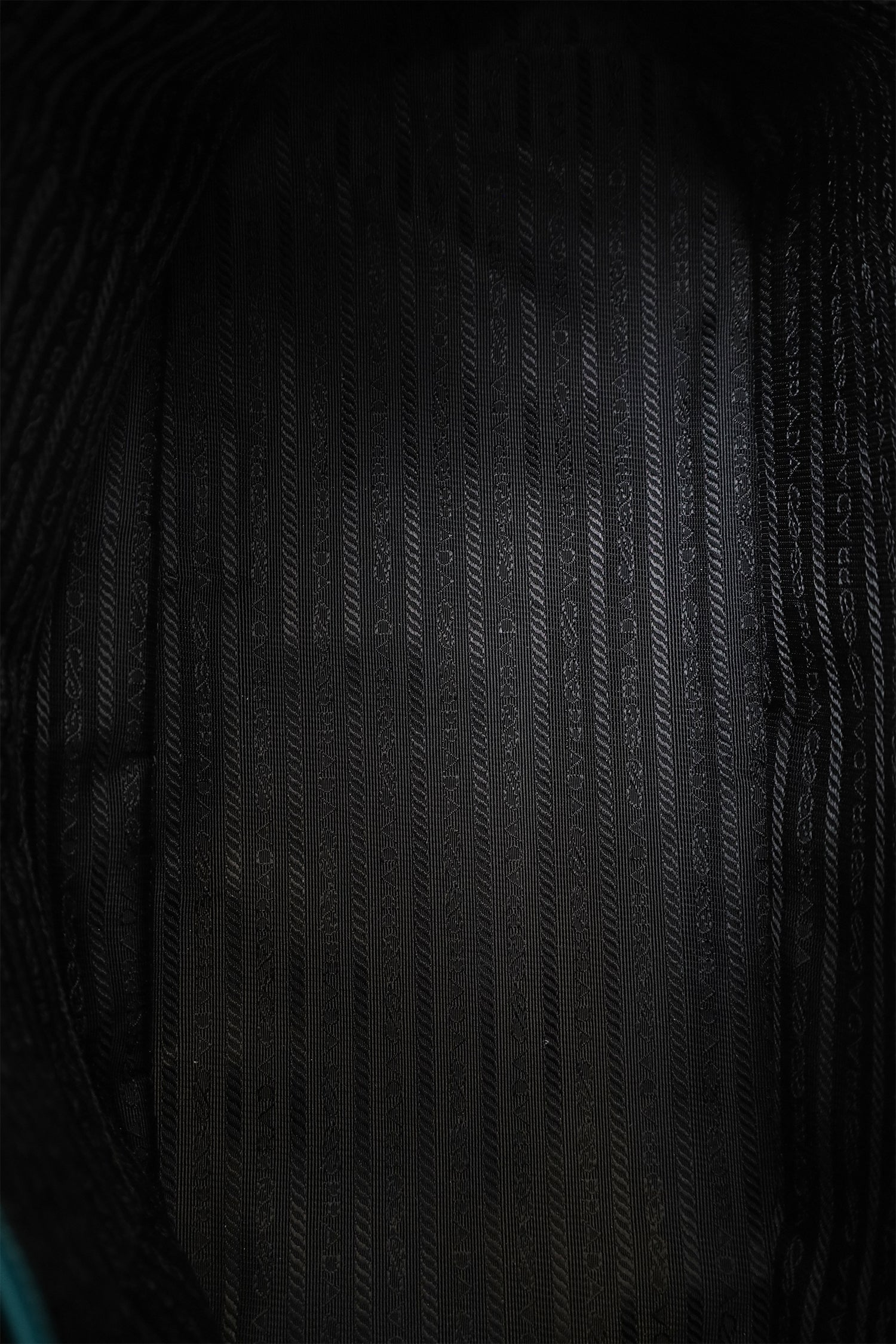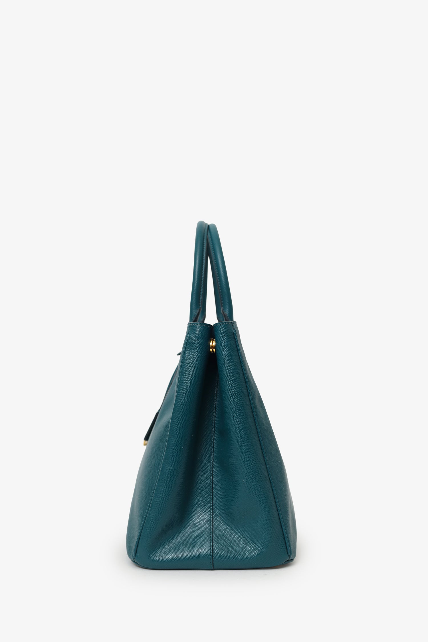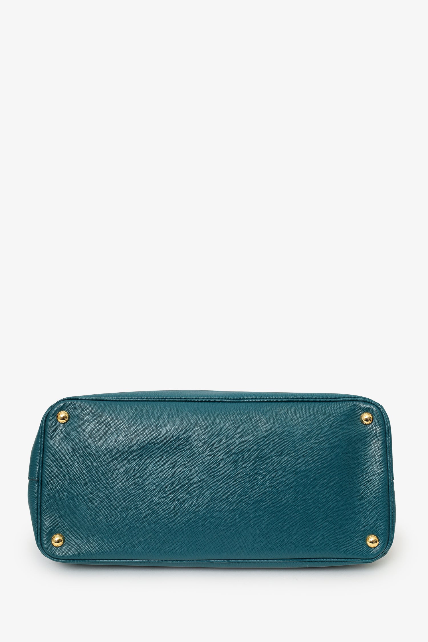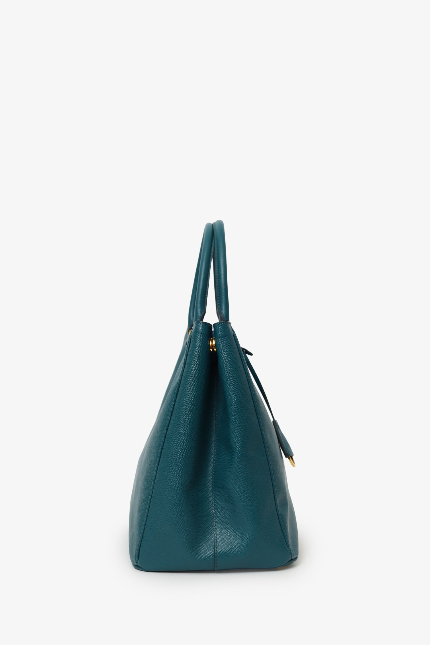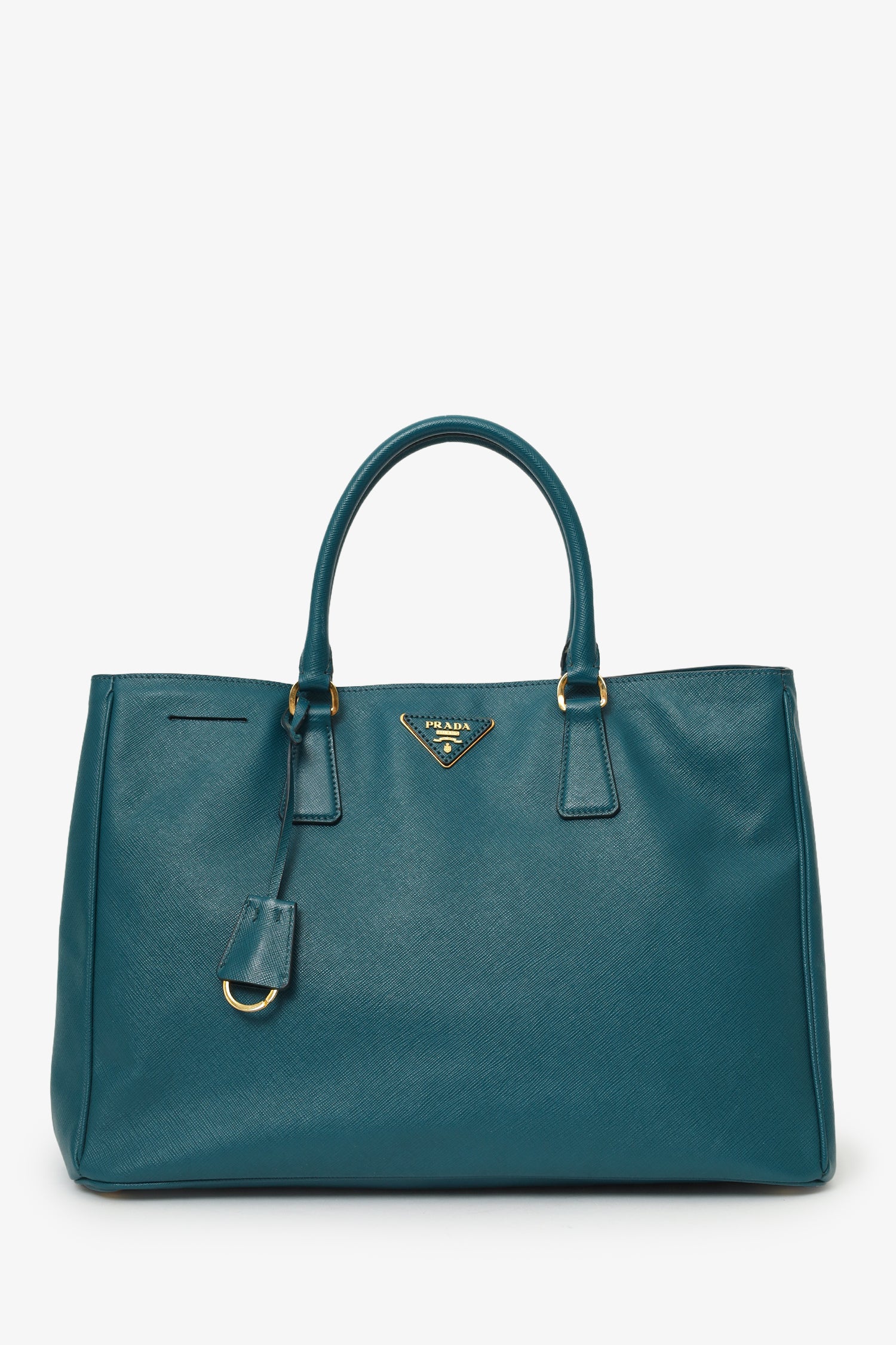 Prada 2011 Turquoise Saffiano Leather Lux Tote Bag. Interior snap button closure. Side snap button closure. Twin top handles. Protective base studs. Lined interior. 4 interior pockets; 3 slip and 1 wall zip closure. Gold-tone hardware. Tonal stitching. Includes removable clochette.