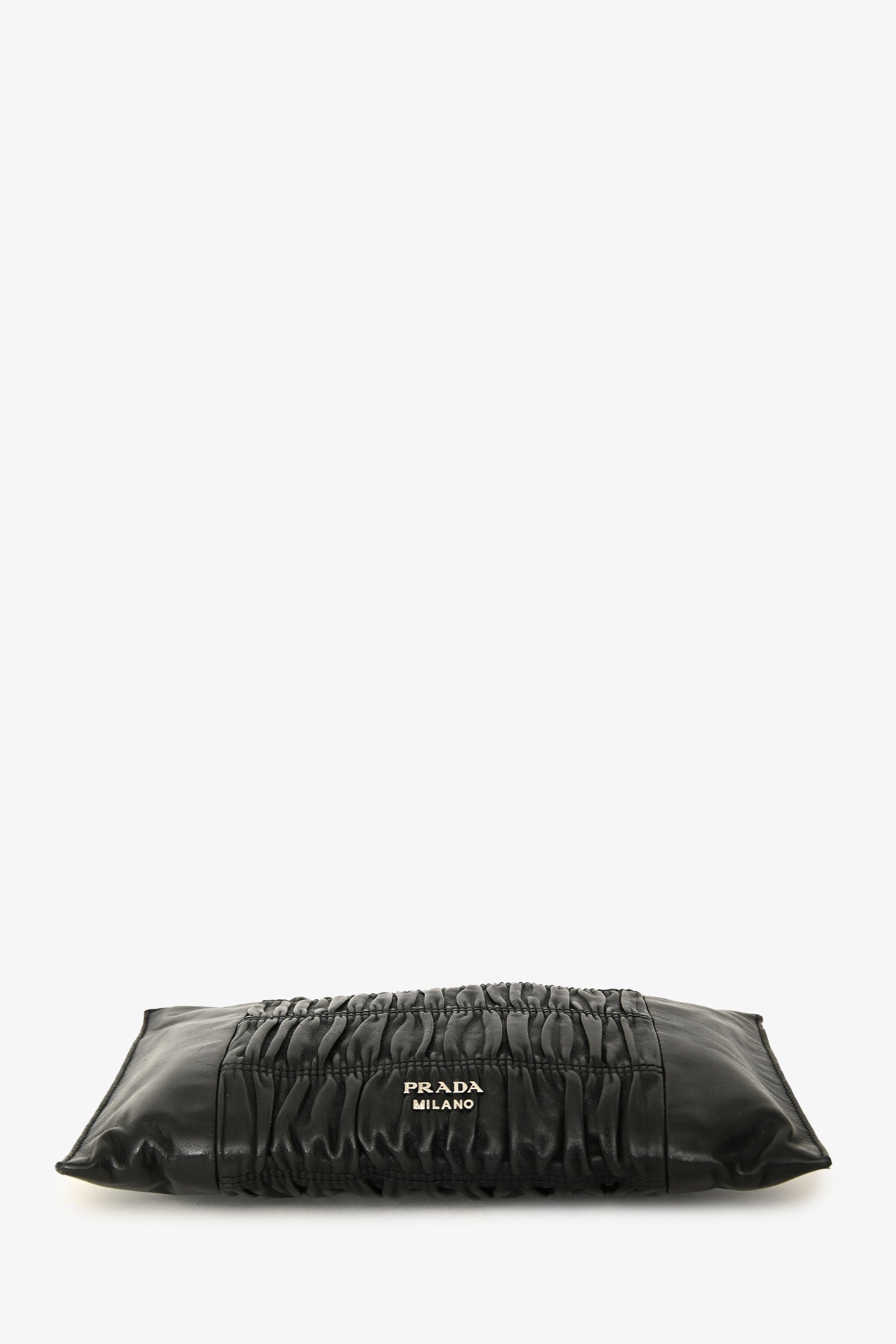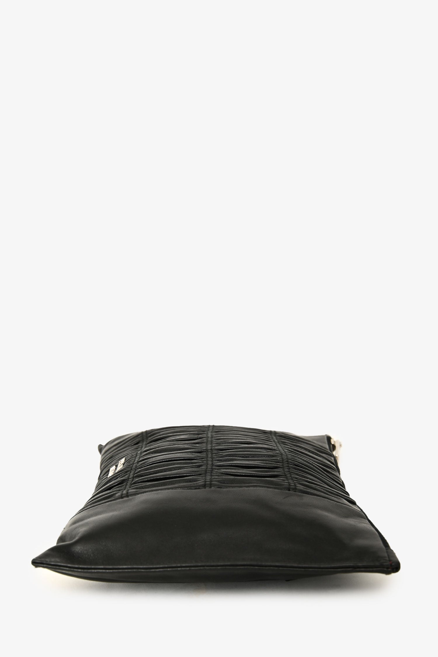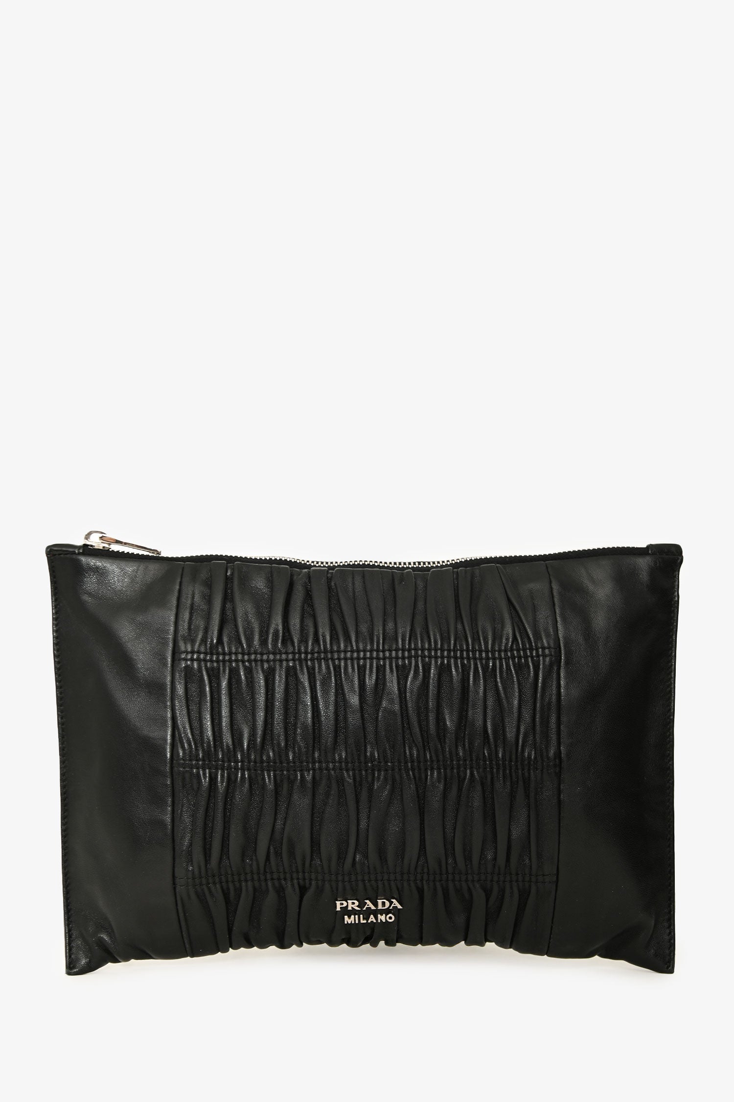Prada 2016 Black Nappa Gaufre Leather Pouch. Top zip closure. Hand strap in the back. Single interior compartment with 1 zip pocket, and 1 slip pocket. Leather-lined. Silver-tone hardware. Tonal stitching.