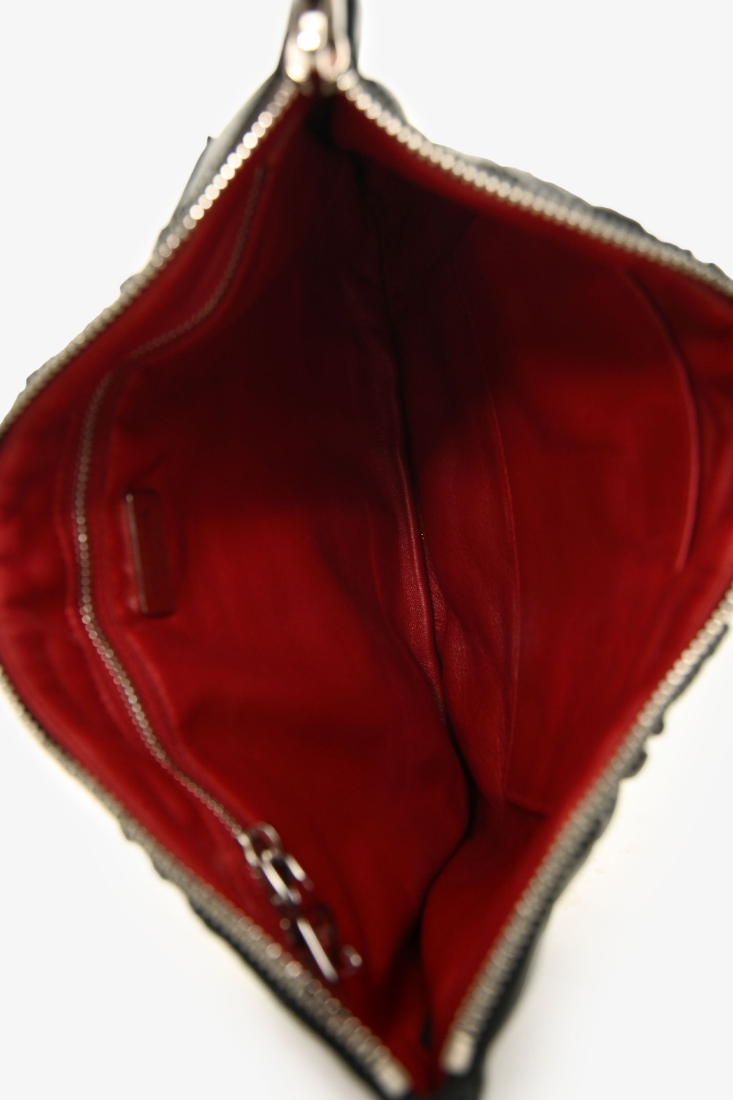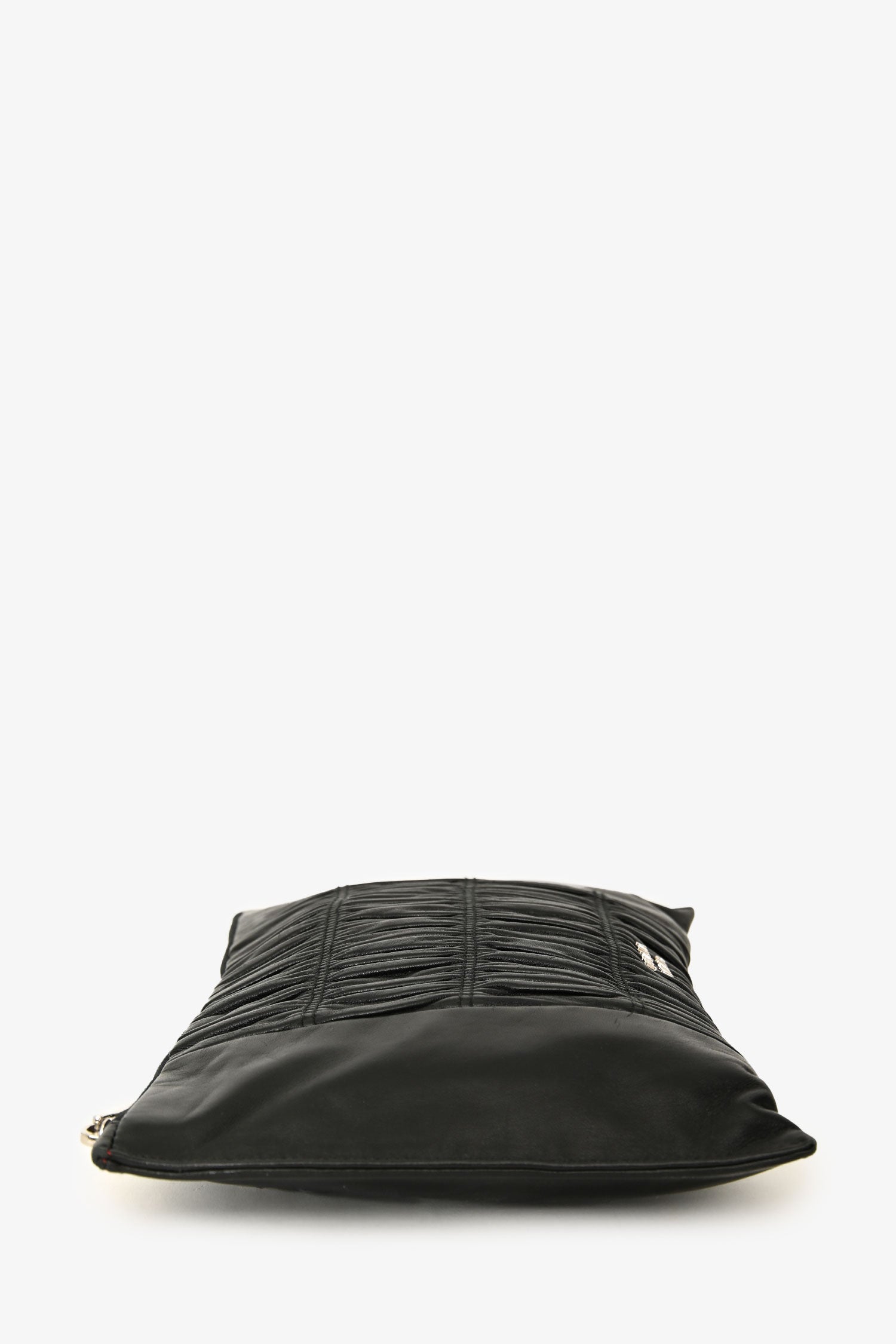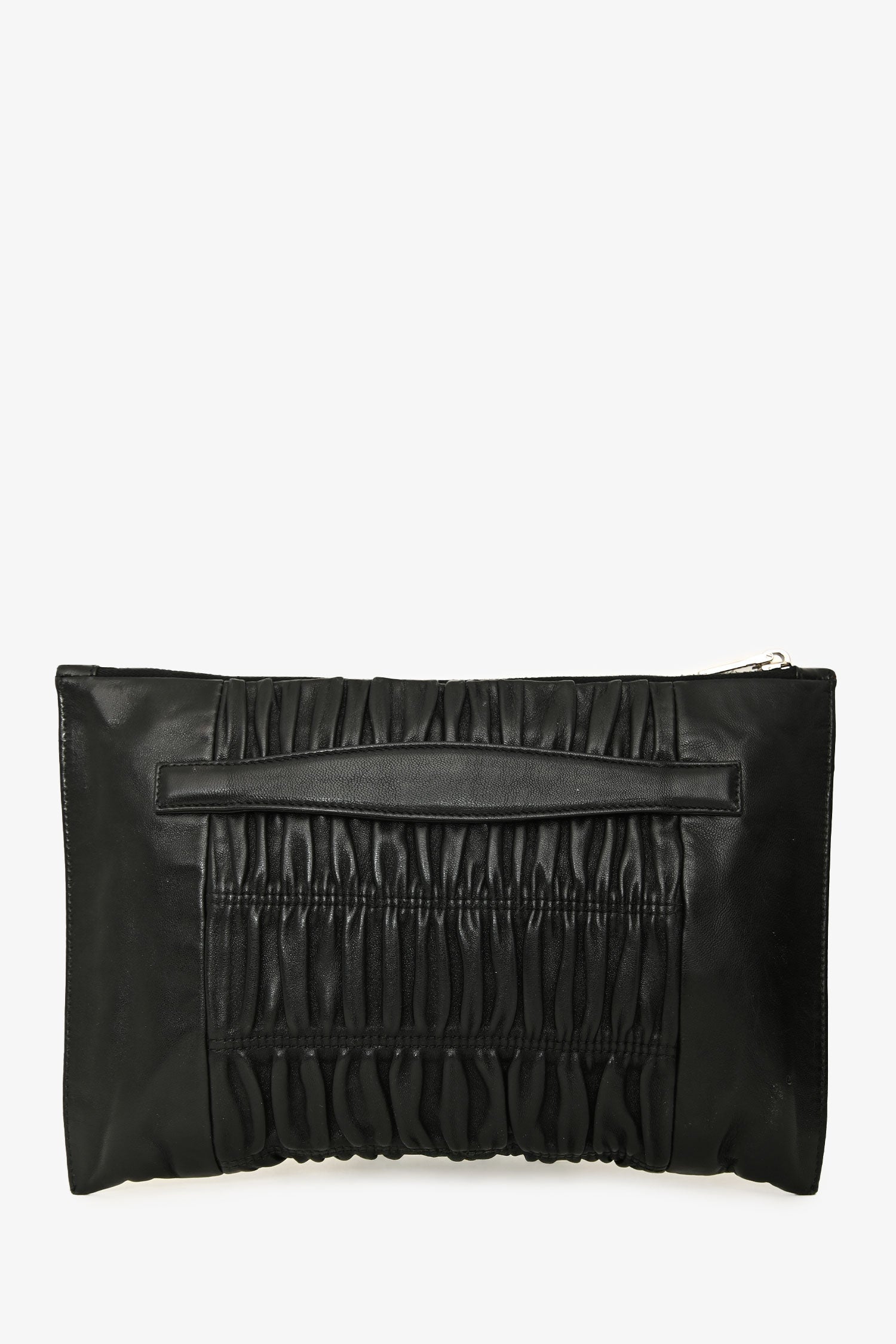 Prada 2016 Black Nappa Gaufre Leather Pouch. Top zip closure. Hand strap in the back. Single interior compartment with 1 zip pocket, and 1 slip pocket. Leather-lined. Silver-tone hardware. Tonal stitching.