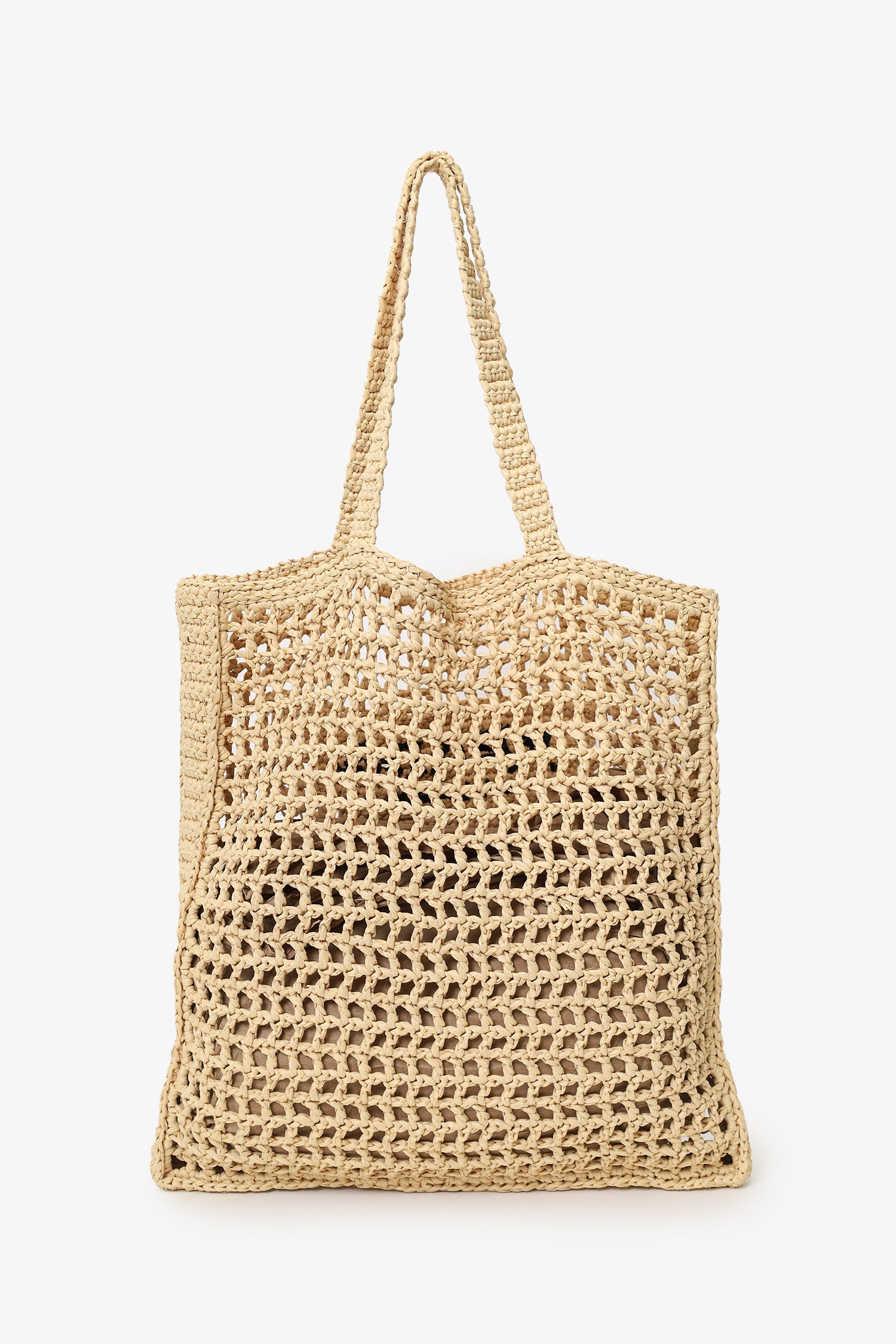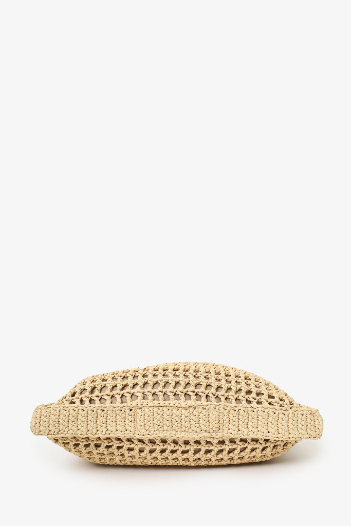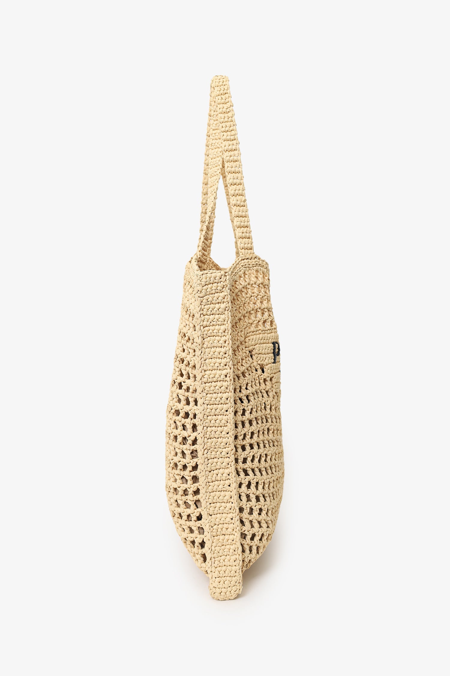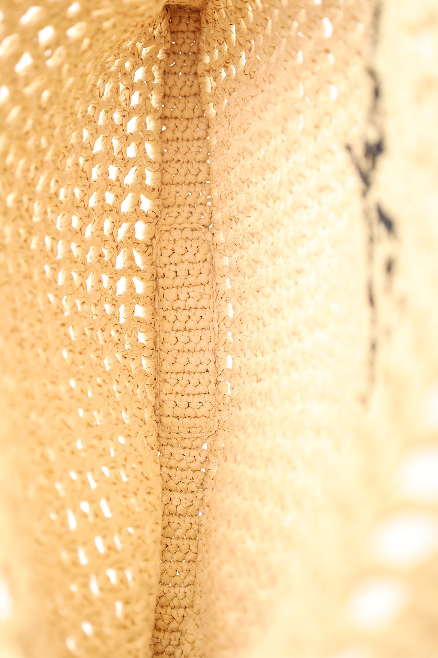 Prada Beige Small Logo Crochet Raffia Tote. Open top. Dual shoulder straps. Contrast and tonal stitching.