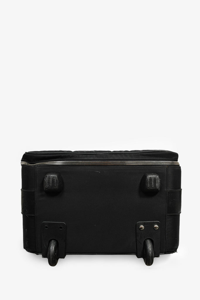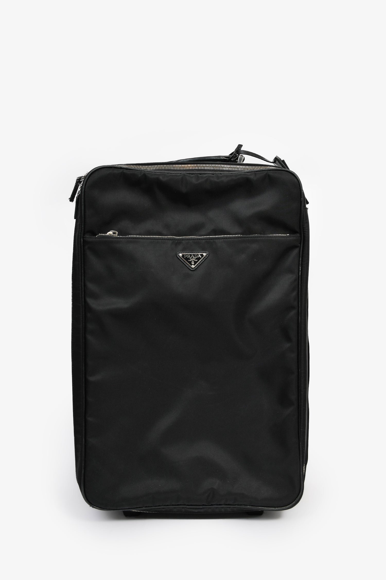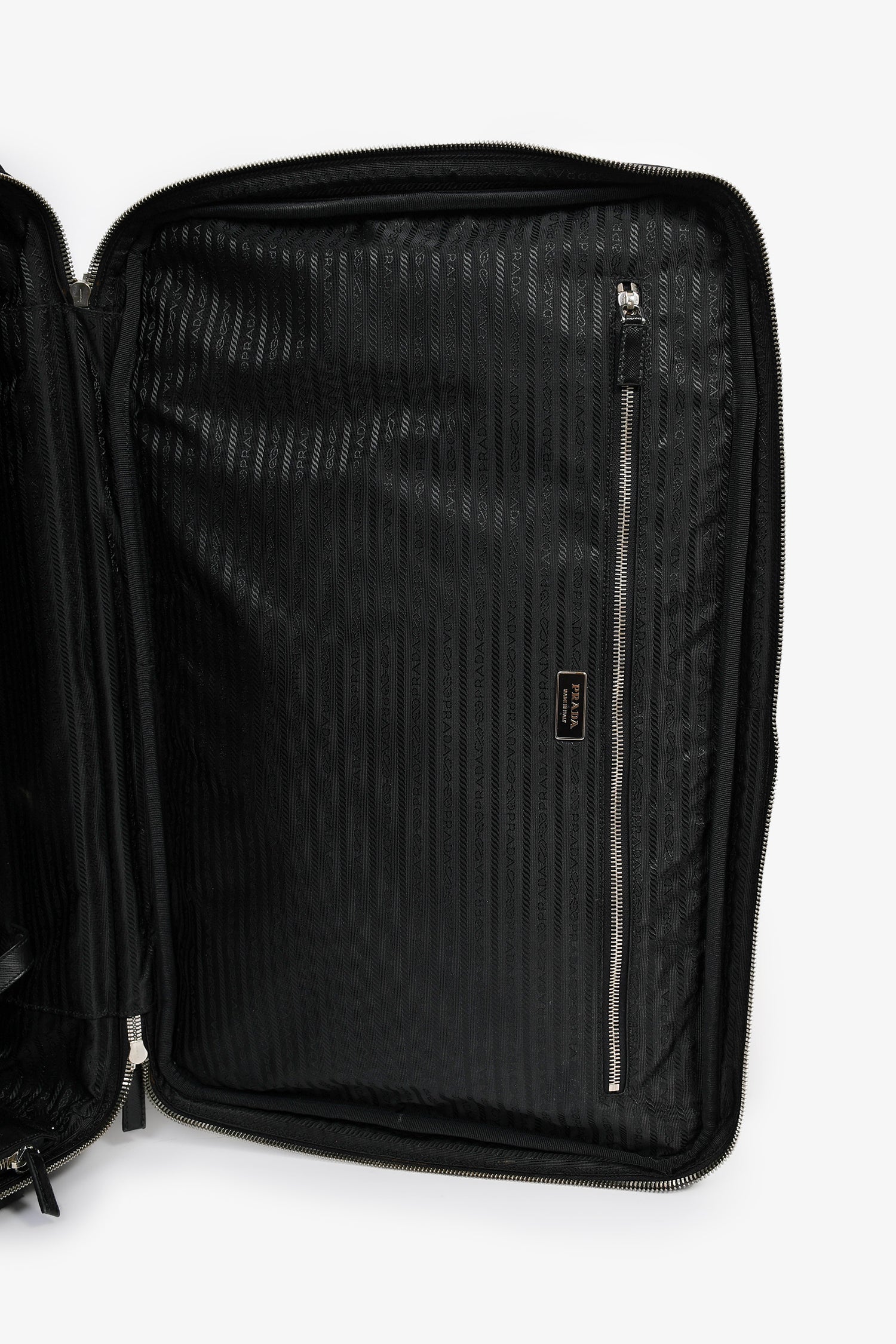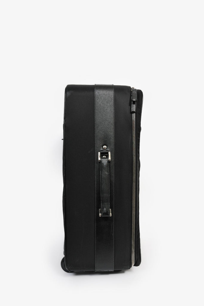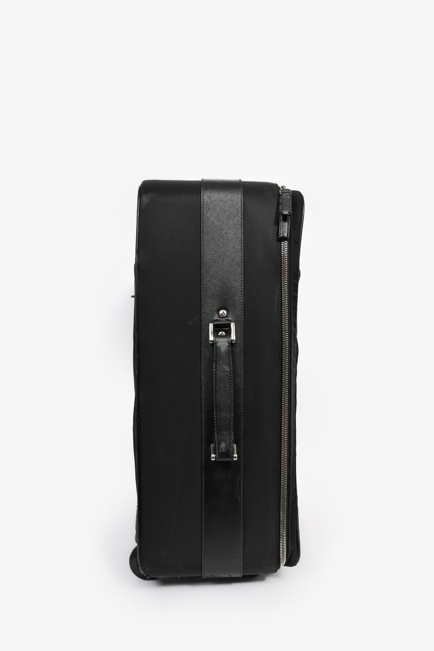Prada Black Nylon 22" Roller Suitcase. Front two-way zip closure. Top and side handle. Front zip pocket. Lined interior. Interior straps with buckle closures. Single interior zip compartment. Removable luggage tag. Silver-tone hardware. Tonal stitching.
