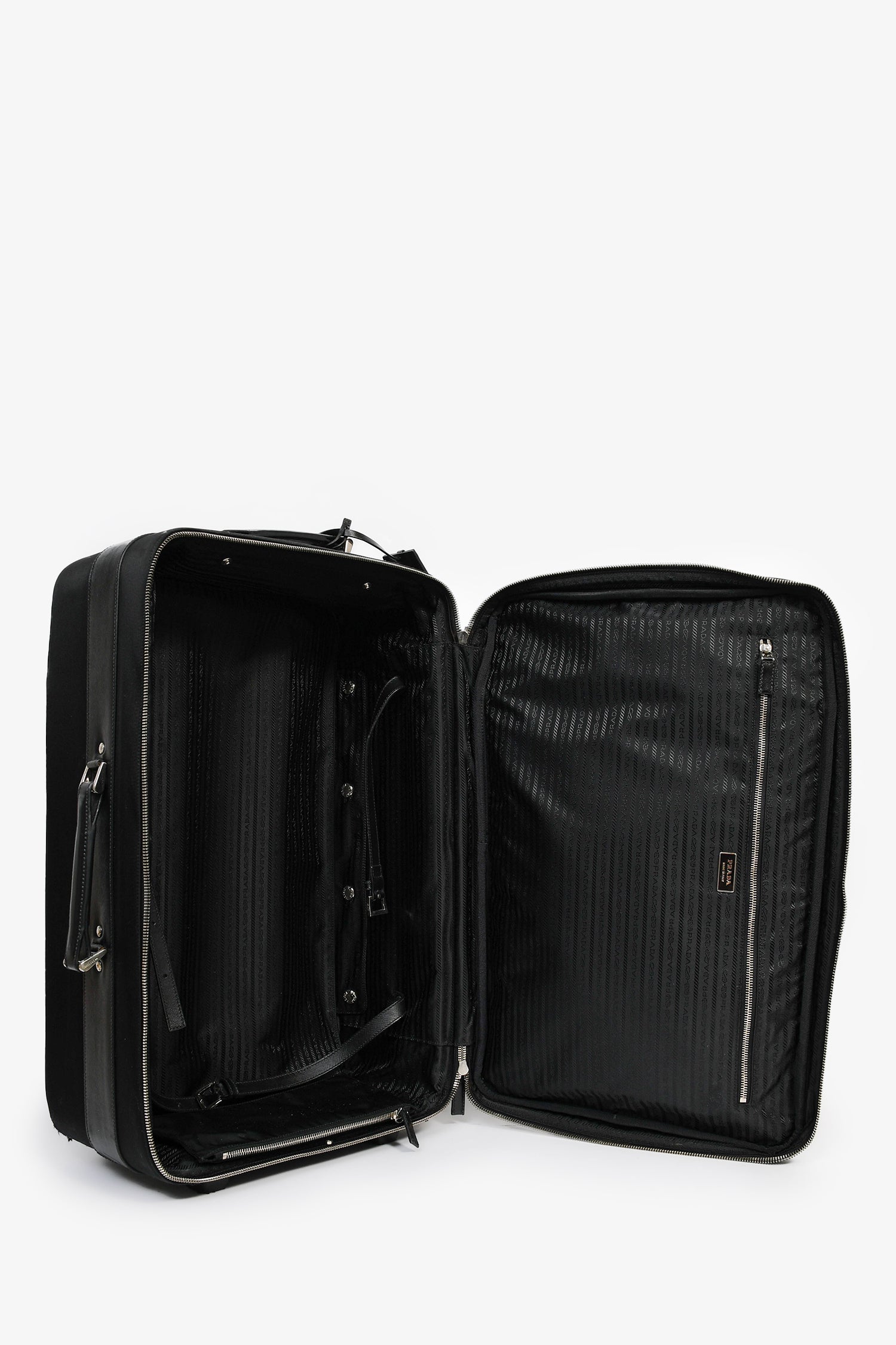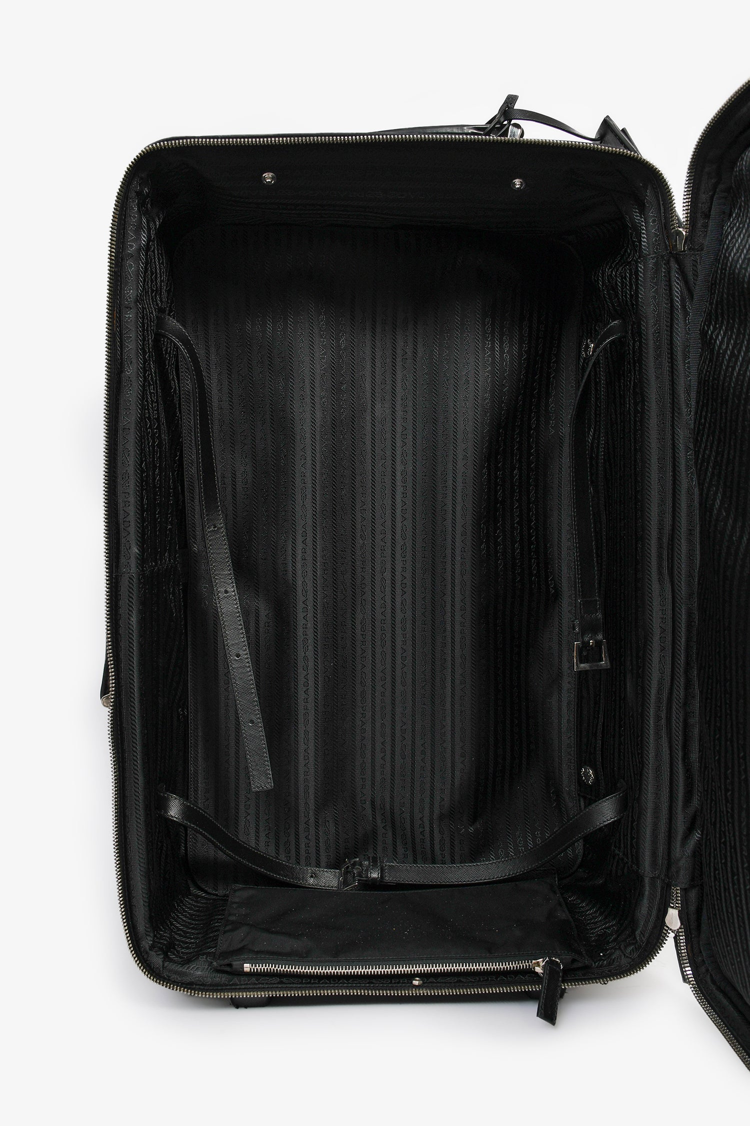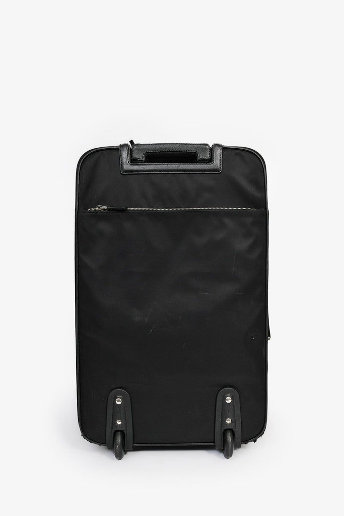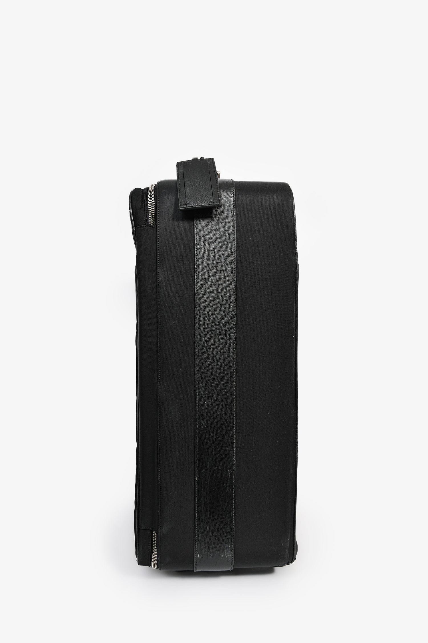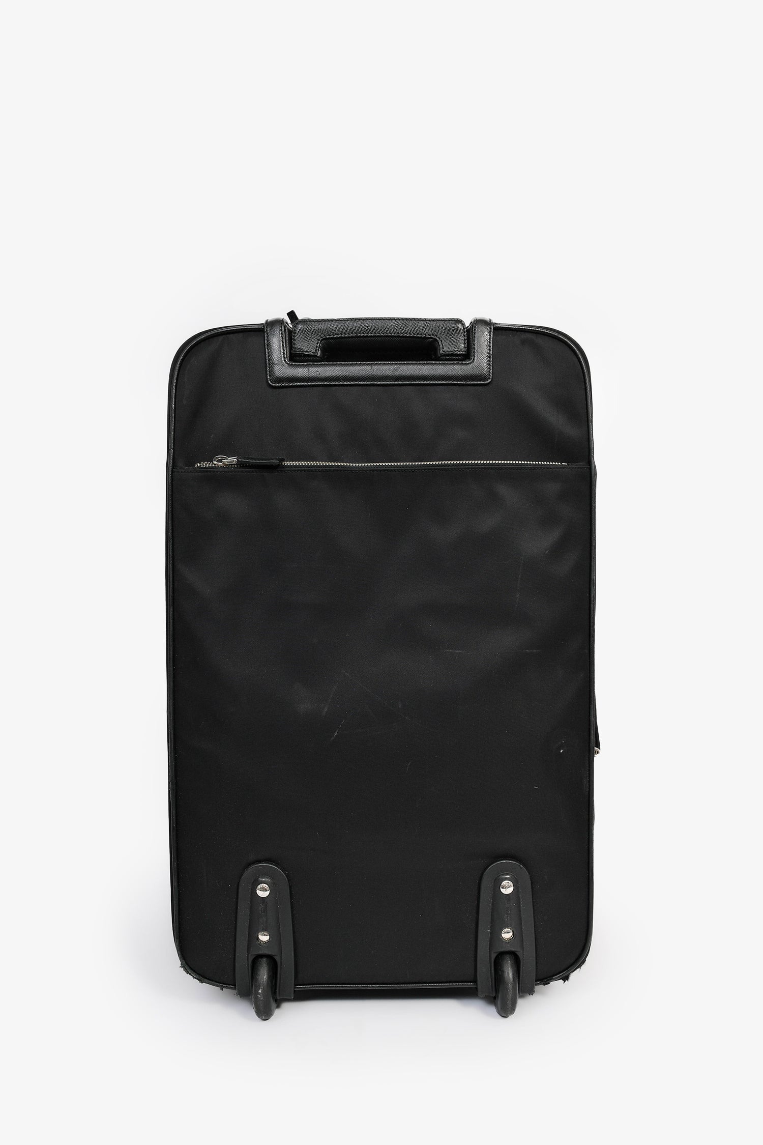 Prada Black Nylon 22" Roller Suitcase. Front two-way zip closure. Top and side handle. Front zip pocket. Lined interior. Interior straps with buckle closures. Single interior zip compartment. Removable luggage tag. Silver-tone hardware. Tonal stitching.