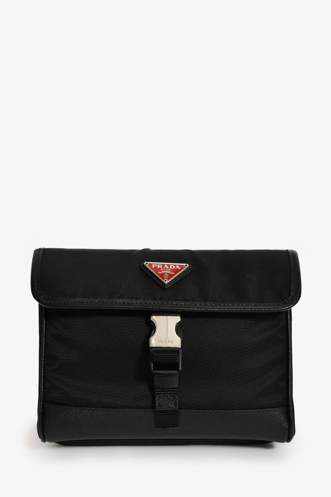 Prada Black Nylon/Saffiano Leather Smartphone Case Crossbody. Fold-over flap with a buckled closure. Dual crossbody straps. Leather trim. 1 exterior and interior card slip. Silver-tone hardware. Tonal stitching.