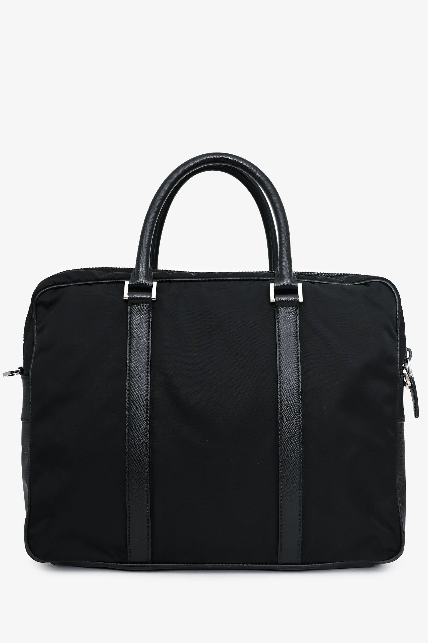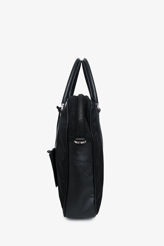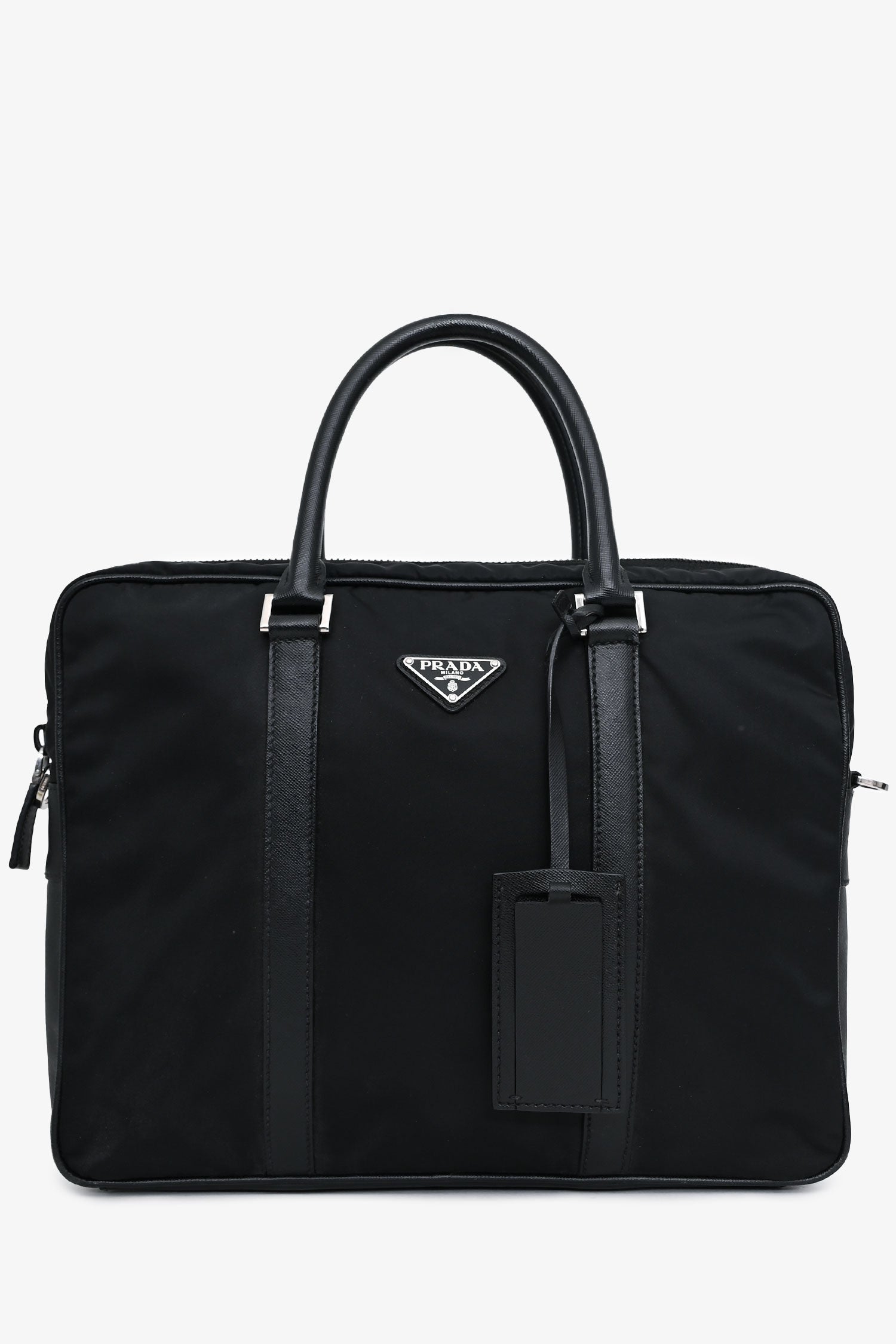 Prada Black Nylon Saffiano Leather Trim Briefcase. Dual rolled handles. Top zip closure. Tonal logo'd textile interior lining. Four interior wall pockets; three slip and one with zip closure. Detachable luggage tag. Silver-tone hardware.