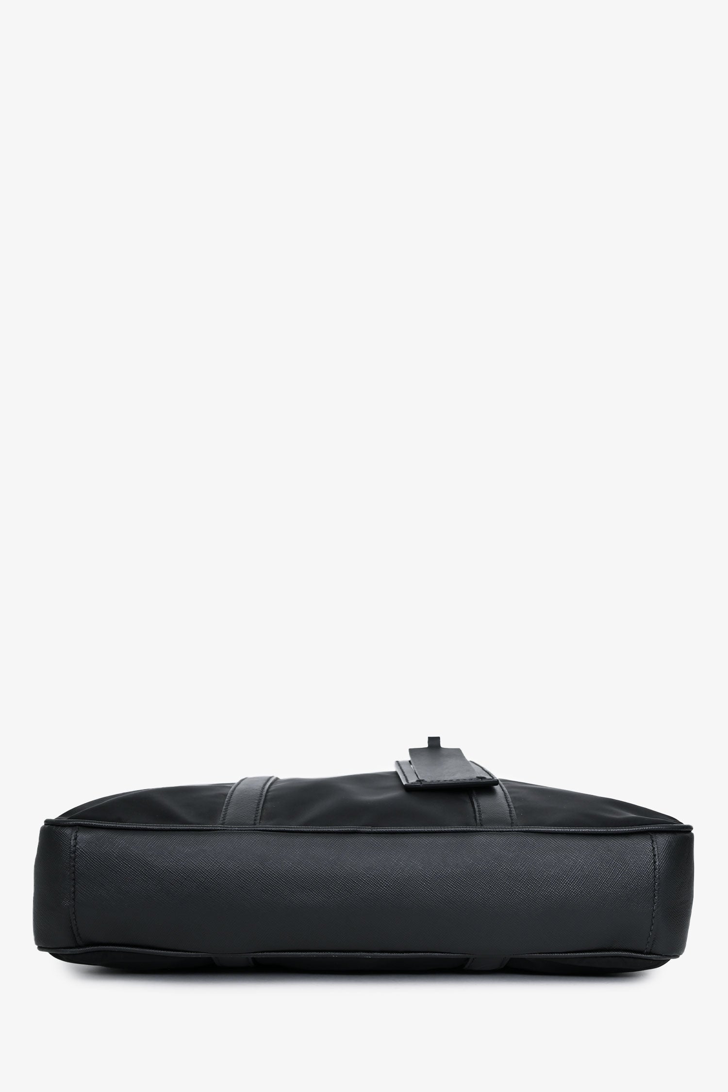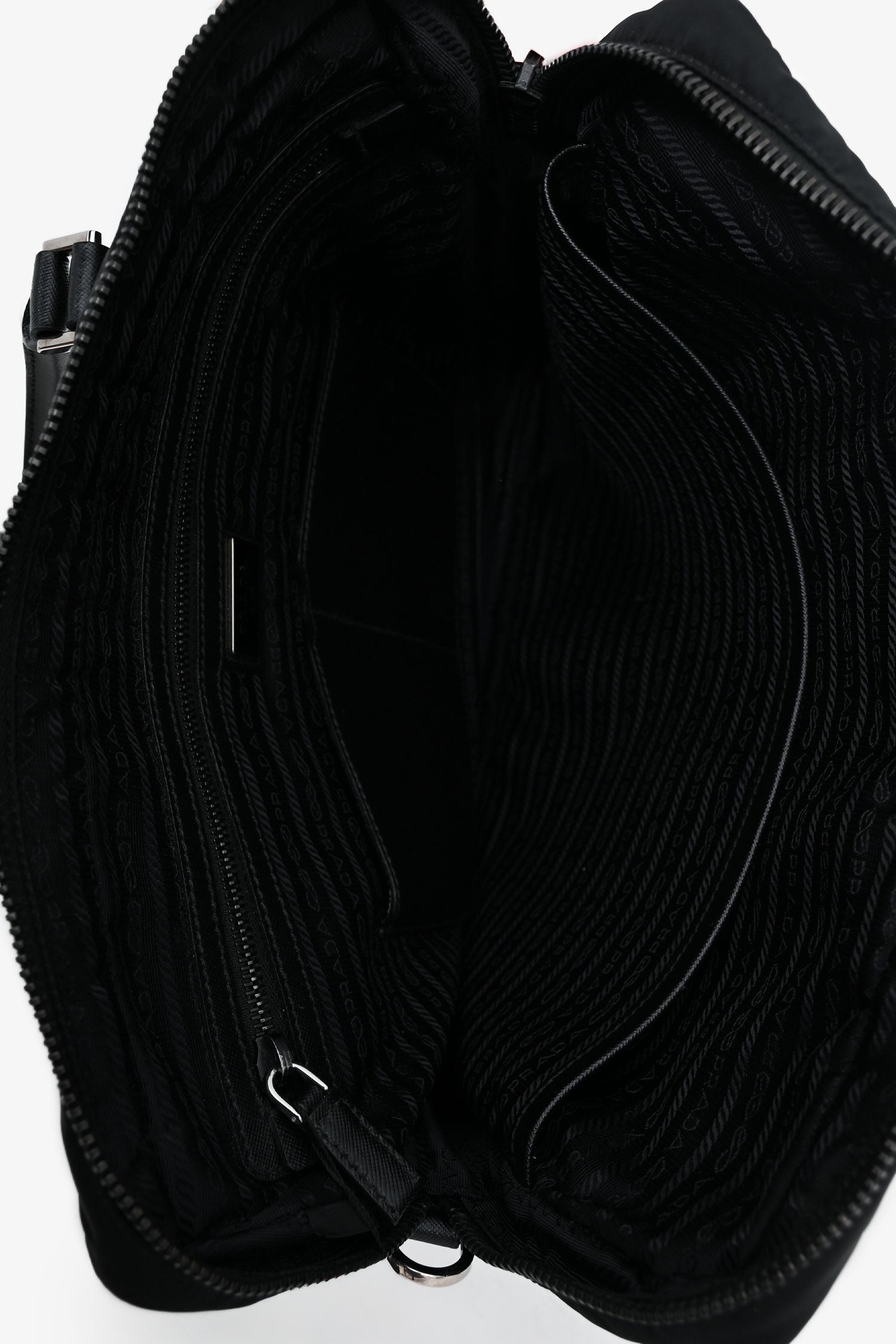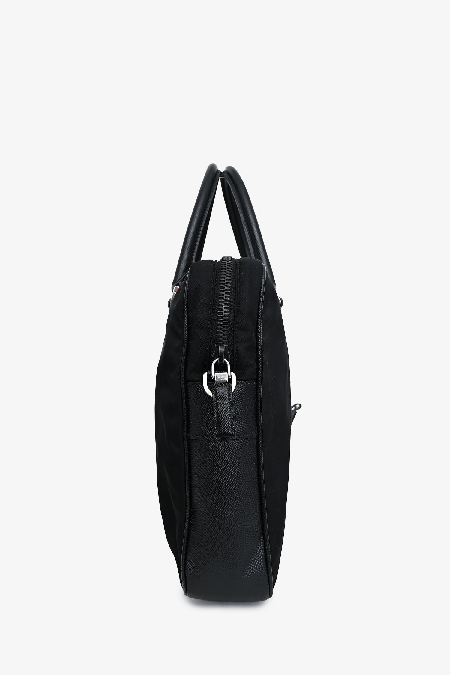 Prada Black Nylon Saffiano Leather Trim Briefcase. Dual rolled handles. Top zip closure. Tonal logo'd textile interior lining. Four interior wall pockets; three slip and one with zip closure. Detachable luggage tag. Silver-tone hardware.