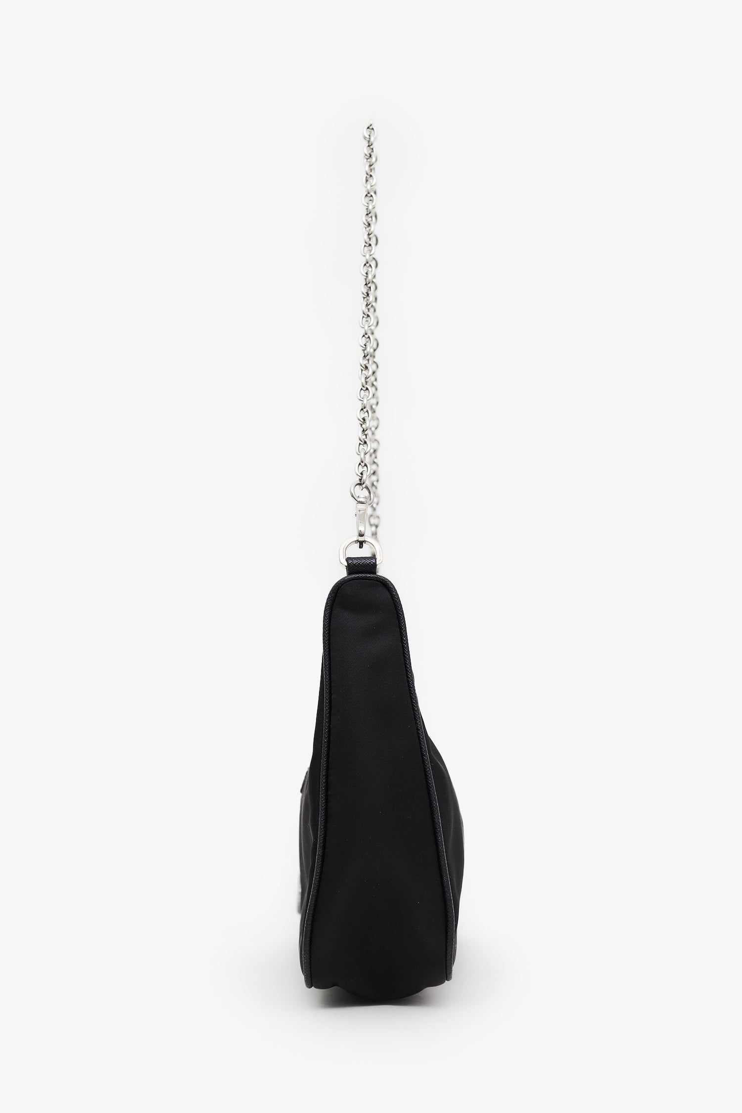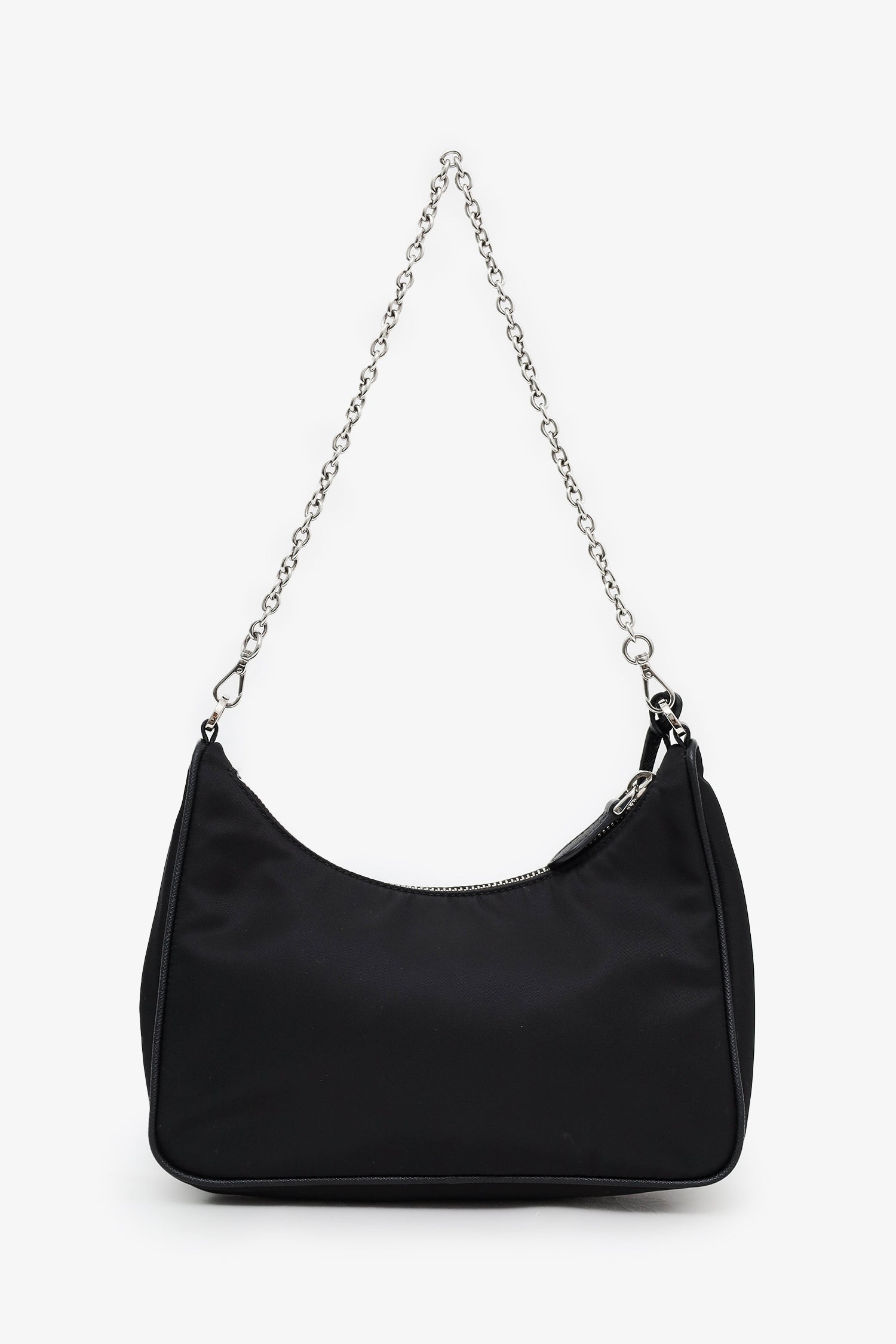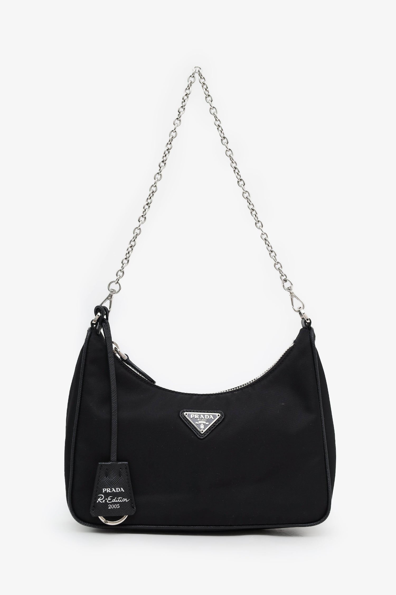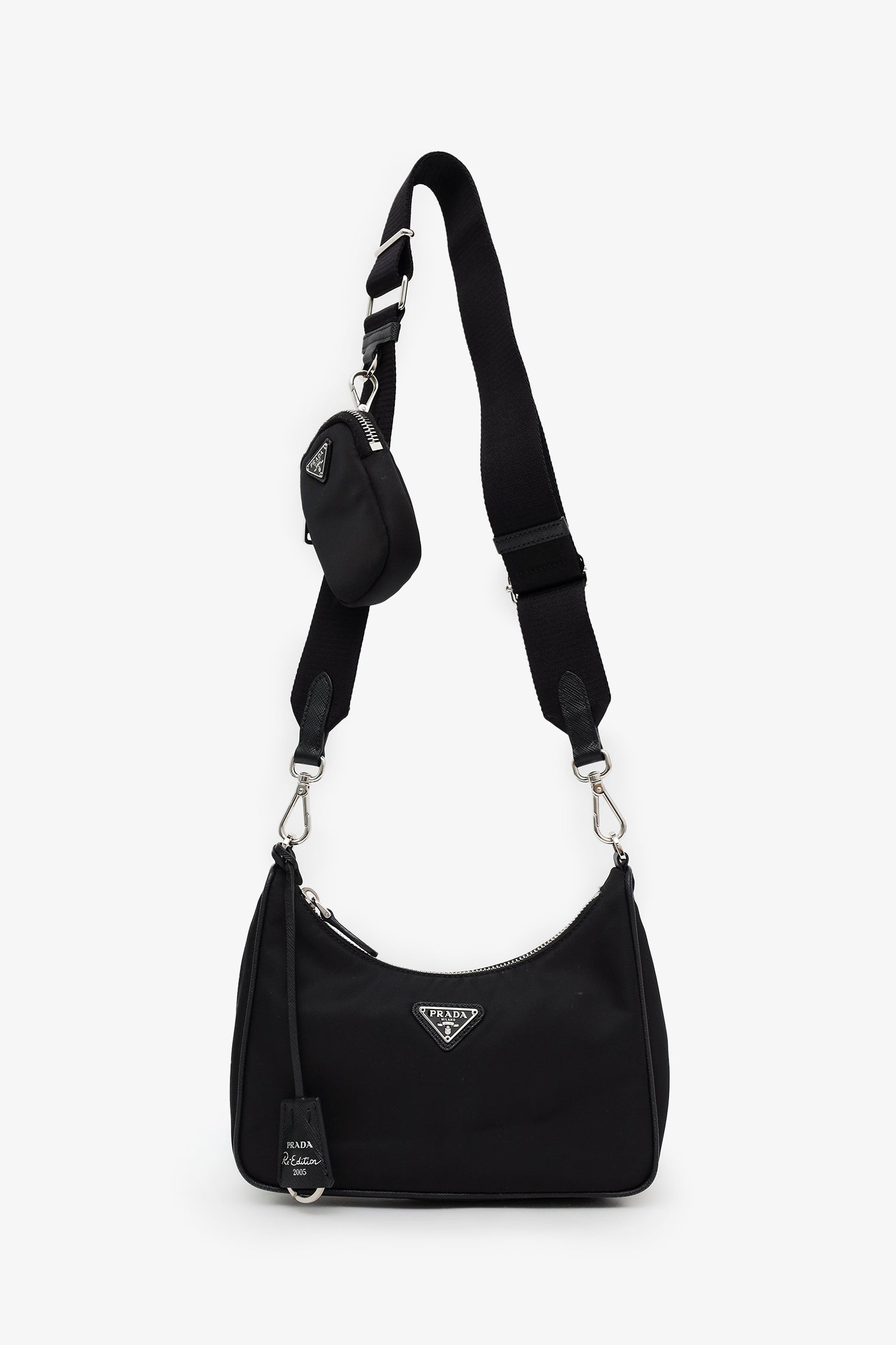 Prada Black Re-Nylon Re-Edition 2005 Bag With Strap + Pouch. Top zip closure. 2 removable strap attachments; chainlink shoulder strap and adjustable canvas crossbody strap with zip pouch. Open canvas-lined interior. Silver-tone hardware. Tonal stitching.