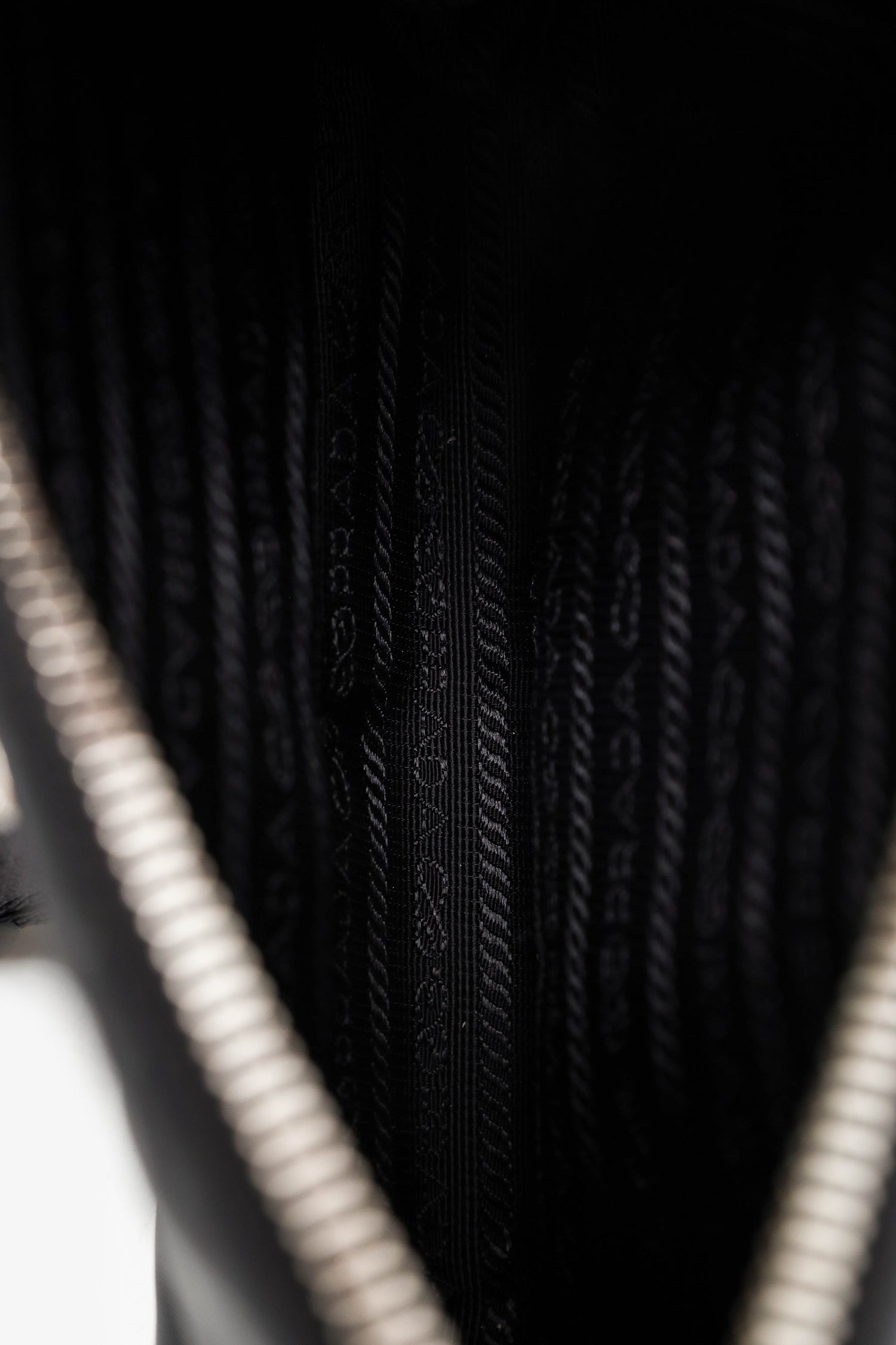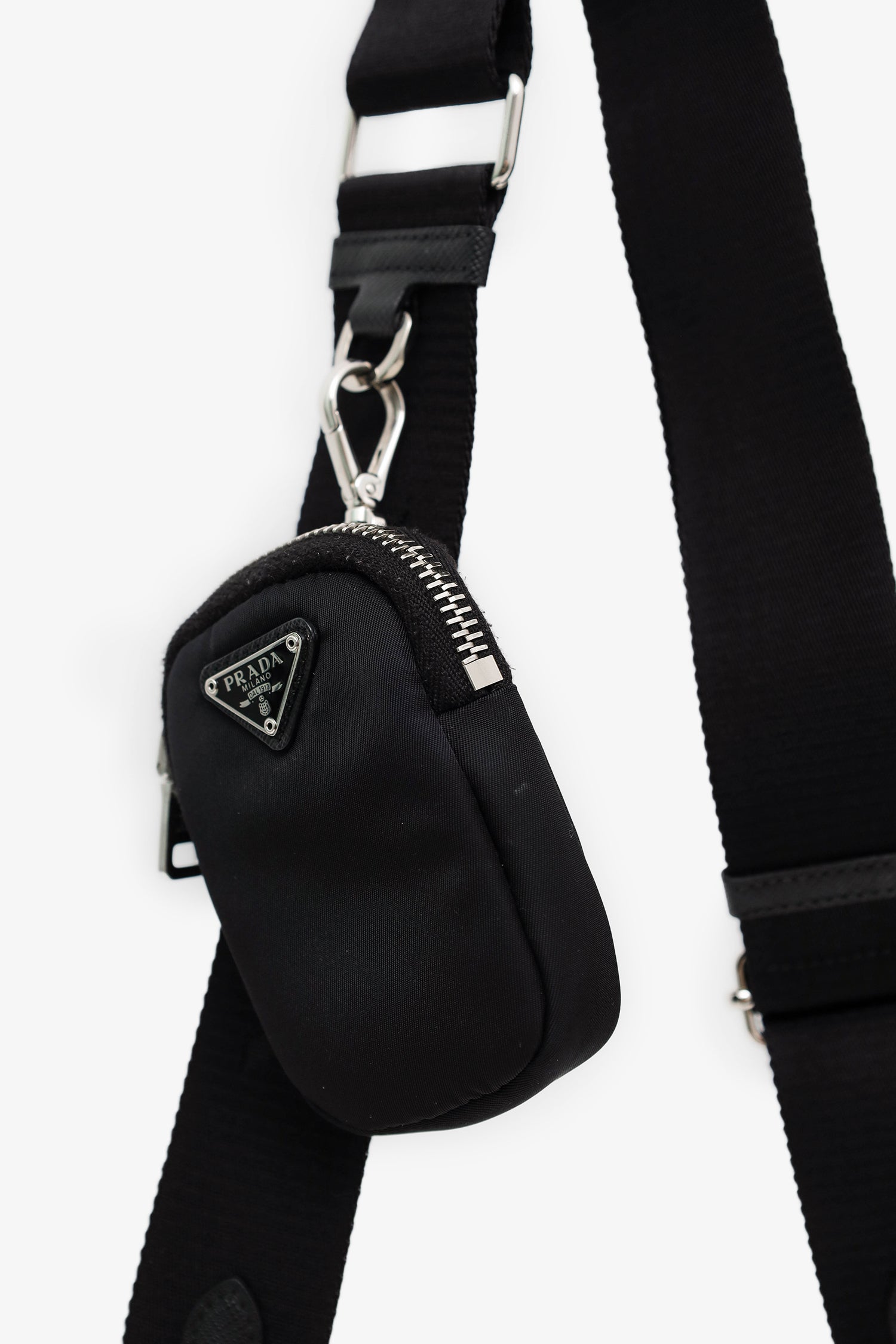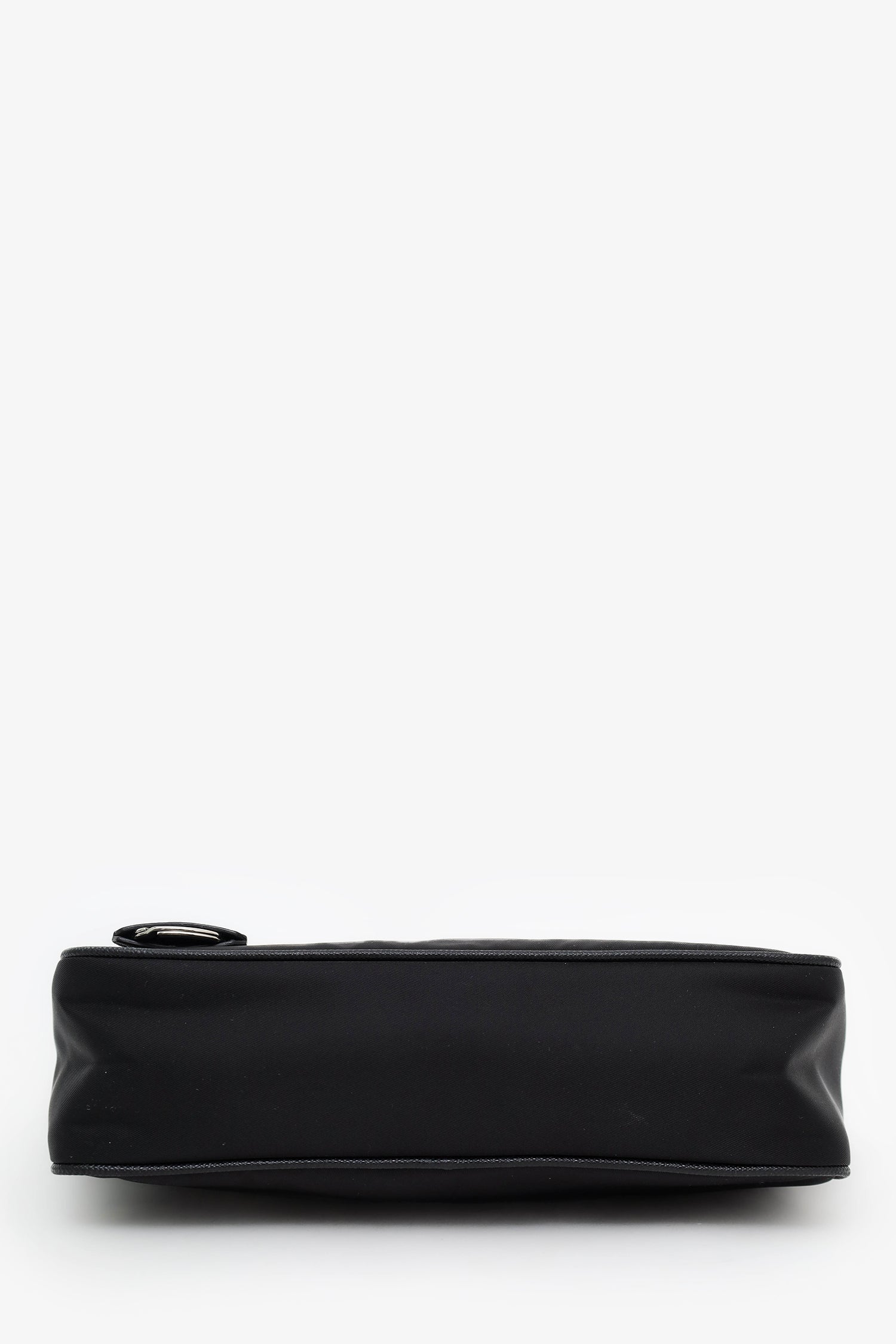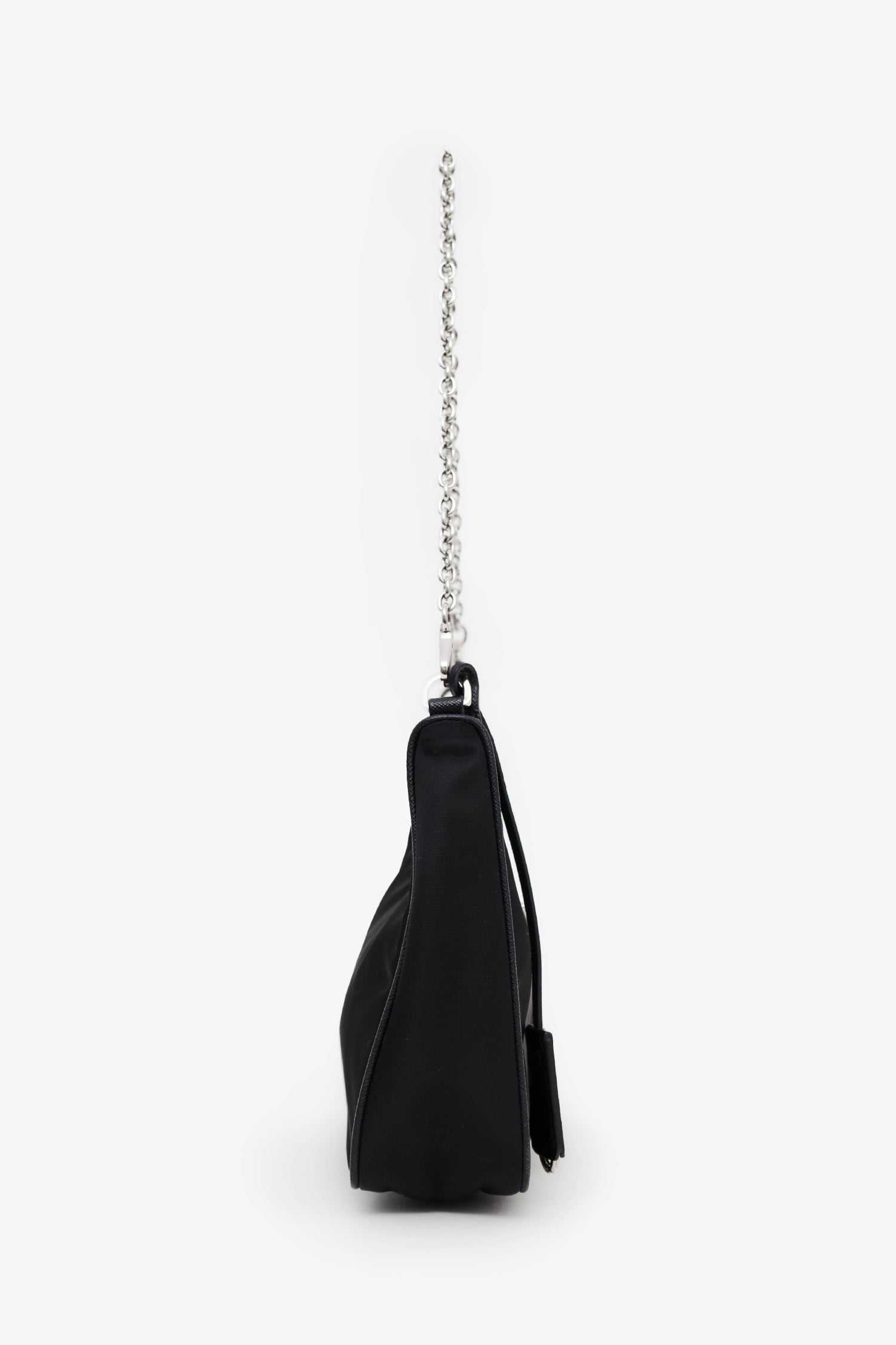 Prada Black Re-Nylon Re-Edition 2005 Bag With Strap + Pouch. Top zip closure. 2 removable strap attachments; chainlink shoulder strap and adjustable canvas crossbody strap with zip pouch. Open canvas-lined interior. Silver-tone hardware. Tonal stitching.