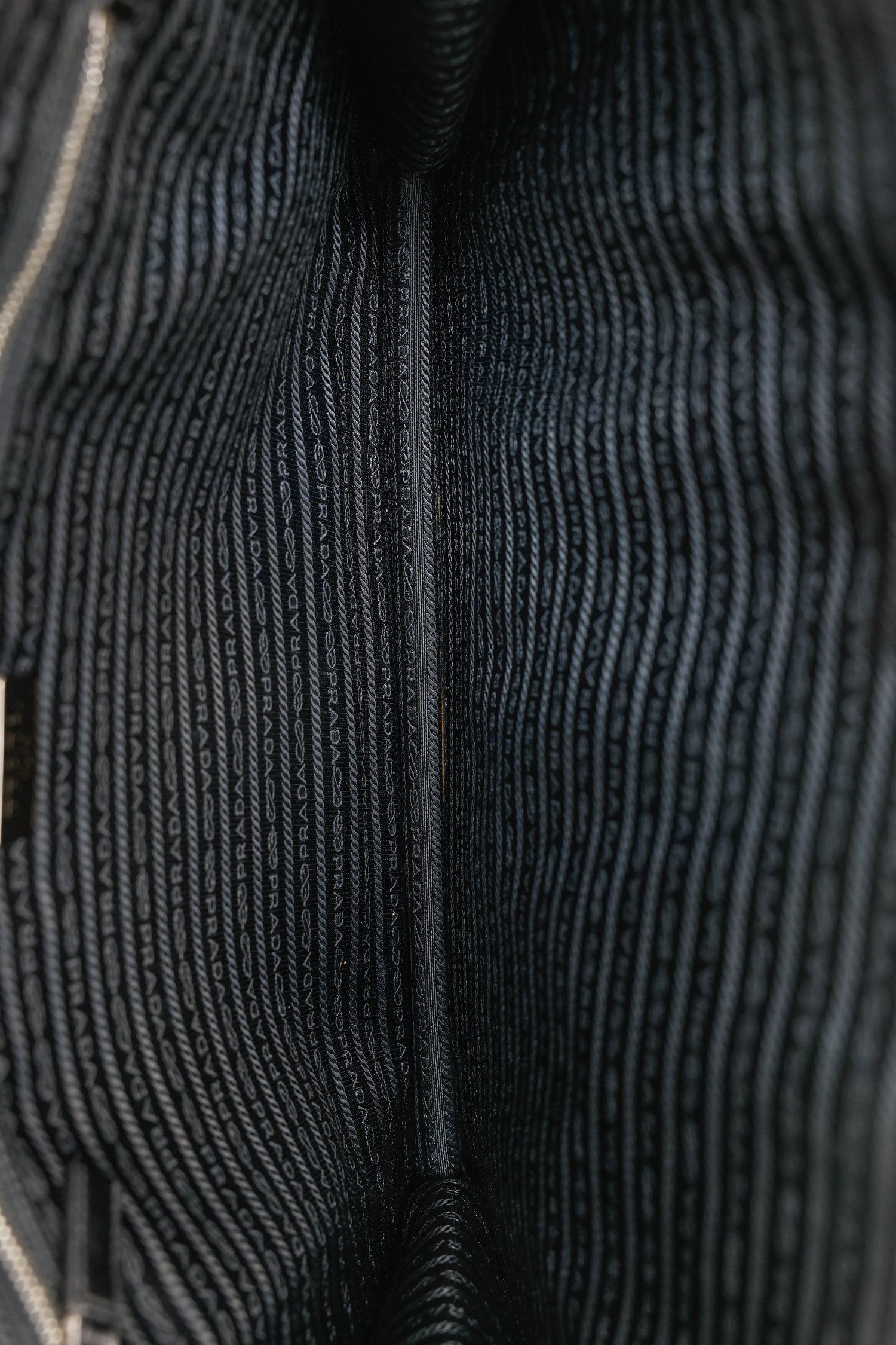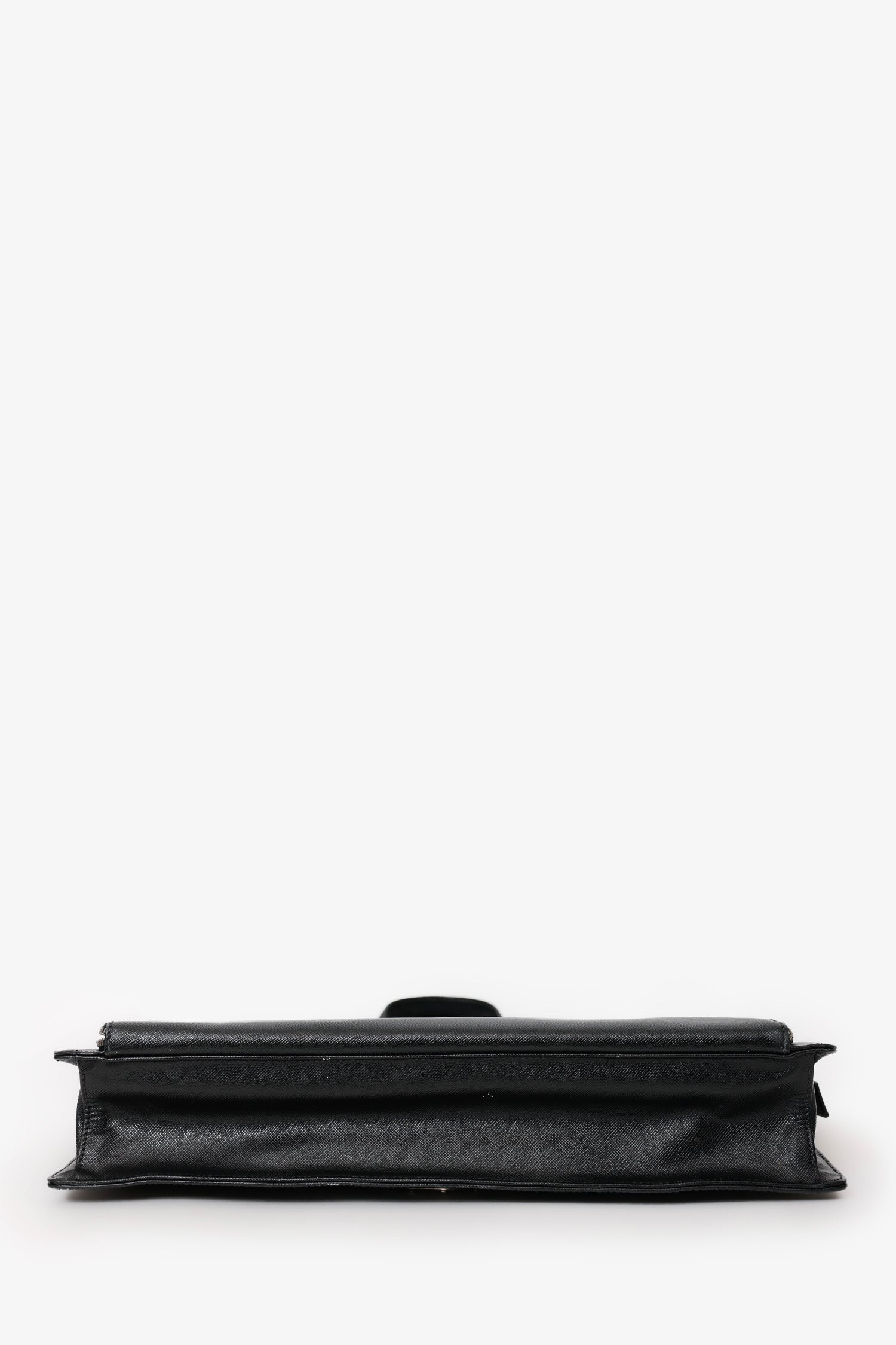 Prada Black Saffiano Leather Attache Briefcase Bag. Top zip closure. Twin top handles. Single rear exterior zip pocket with 3 slip pockets, 11 cardholder slots, and 3 pen slots. Lined interior. Single interior wall pocket with zip closure. Silver-tone hardware. Tonal stitching.