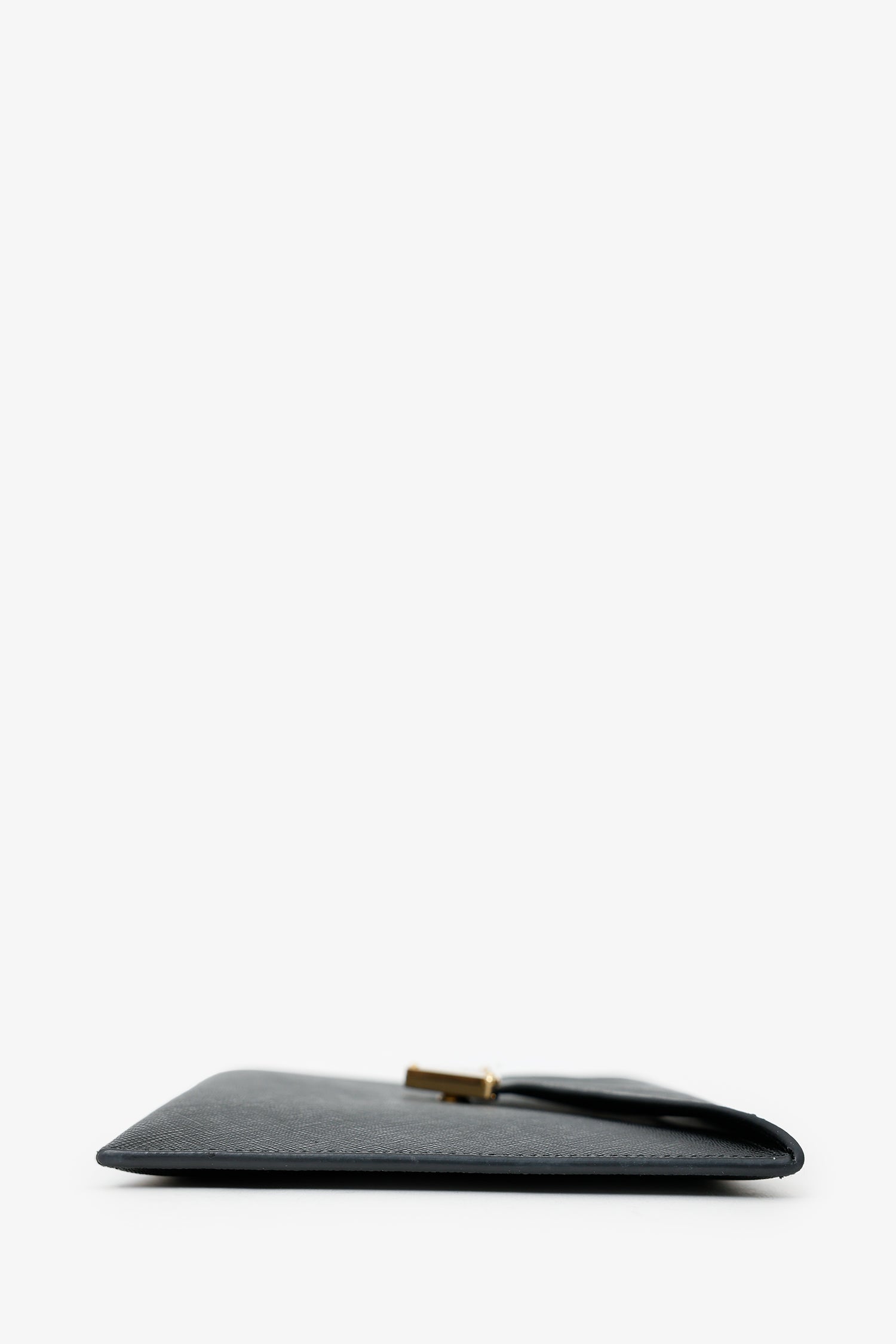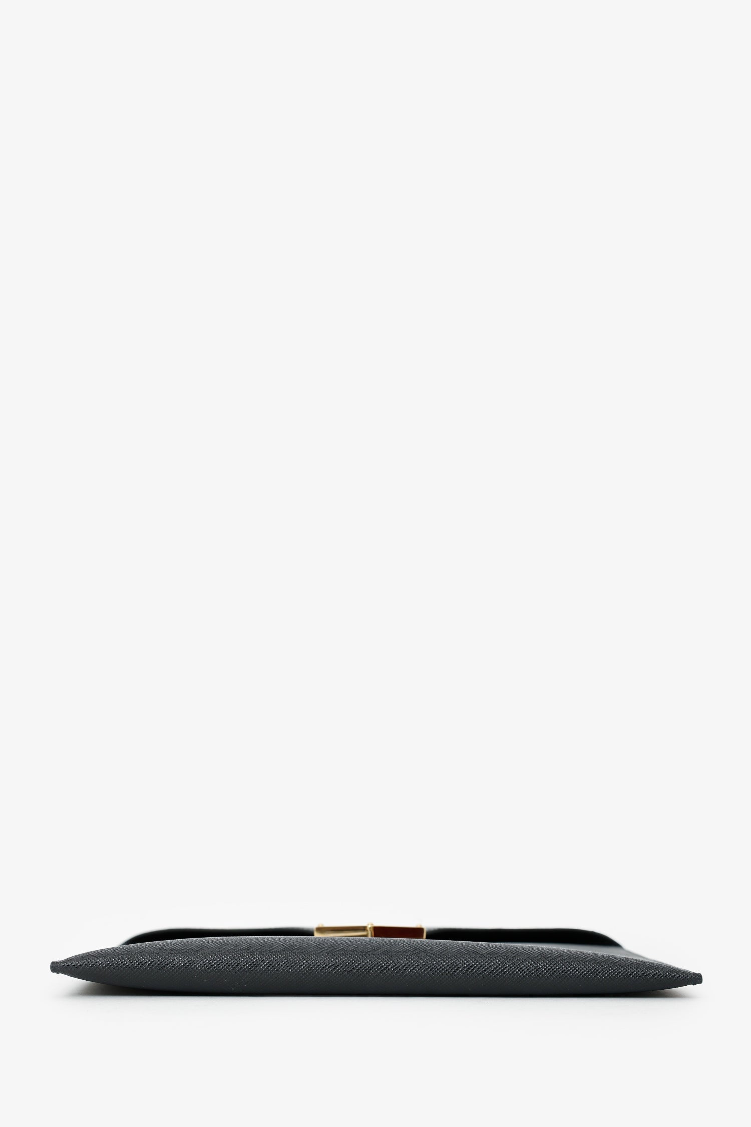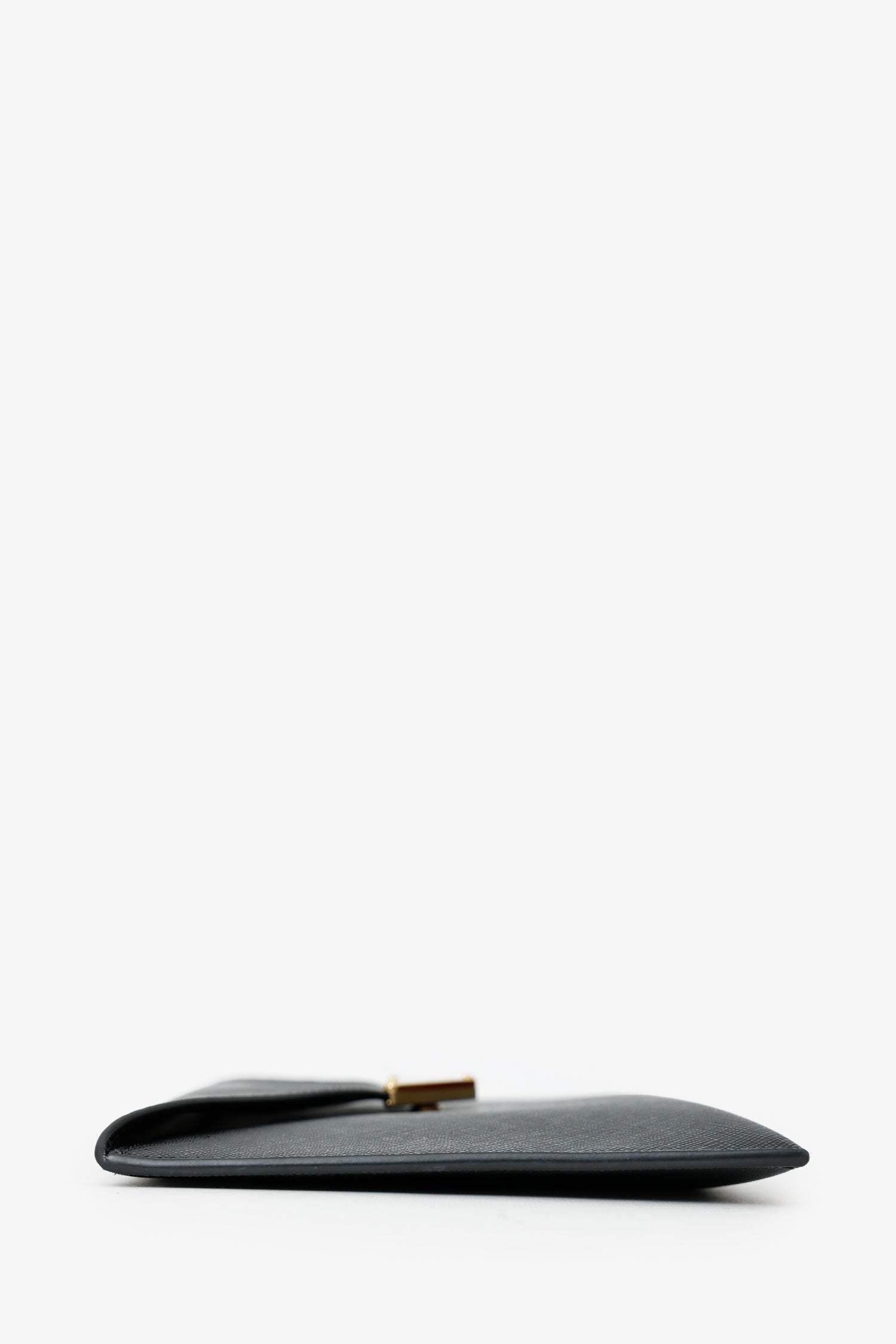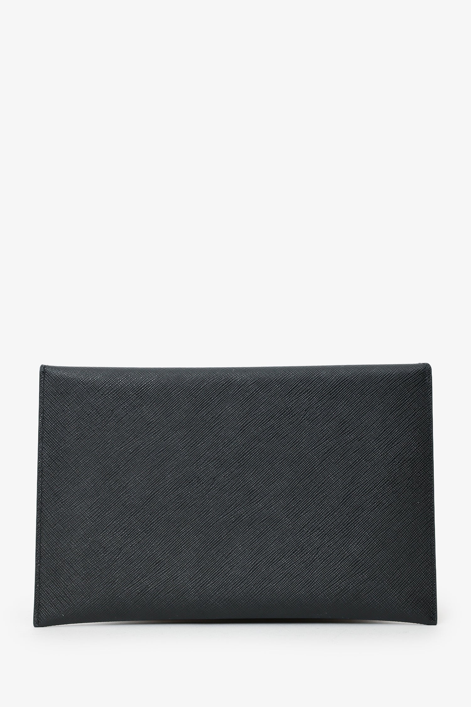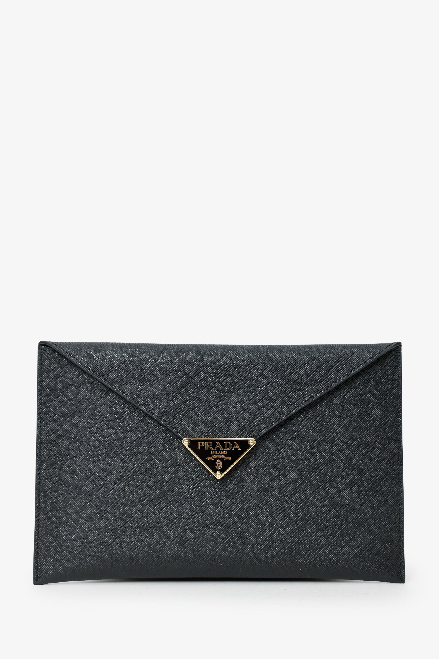 Prada Black Saffiano Leather Envelope Clutch. Front fold-over flap with snap-button-up closure. Leather-lined interior with 3 rear card slots. Gold-tone hardware. Tonal stitching.