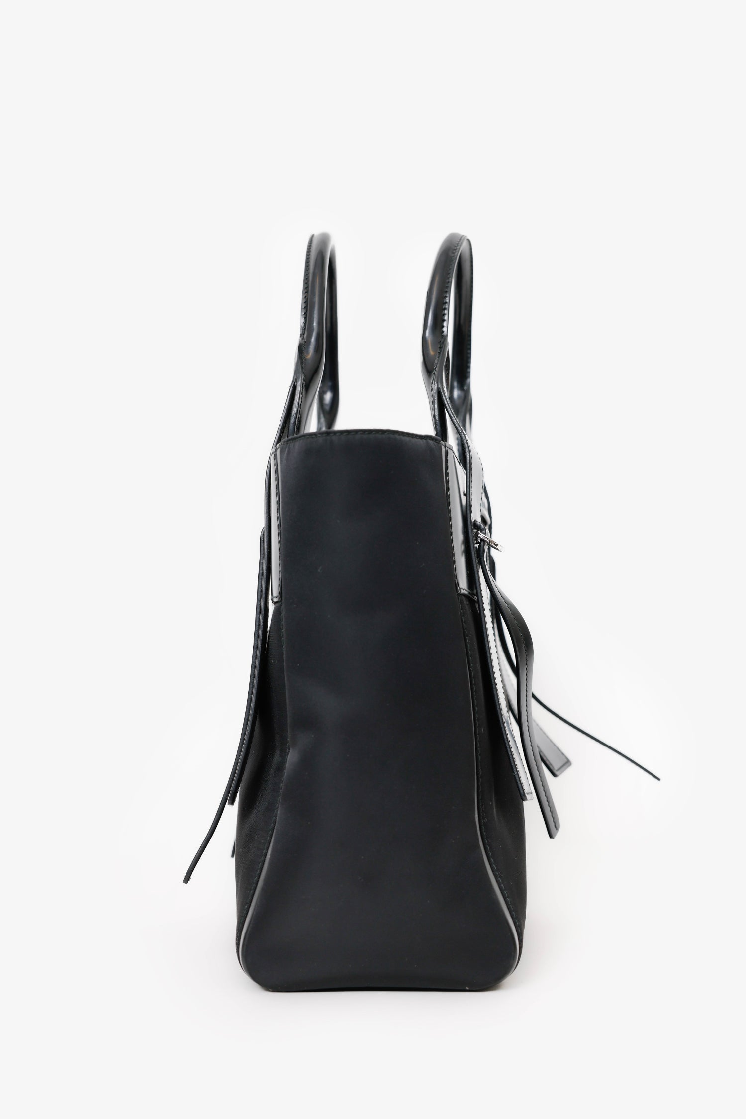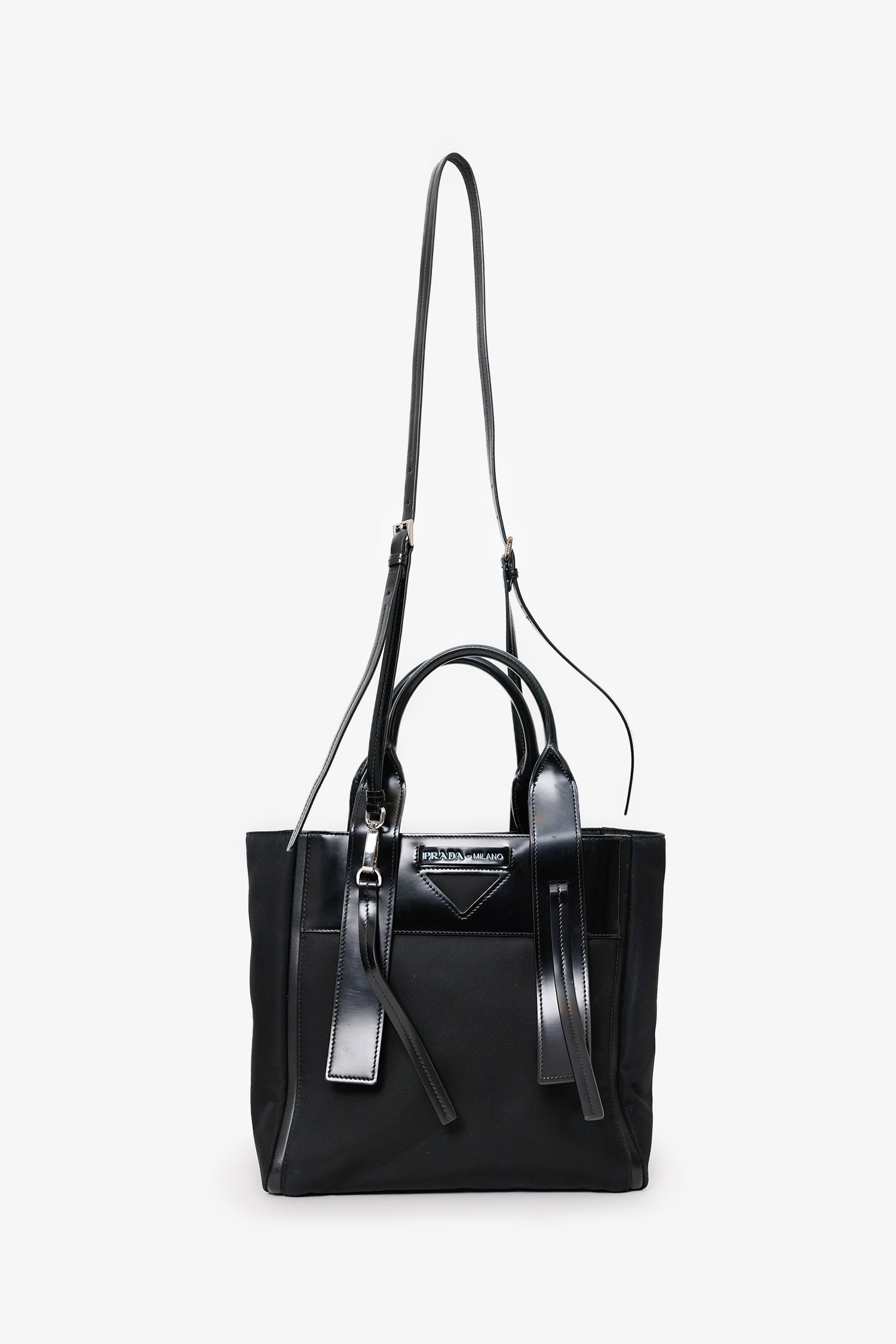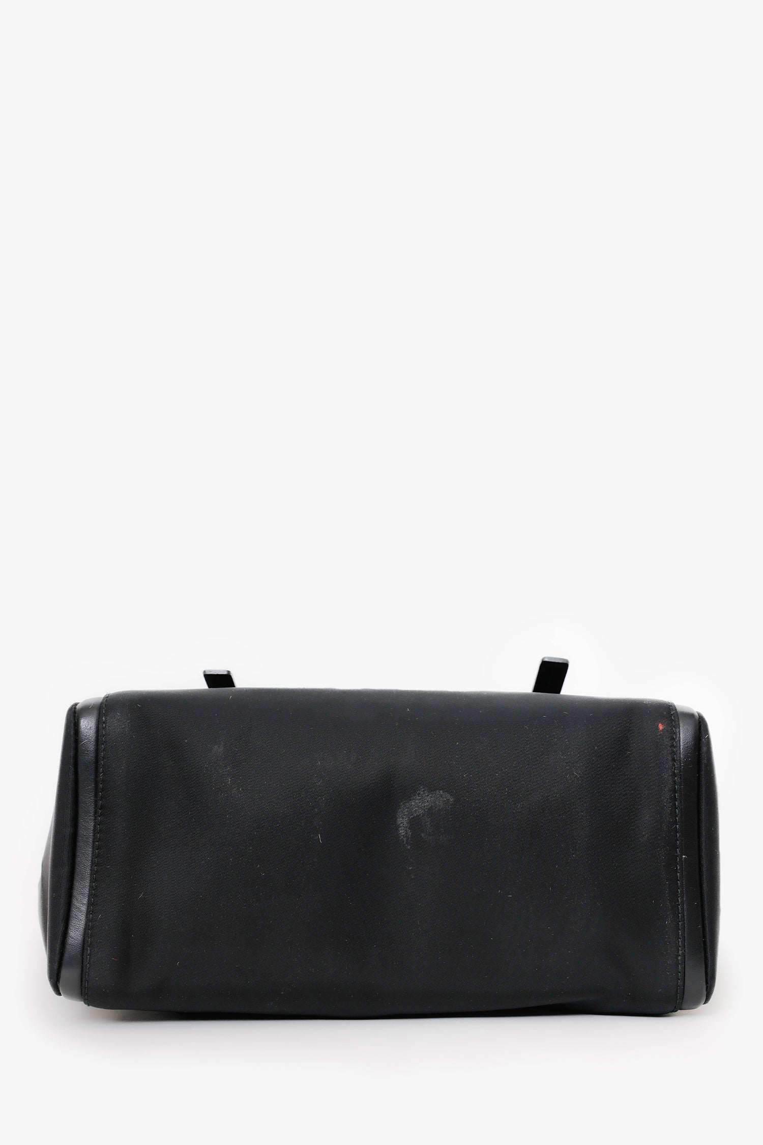 Prada Black Tessuto Nylon Small Ouverture Bag With Strap. Top zip closure. Twin top handles. Removable strap with adjustable buckle closure. Lined interior. Single interior zip pocket. Silver-tone hardware. Tonal stitching.