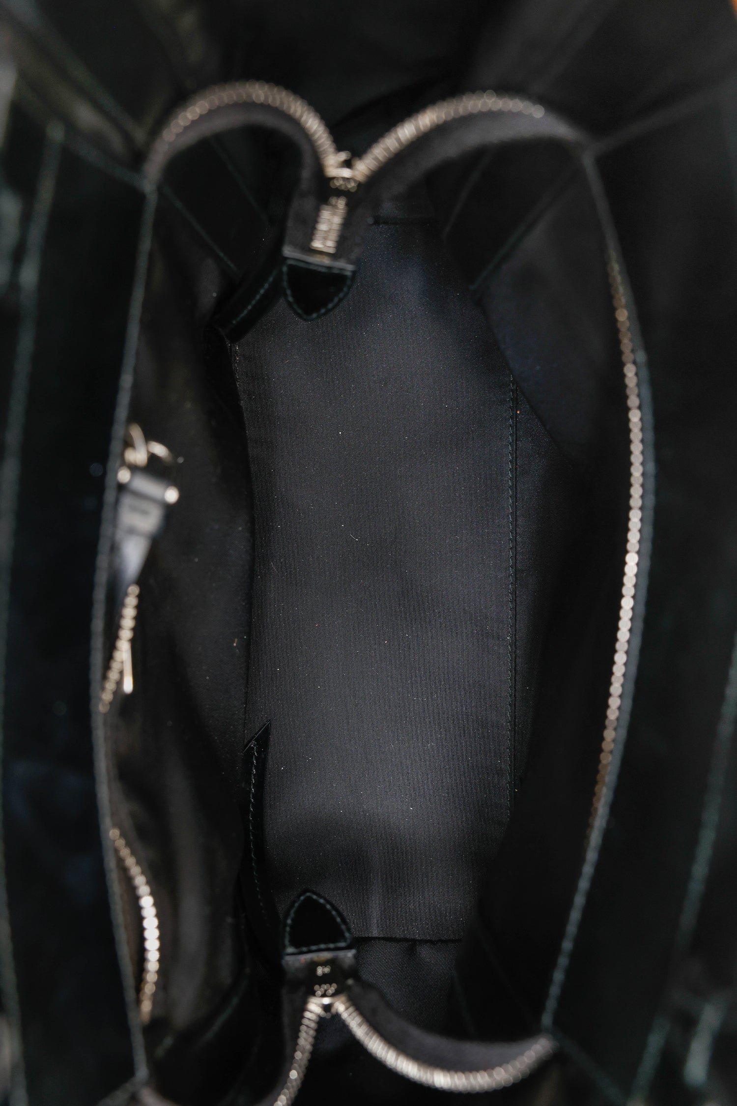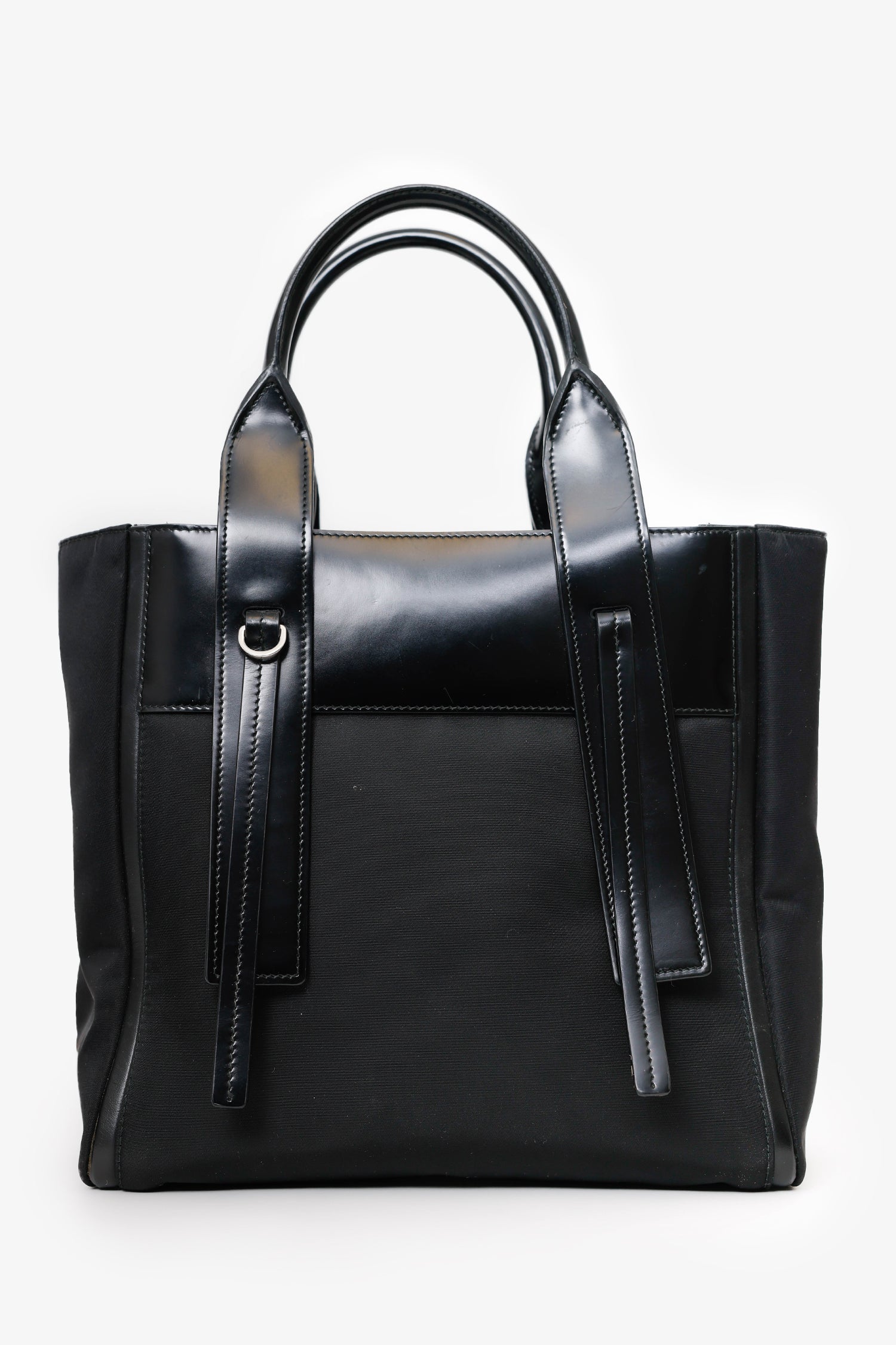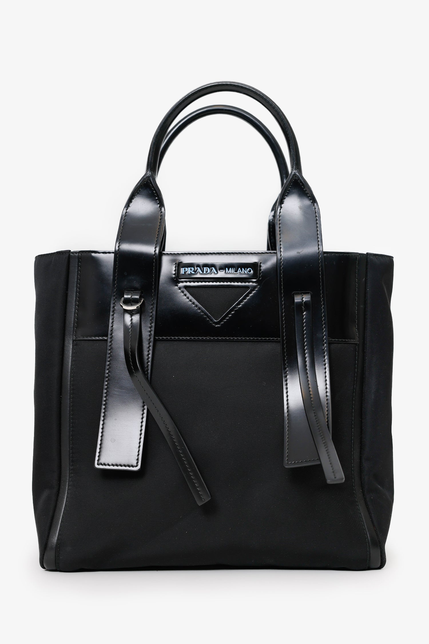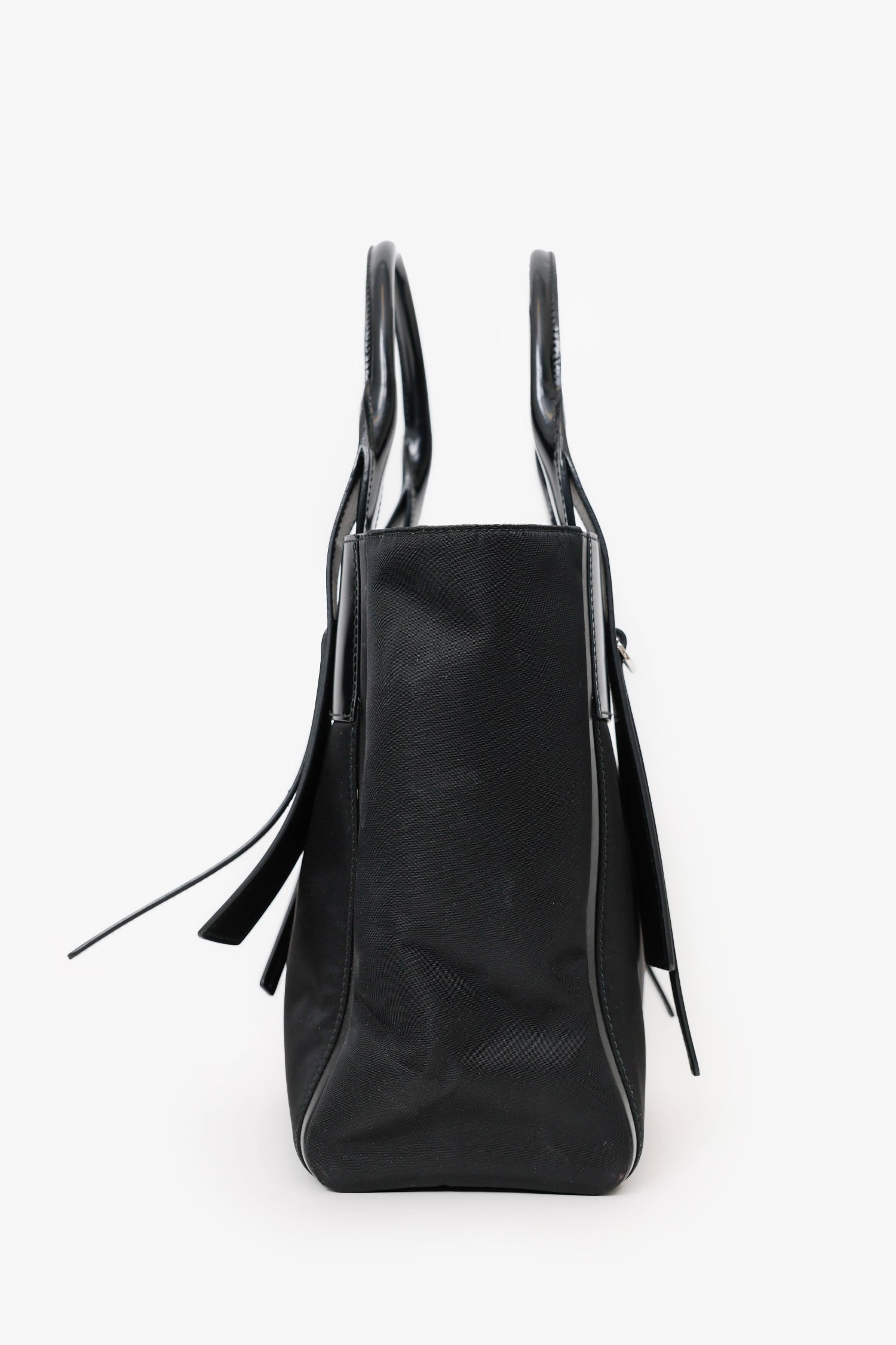 Prada Black Tessuto Nylon Small Ouverture Bag With Strap. Top zip closure. Twin top handles. Removable strap with adjustable buckle closure. Lined interior. Single interior zip pocket. Silver-tone hardware. Tonal stitching.