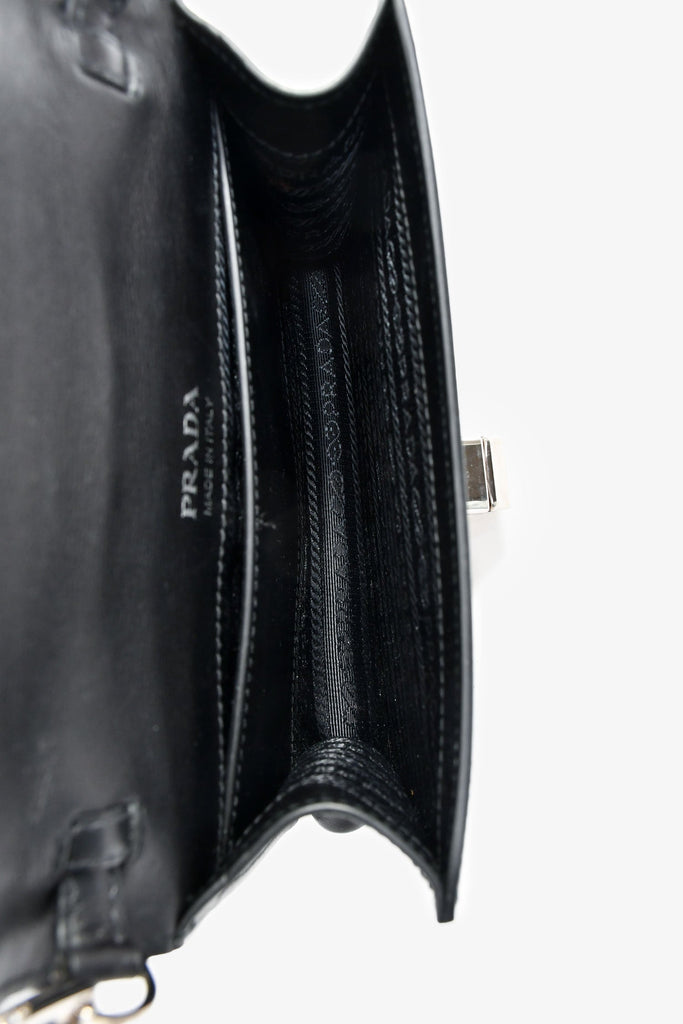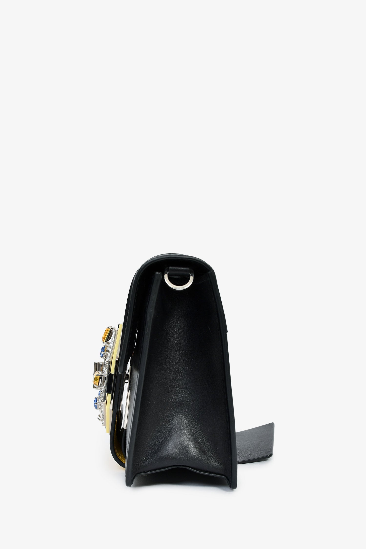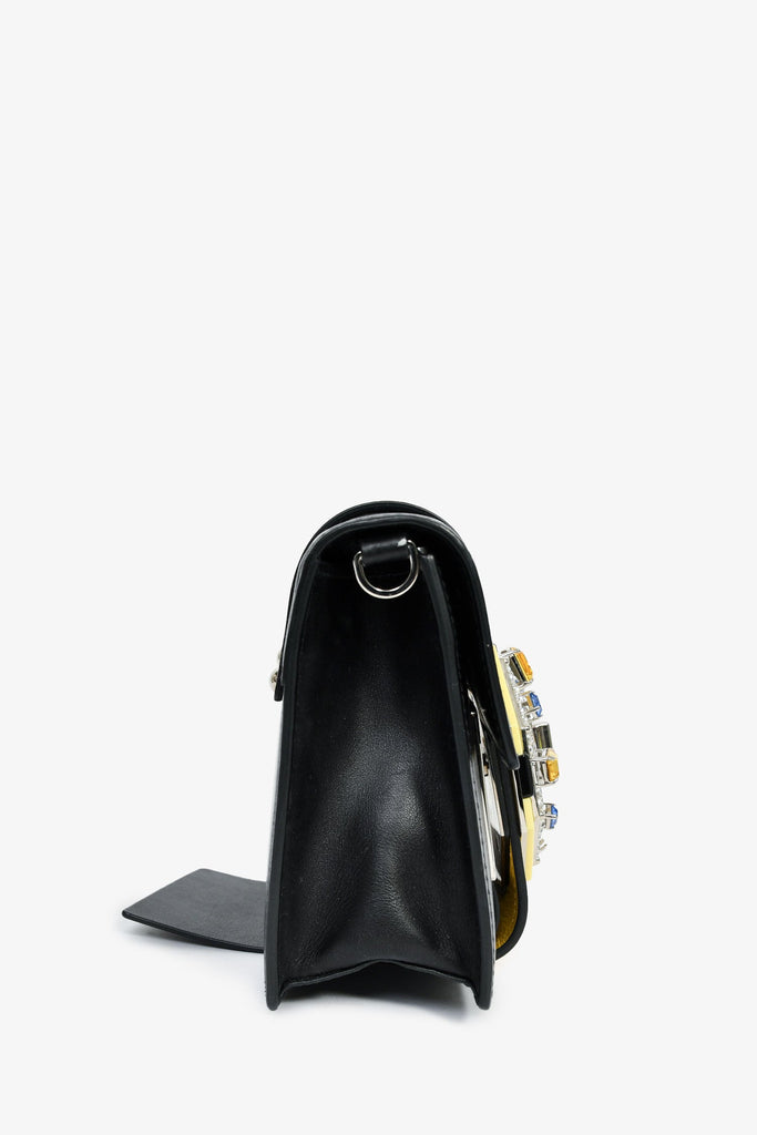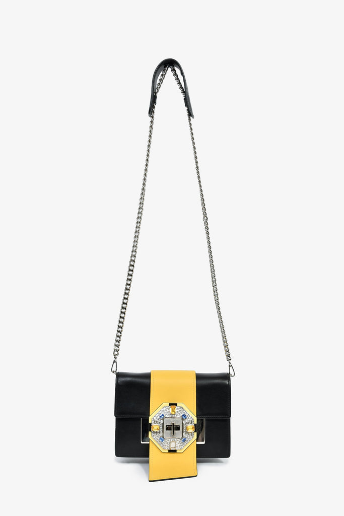 Prada Black/Yellow Leather City Calf Embellished Ribbon Chain Bag. Front fold-over flap with turn-lock closure. Chain-link shoulder strap. Lined interior with a slip compartment. Tonal stitching.